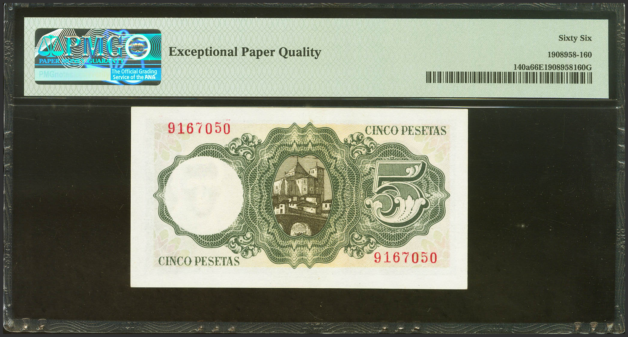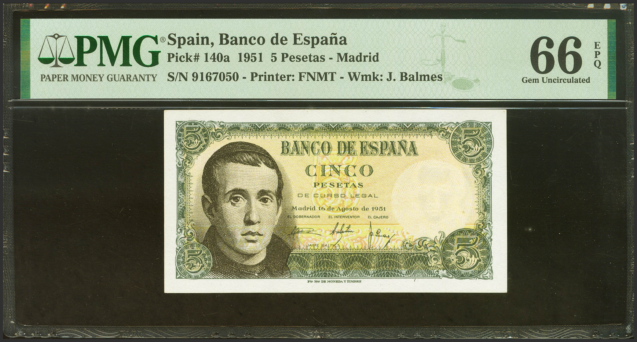5 Pesetas. 16 de Agosto de 1951. Sin serie. (Edifil 2023: 459, Pick: 140a). Inusual en esta calidad, apresto original. SC. Encapsulado PMG66EPQ.