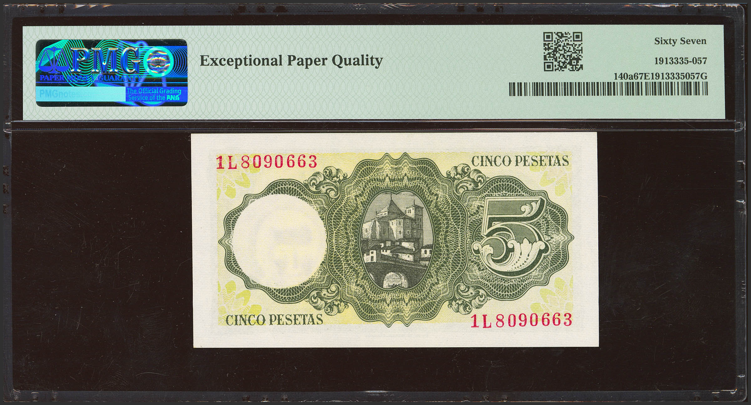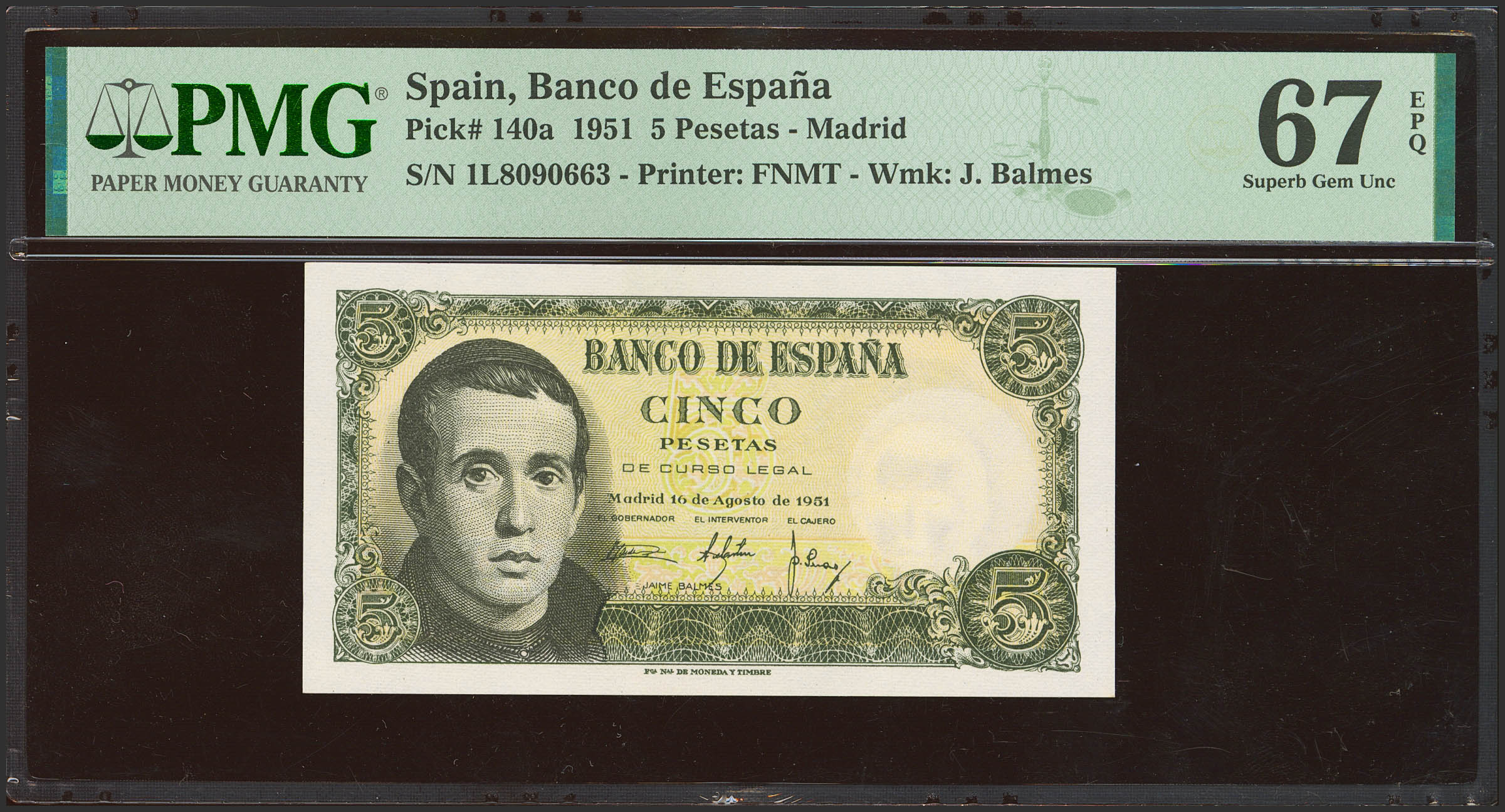 5 Pesetas. 16 de Agosto de 1951. Serie 1L, última serie emitida. (Edifil 2023: 459b, Pick: 140a). Inusual en esta excepcional calidad, apresto original. SC. Encapsulado PMG67EPQ.