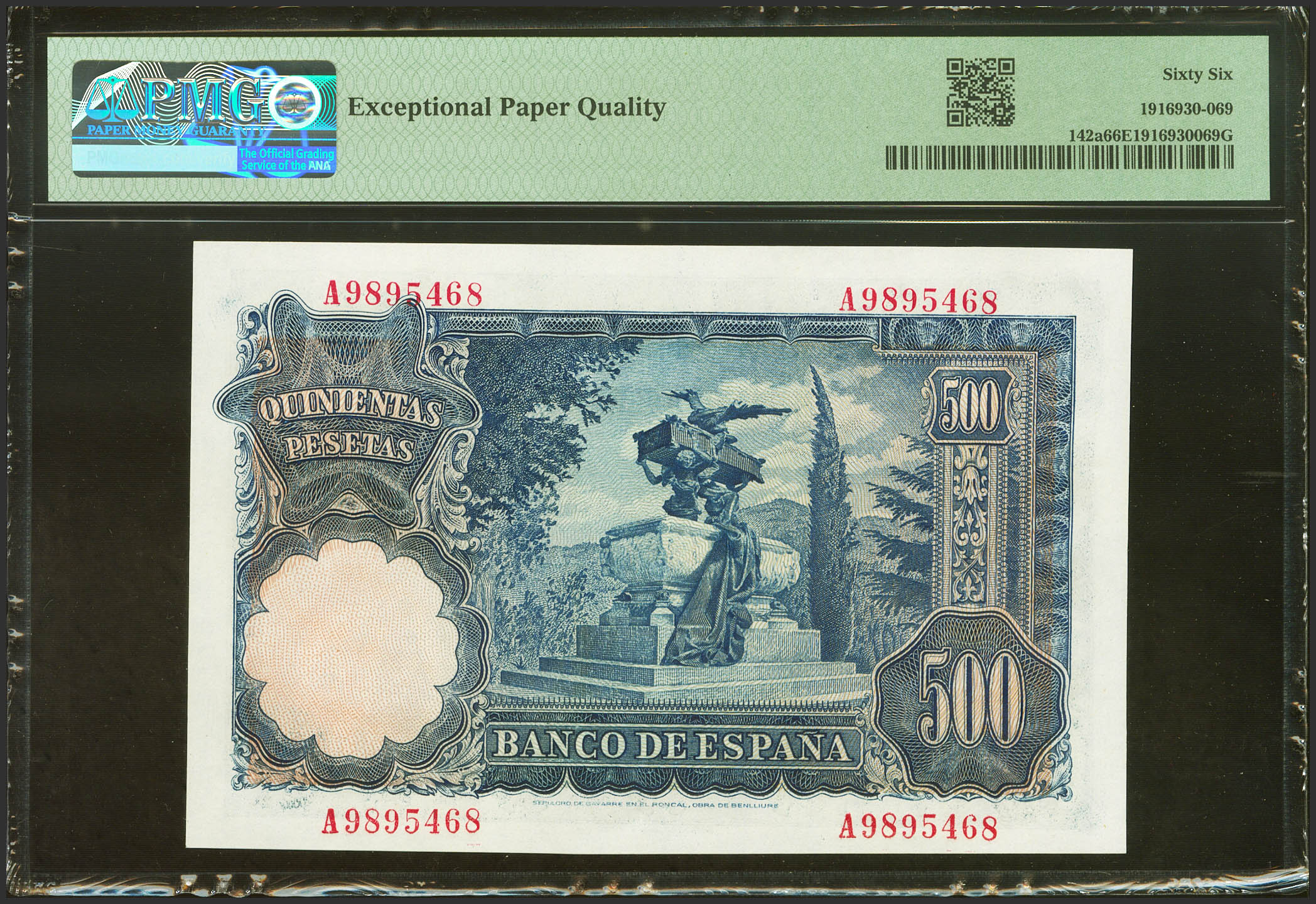 500 Pesetas. 15 de Noviembre de 1951. Serie A. (Edifil 2023: 460a). Inusual en esta calidad, conserva todo su apresto original. SC. Encapsulado PMG66EPQ.