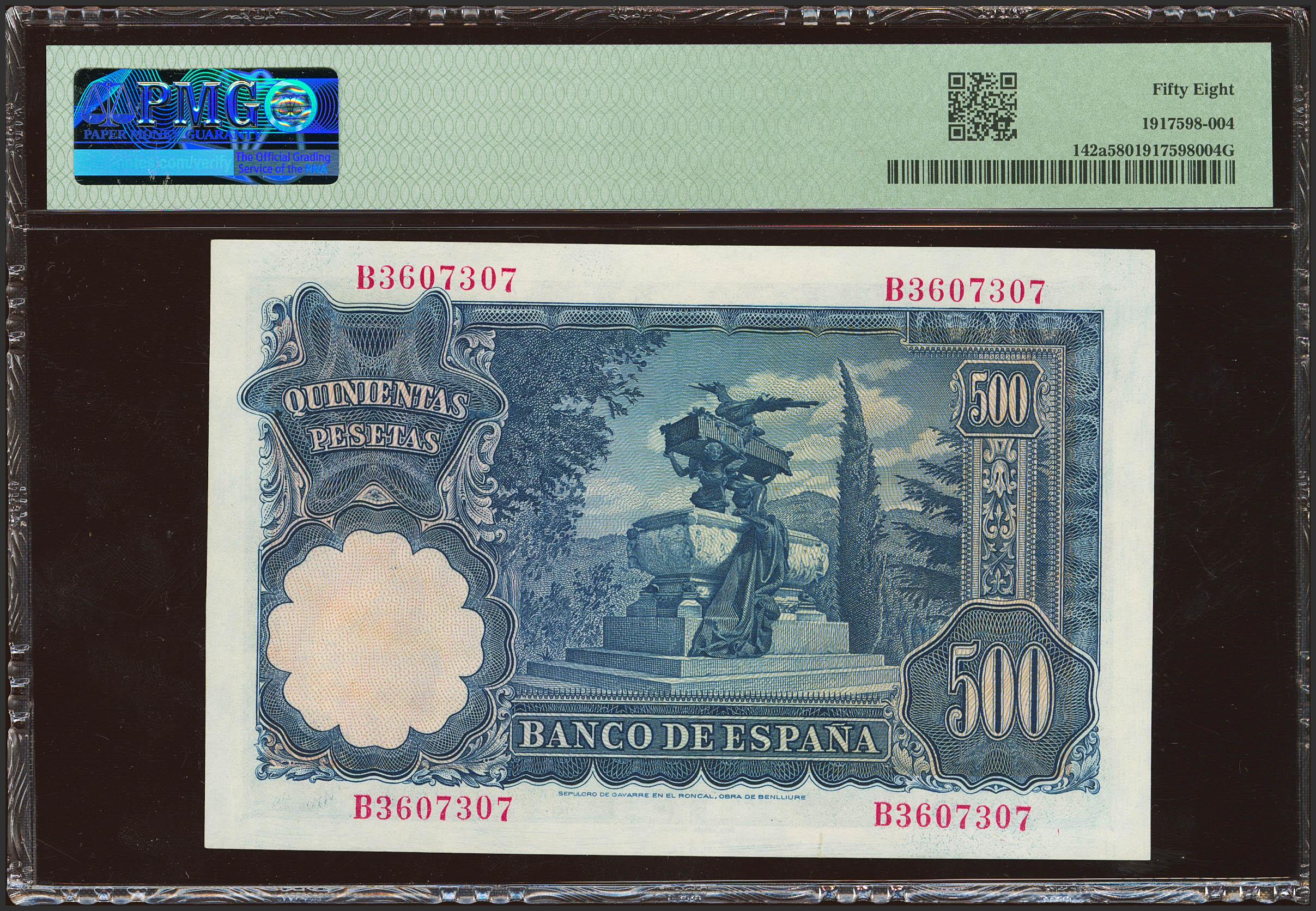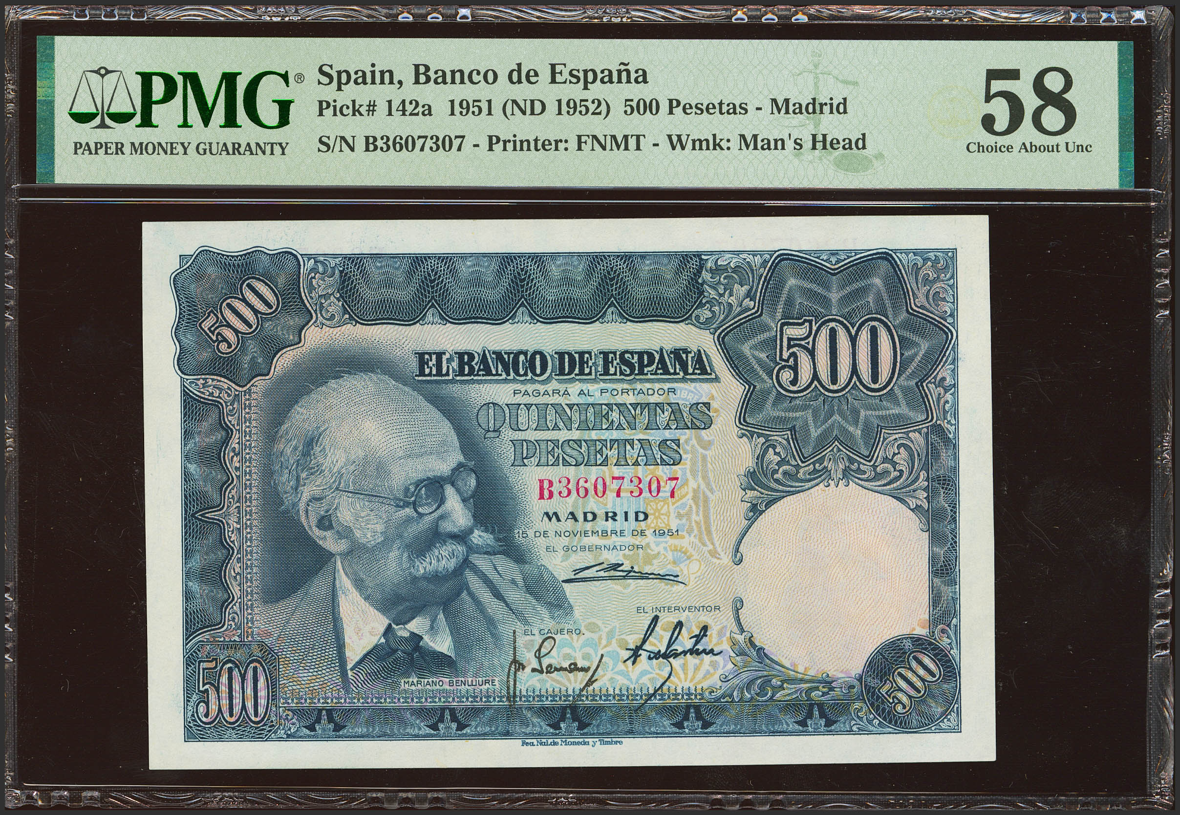 500 Pesetas. 15 de Noviembre de 1951. Serie B. (Edifil 2021: 460a, Pick: 142a). EBC++. Encapsulado PMG58.
