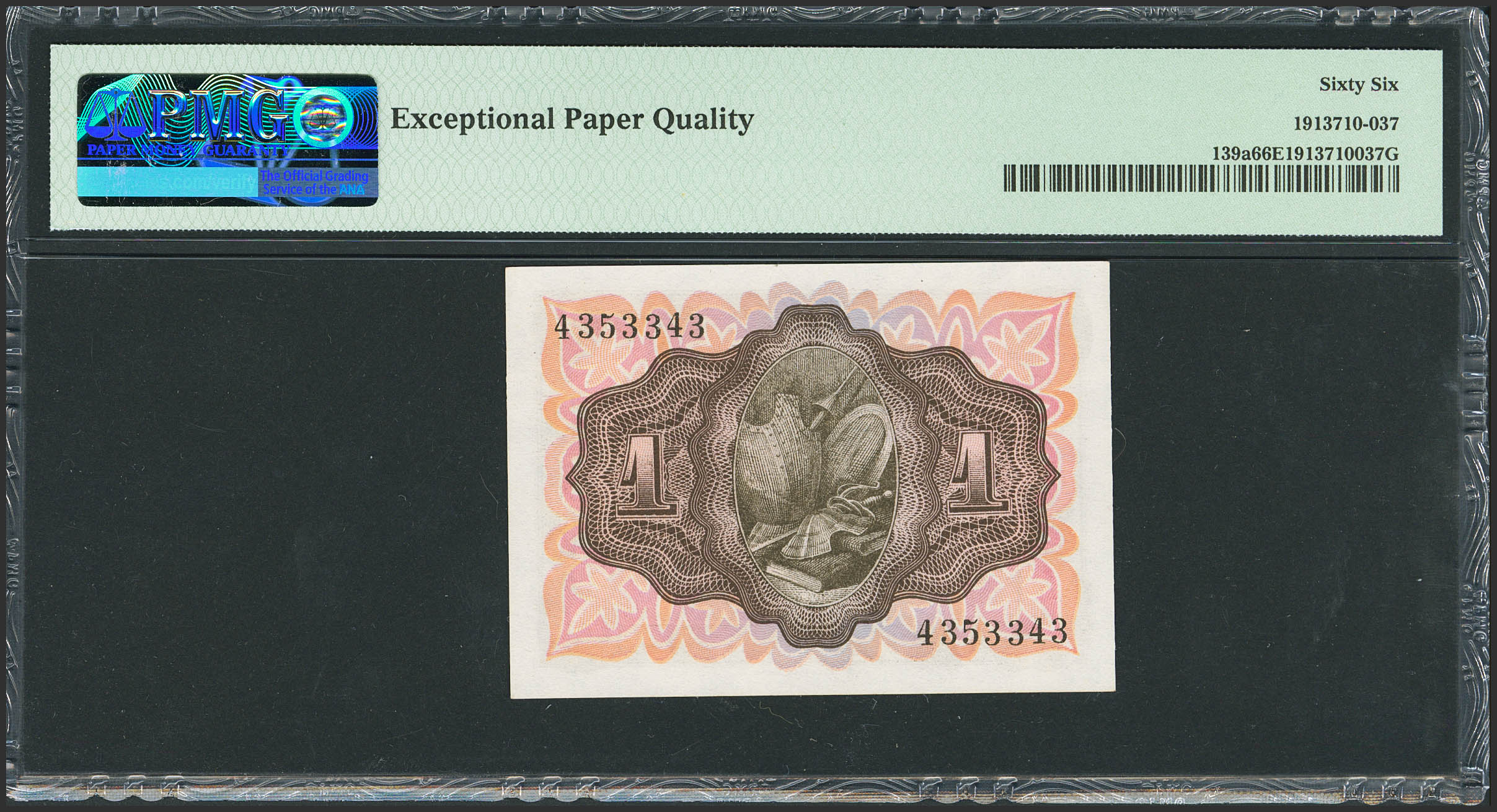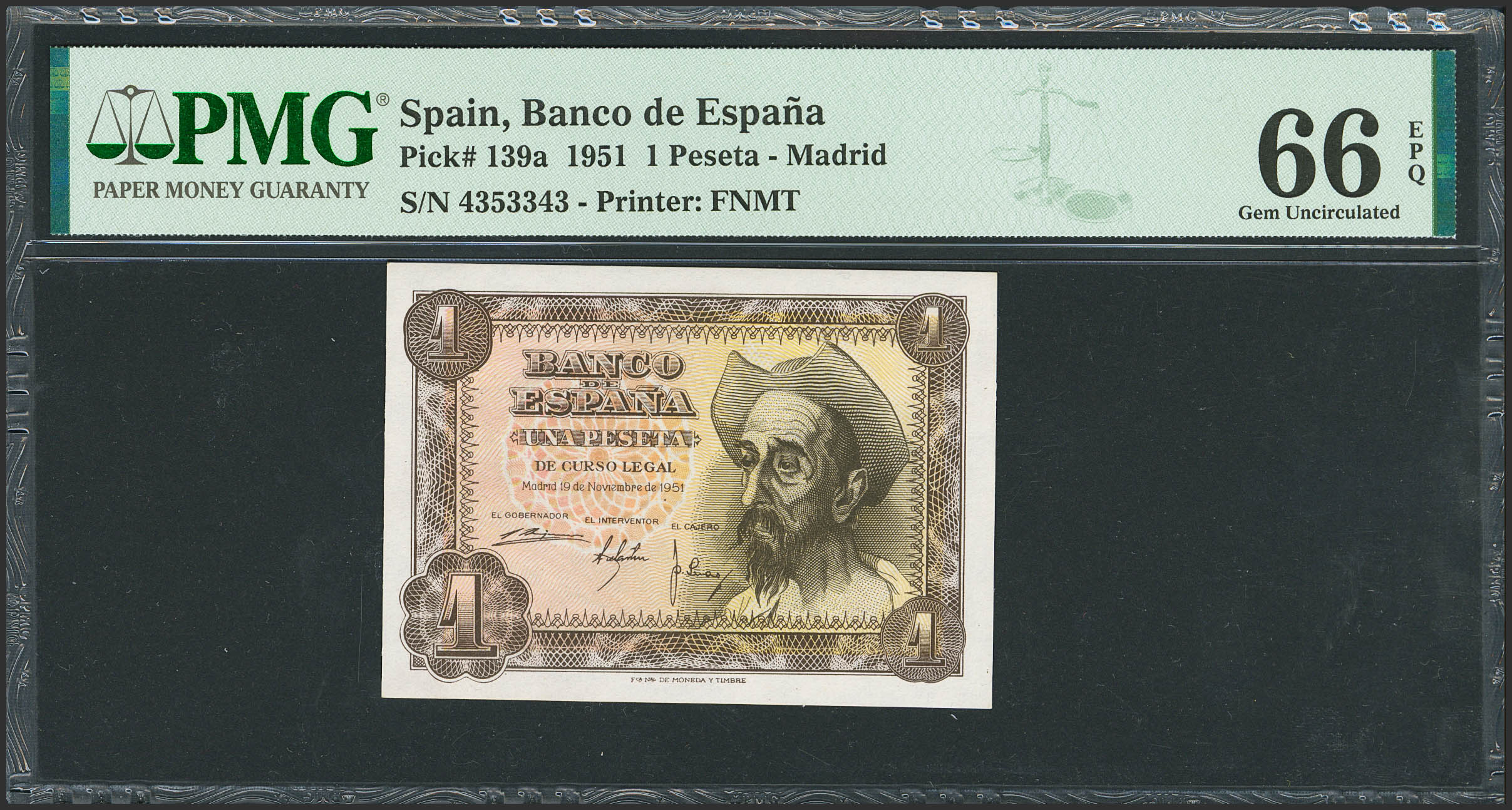 1 Peseta. 19 de Noviembre de 1951. Sin serie. (Edifil 2021: 461, Pick: 139a). Inusual en esta calidad, apresto original. SC. Encapsulado PMG66EPQ.
