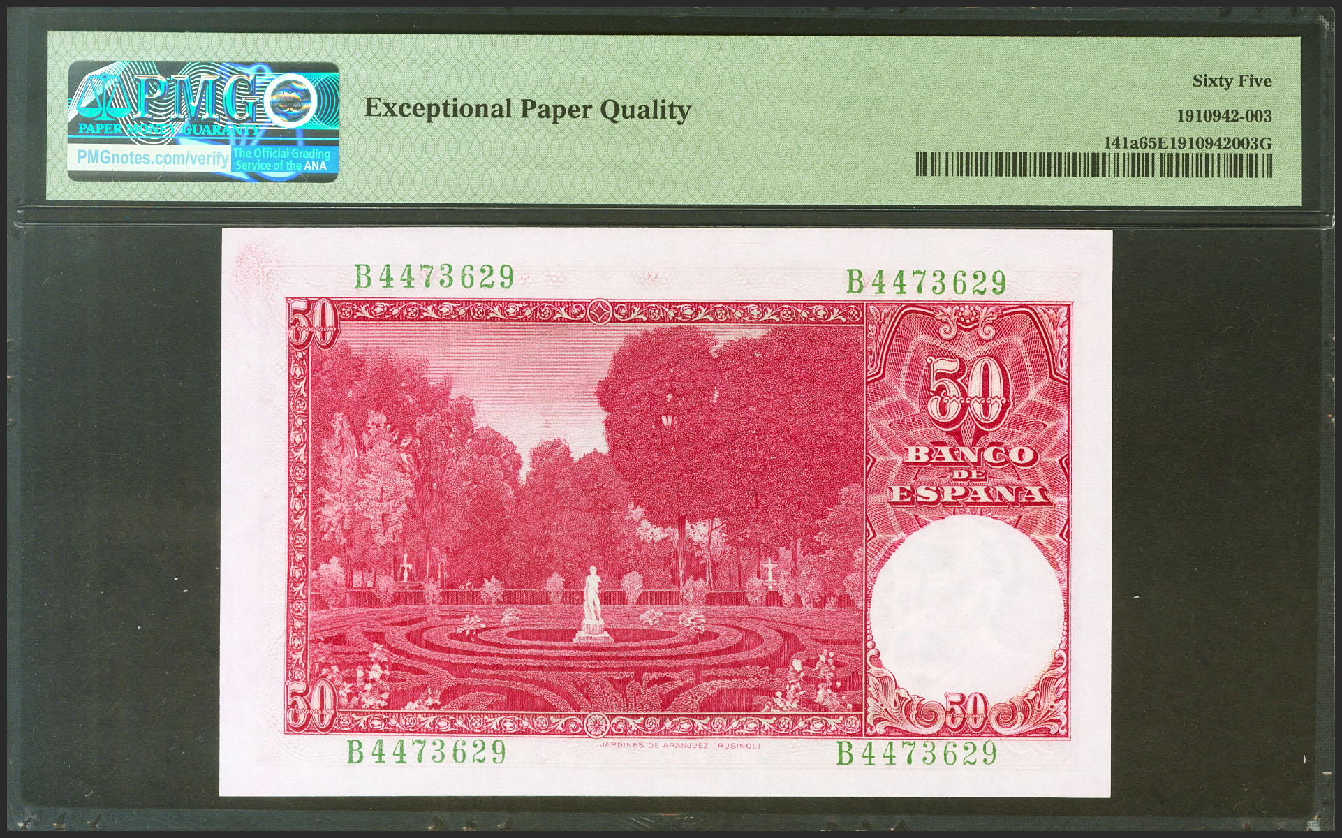 50 Pesetas. 31 de Diciembre de 1951. Serie B. (Edifil 2021: 462a, Pick: 141a). Inusual en esta calidad, apresto original. SC. Encapsulado PMG65EPQ.