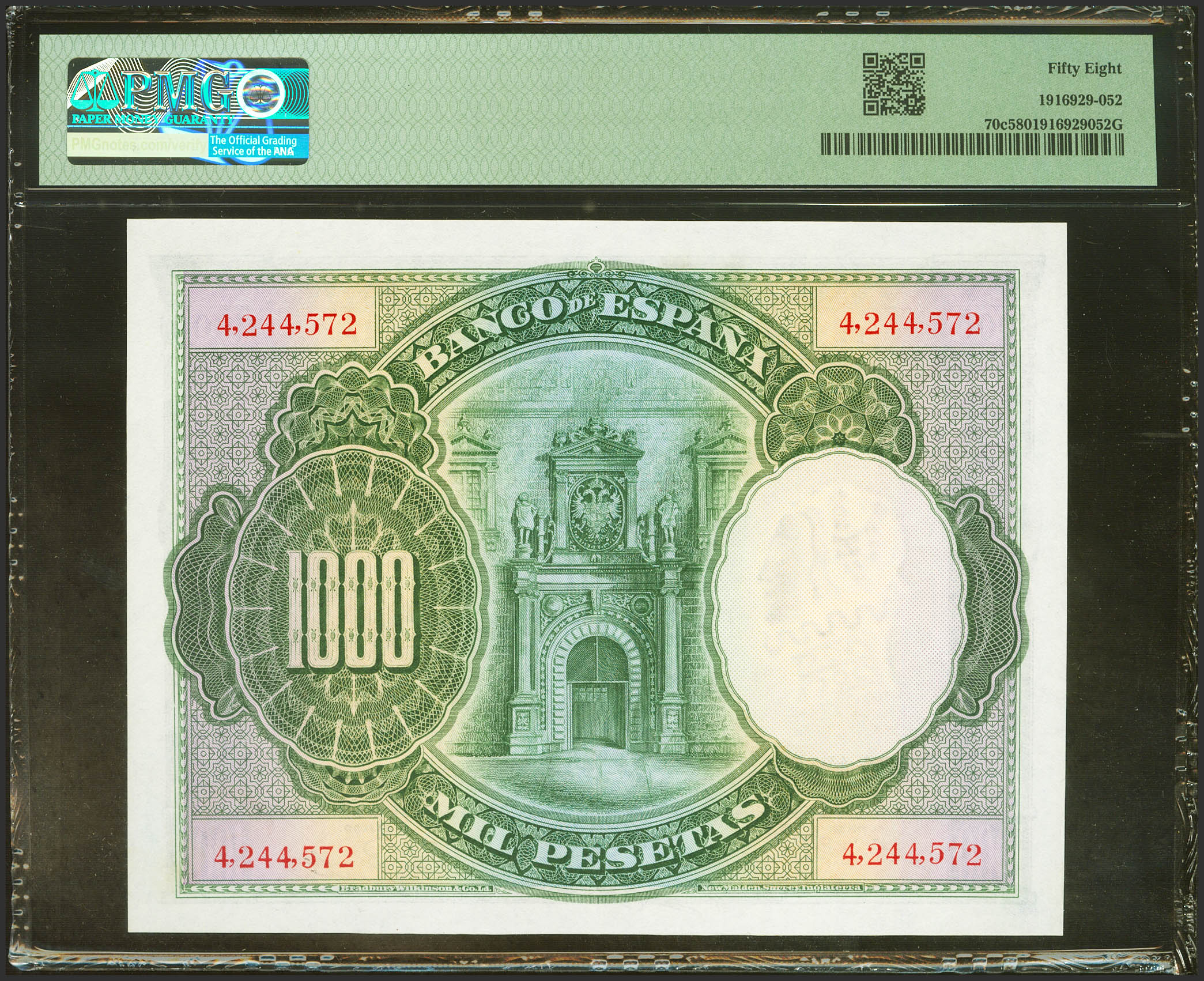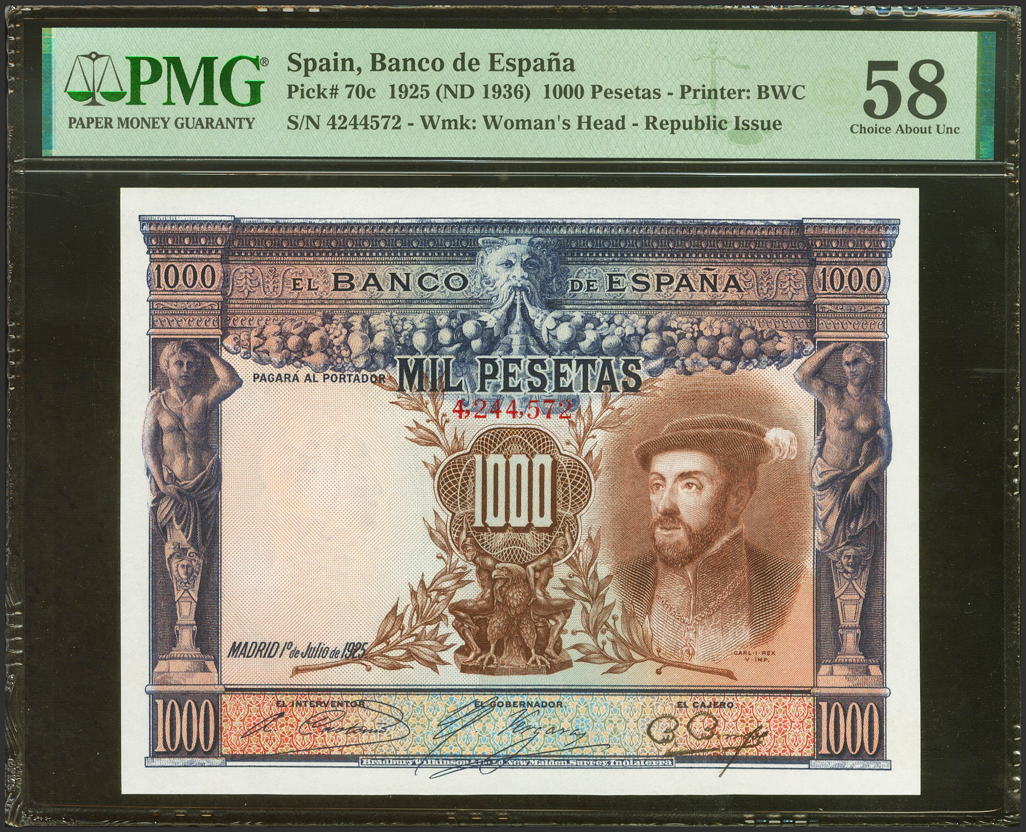 1000 Pesetas. 1 de Julio de 1925. Sin serie y numeración superior al 3646000. (Edifil 2023: 351, Pick: 70c). Inusual en esta calidad. EBC++. Encapsulado PMG58.