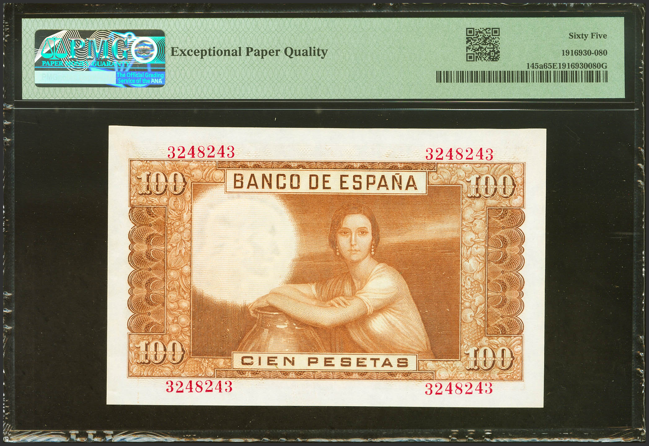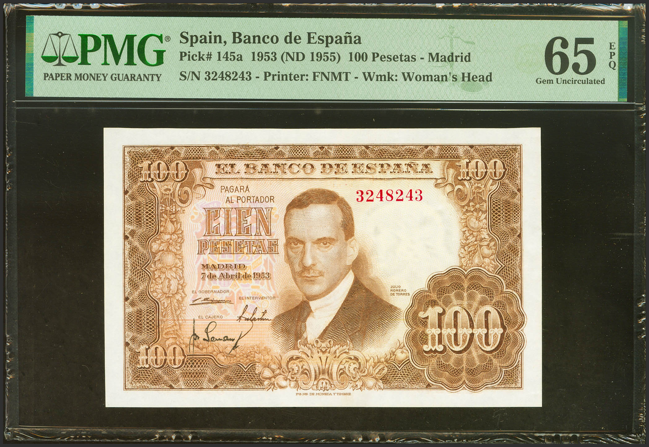 100 Pesetas. 7 de Abril de 1953. Sin serie. (Edifil 2023: 464, Pick: 145a). Inusual en esta excepcional calidad, apresto original. SC. Encapsulado PMG65EPQ.