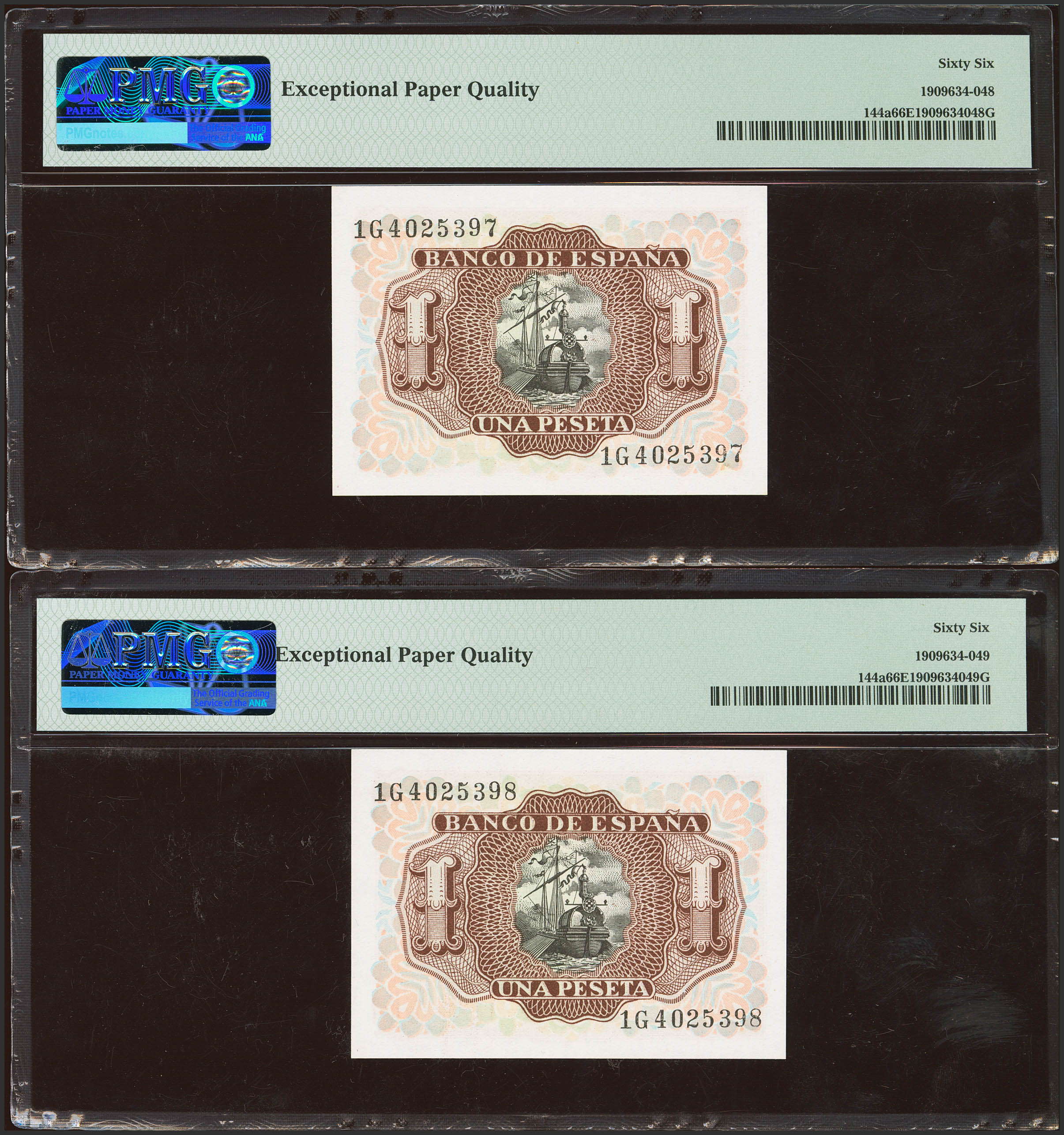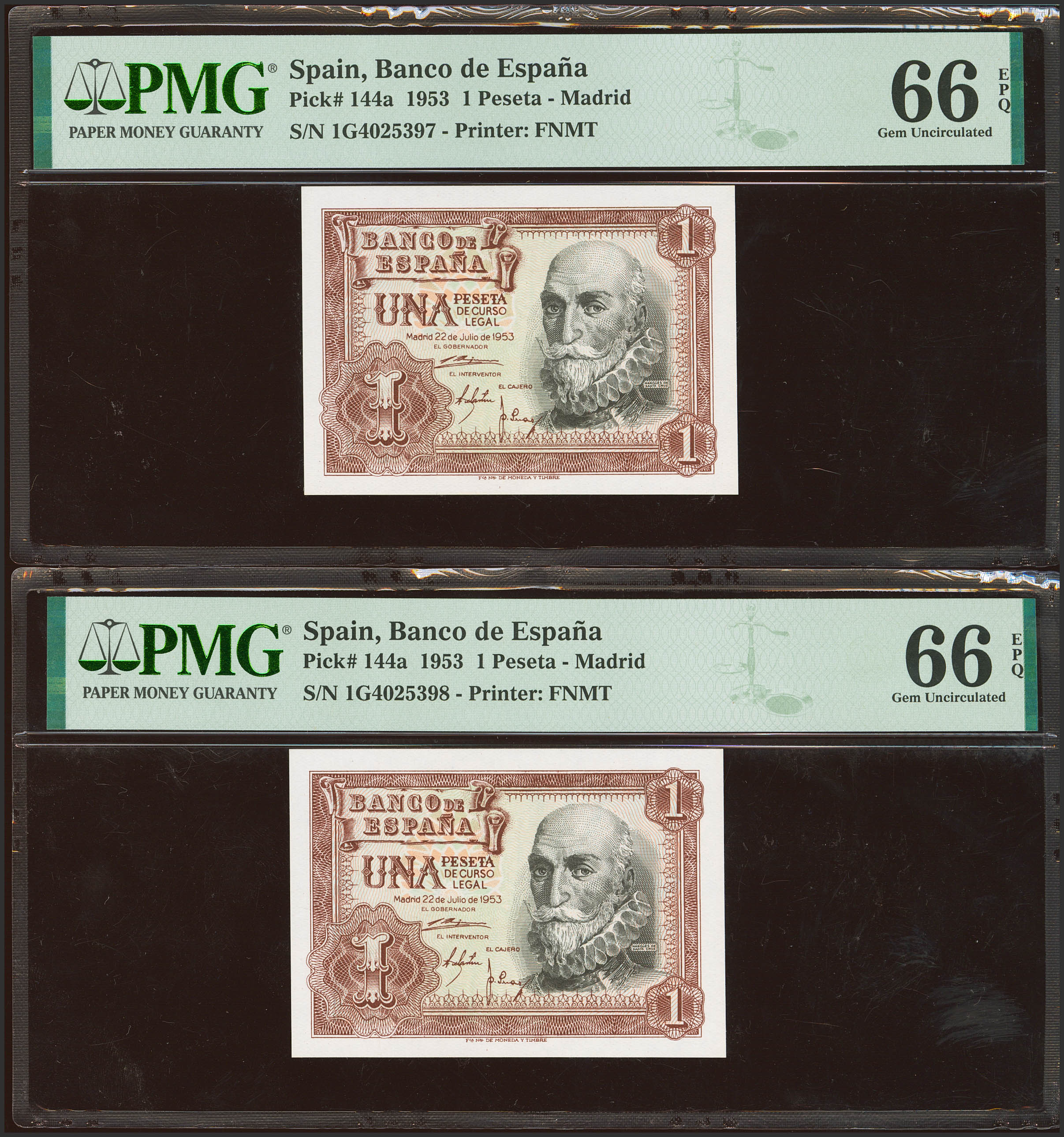 1 Peseta. 22 de Julio de 1953. Pareja correlativa. Serie 1G. (Edifil 2023: 465b, Pick: 144a). Apresto original. SC. Encapsulados PMG66EPQ, ambos.