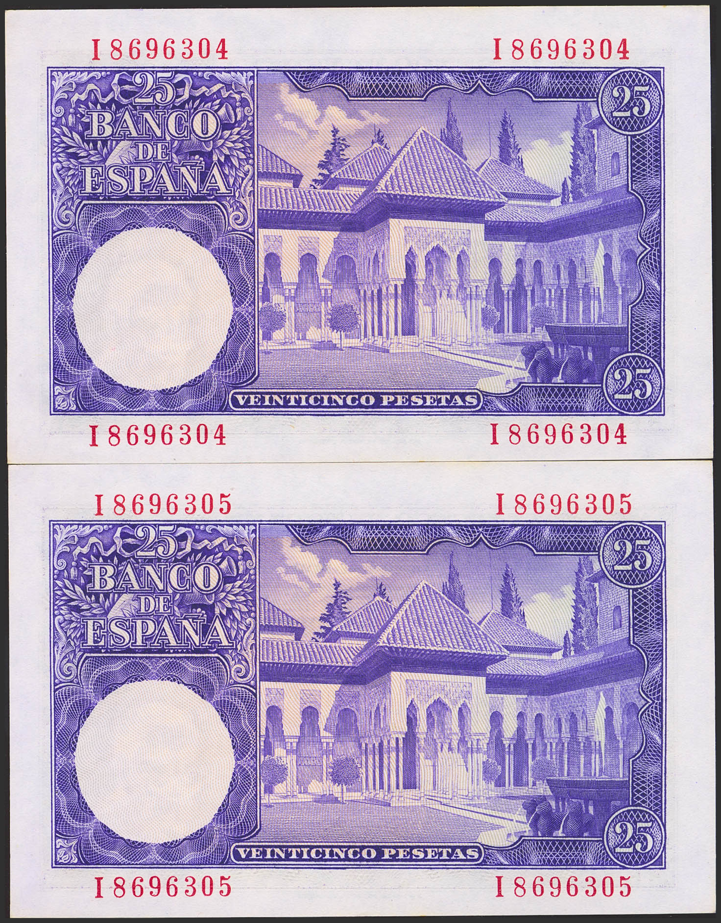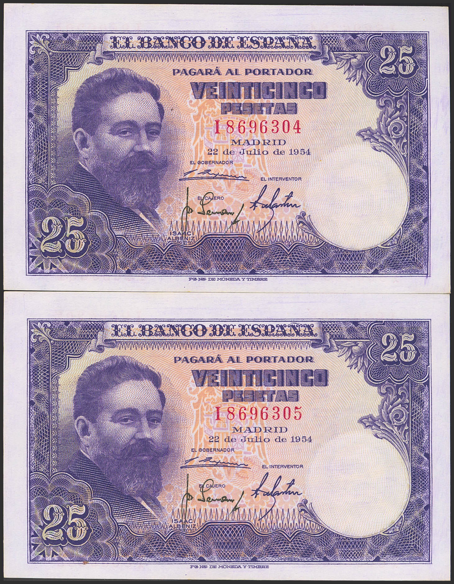 25 Pesetas. 22 de Julio de 1954. Pareja correlativa. Serie I. (Edifil 2023: 467a). Apresto original. SC.