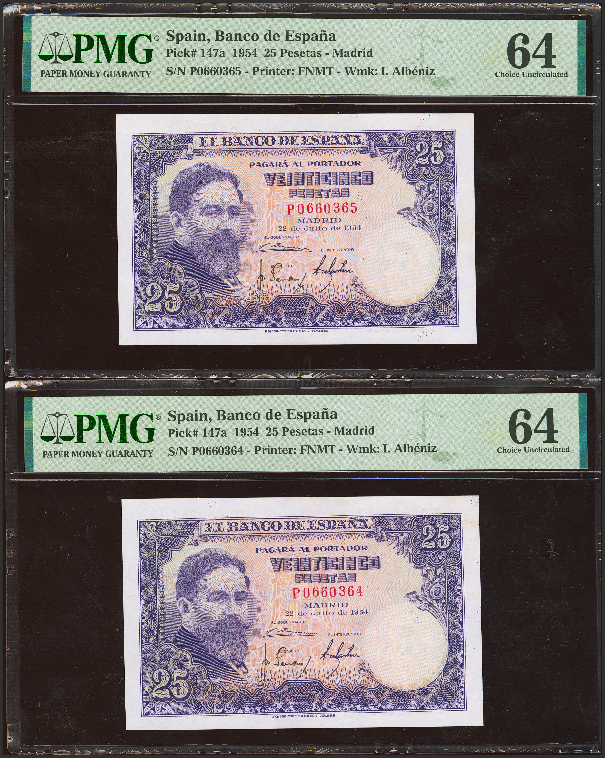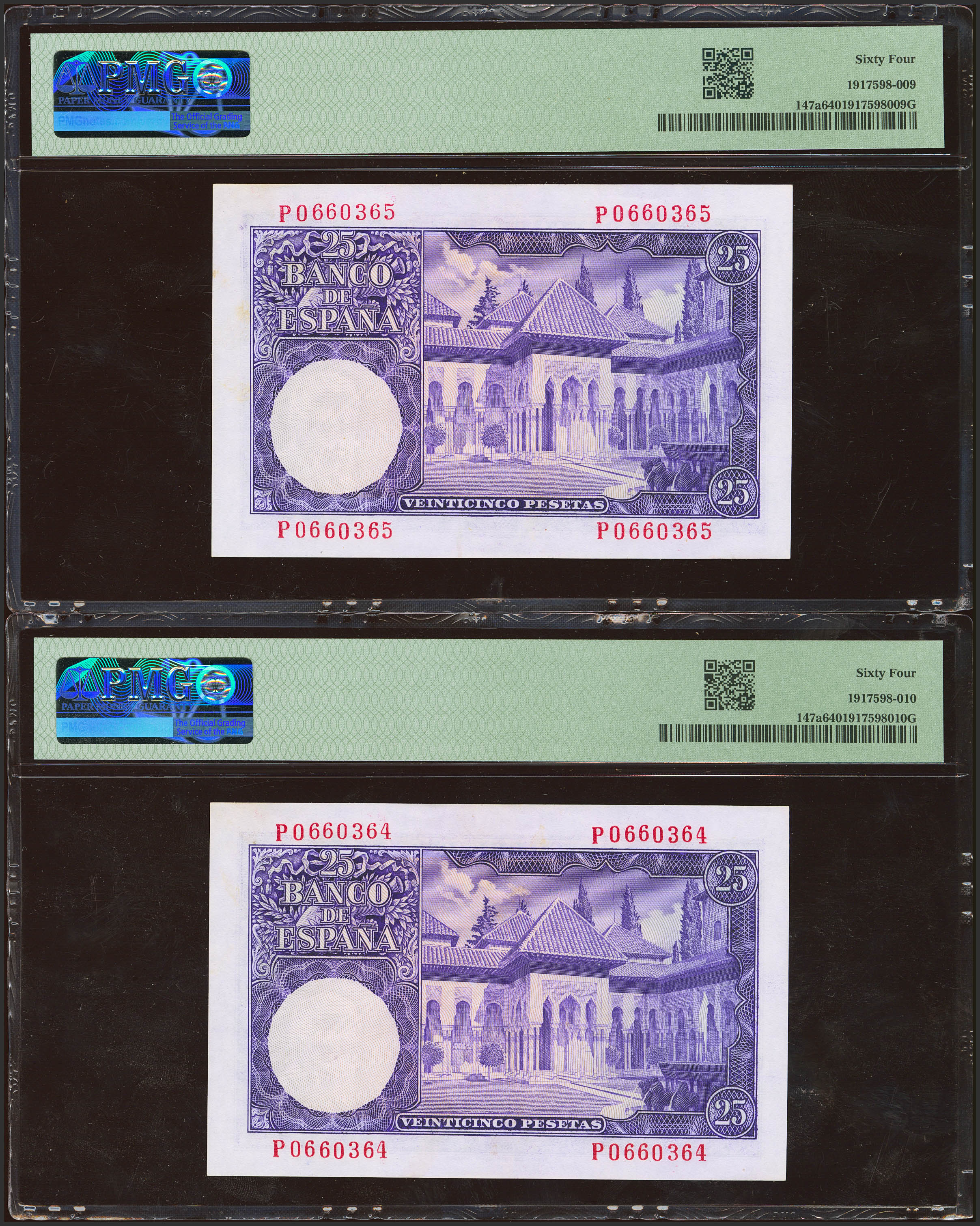 25 Pesetas. 22 de Julio de 1954. Pareja correlativa. Serie P, última serie emitida. (Edifil 2023: 467b, Pick: 147a). Pareja de extraordinaria rareza, especialmente en esta excepcional calidad. SC. Encapsulados PMG64, ambos.