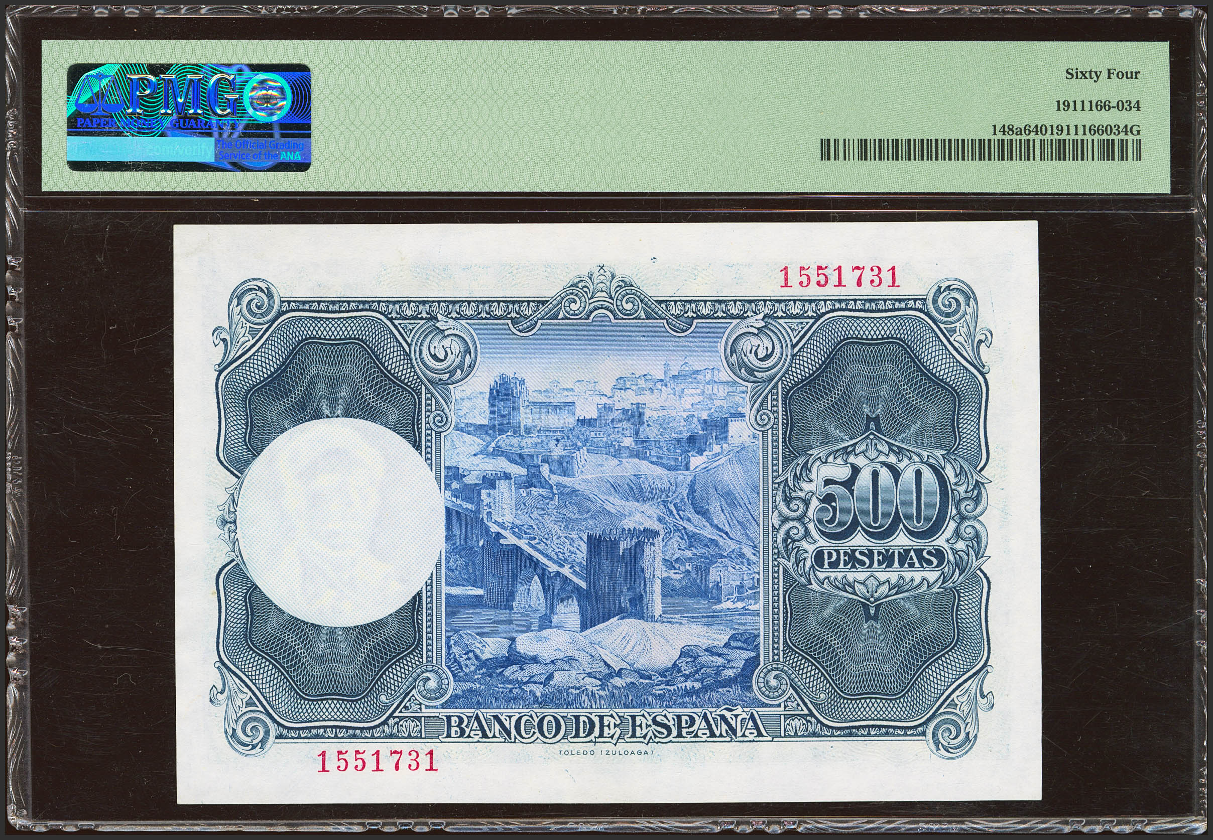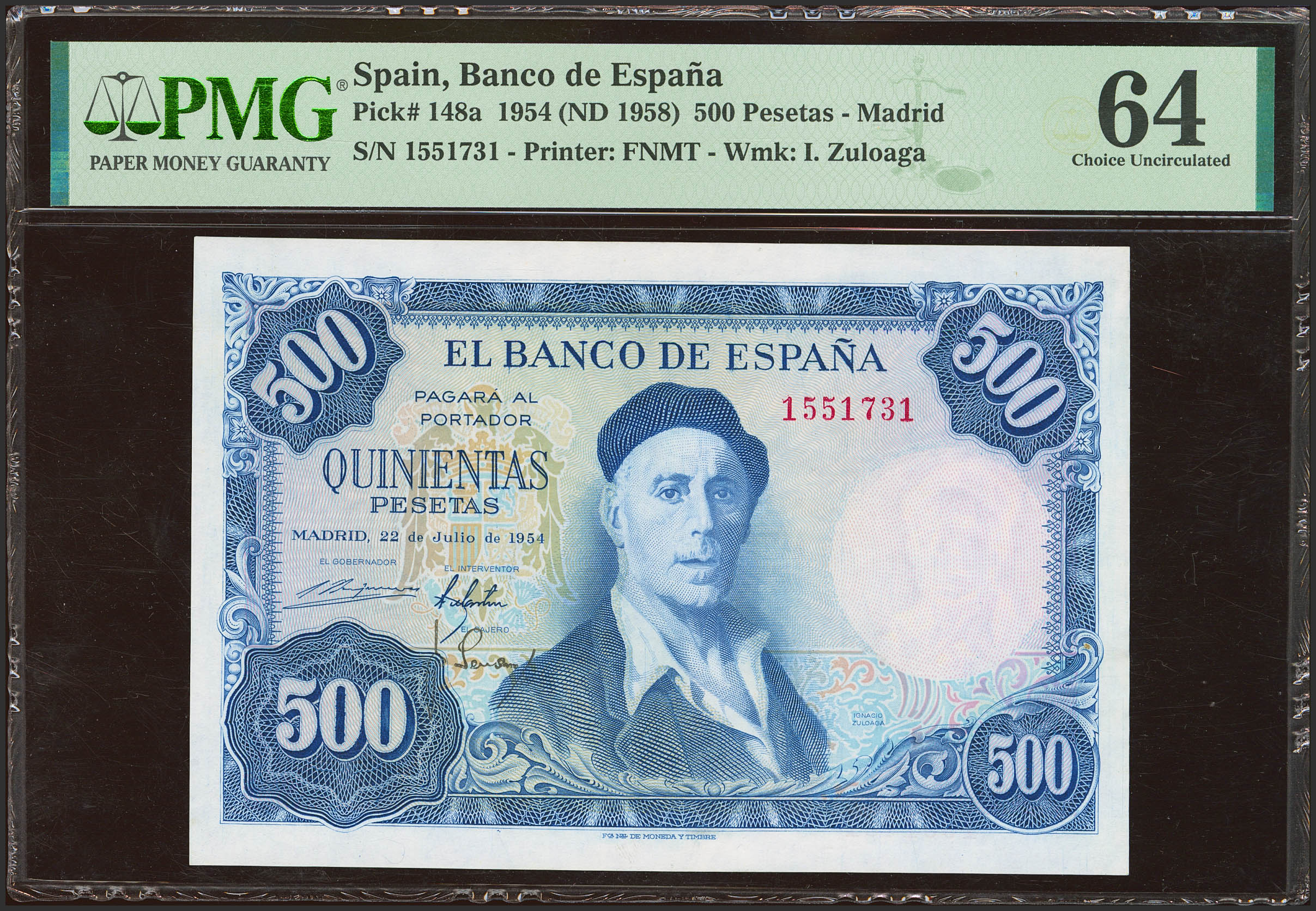 500 Pesetas. 22 de Julio de 1953. Sin serie. (Edifil 2023: 468, Pick: 148a). Raro en esta calidad. SC. Encapsulado PMG64.