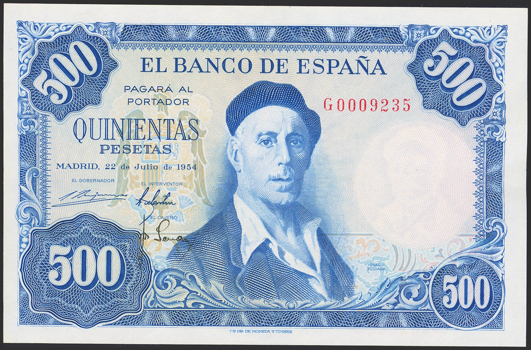 500 Pesetas. 22 de Julio de 1954. Serie G y numeración (0009235). (Edifil 2023: 468b). Conserva todo su apresto original. SC-.