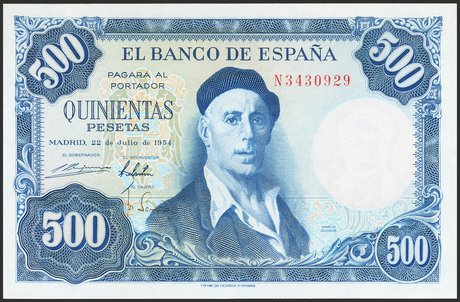 500 Pesetas. 22 de Julio de 1954. Serie N. (Edifil 2021: 468b). Conserva todo su apresto original. SC.