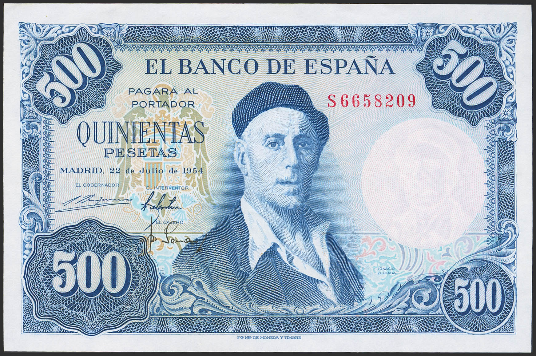 500 Pesetas. 22 de Julio de 1954. Serie S. (Edifil 2023: 468b). Conserva todo su apresto original. SC-.