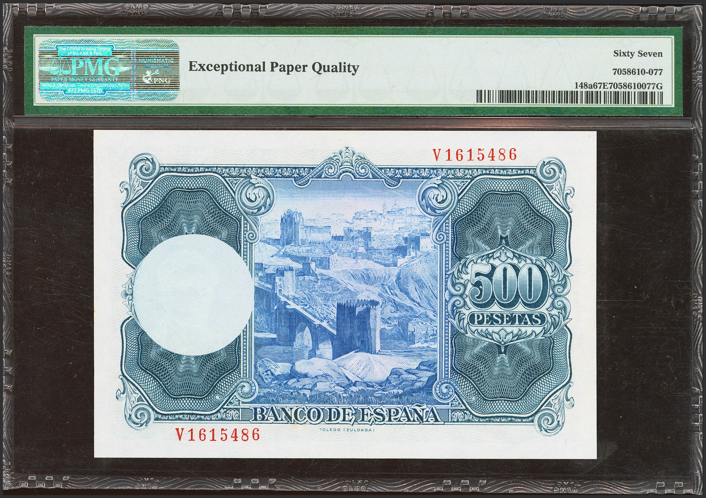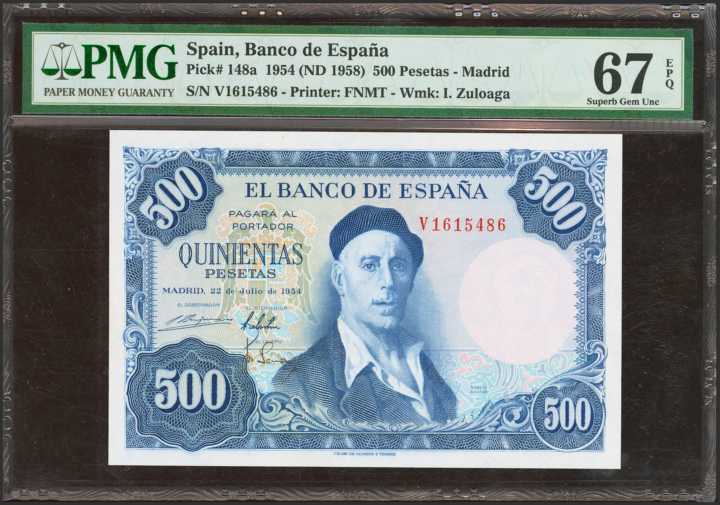 500 Pesetas. 22 de Julio de 1954. Serie V, última serie emitida. (Edifil 2023: 468c, Pick: 148a). Rara serie, especialmente en esta excepcional calidad, apresto original. SC. Encapsulado PMG67EPQ.