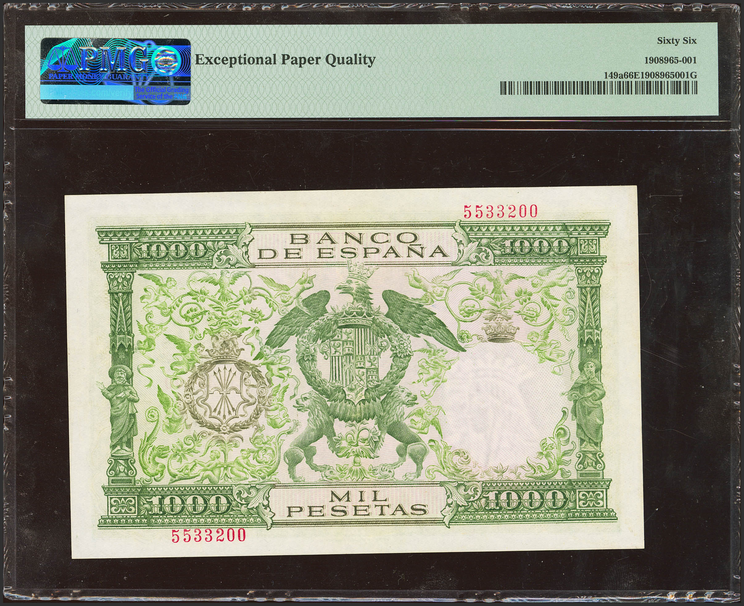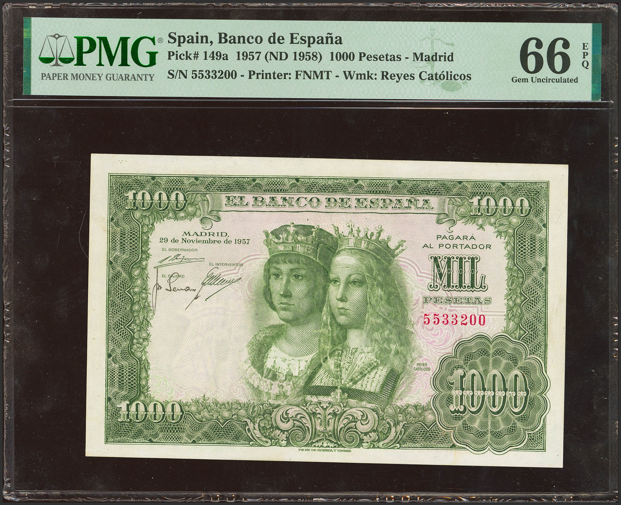 1000 Pesetas. 29 de Noviembre de 1957. Sin serie. (Edifil 2023: 469, Pick: 149a). Rarísimo en esta excepcional calidad, apresto original. SC. Encapsulado PMG66EPQ.