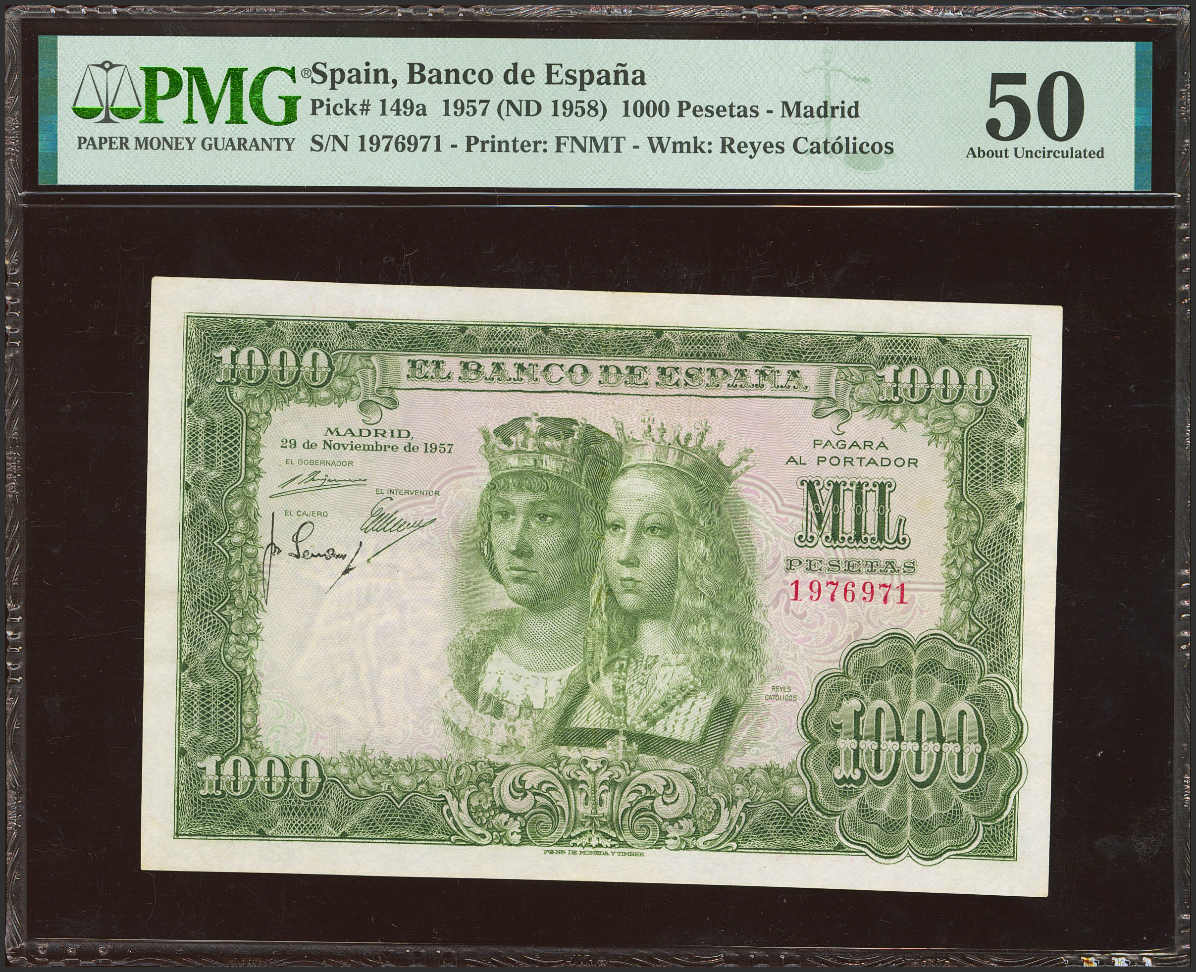 1000 Pesetas. 29 de Noviembre de 1957. Sin serie. (Edifil 2023: 469, Pick: 149a). Inusual. EBC. Encapsulado PMG50.