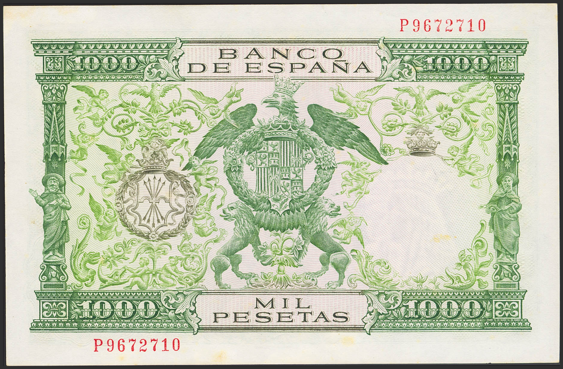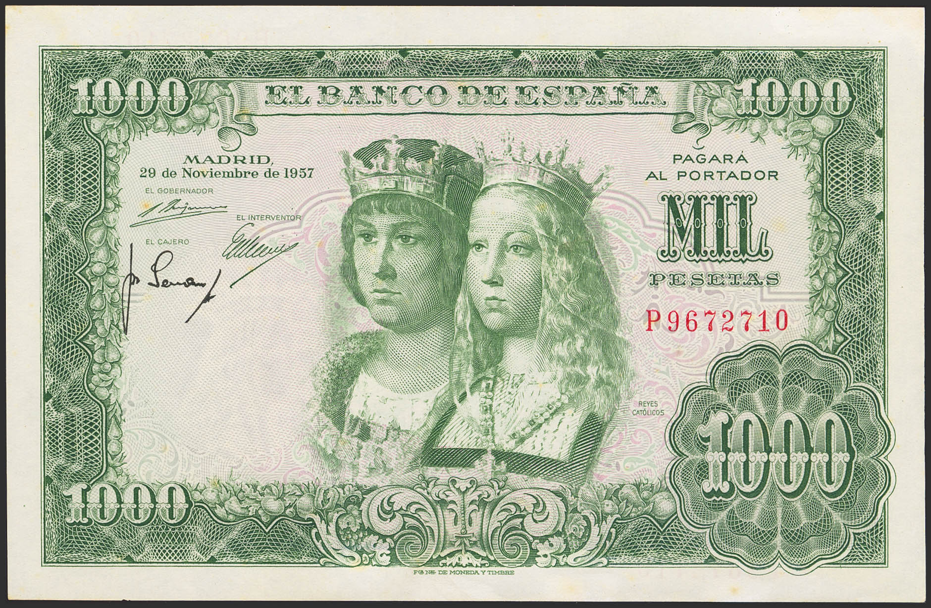 1000 Pesetas. 29 de Noviembre de 1957. Serie P. (Edifil 2023: 469b). Conserva todo su apresto original y manchitas del tiempo. SC-.