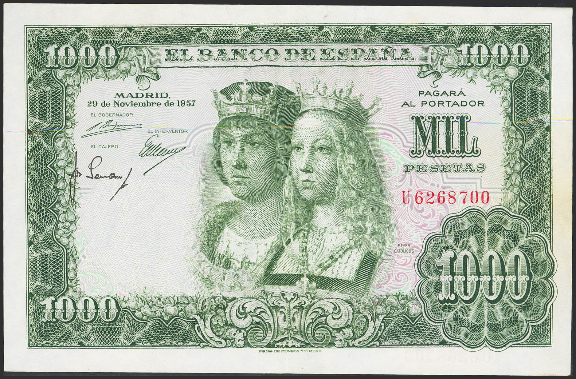 1000 Pesetas. 29 de Noviembre de 1957. Serie U. (Edifil 2023: 469b). Conserva gran parte del apresto original. EBC+.