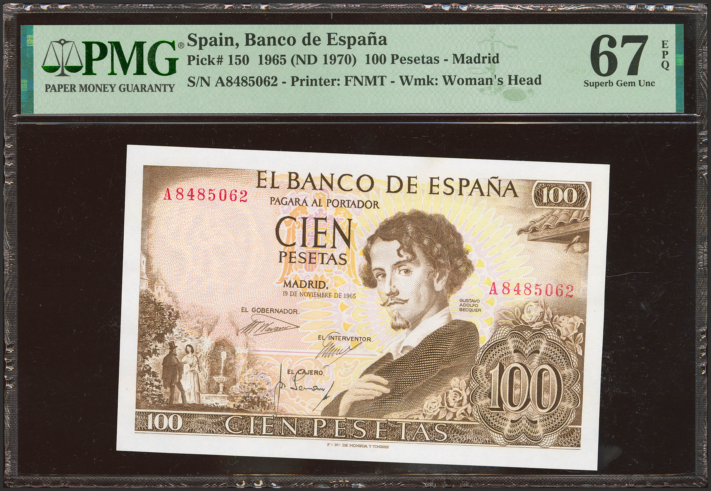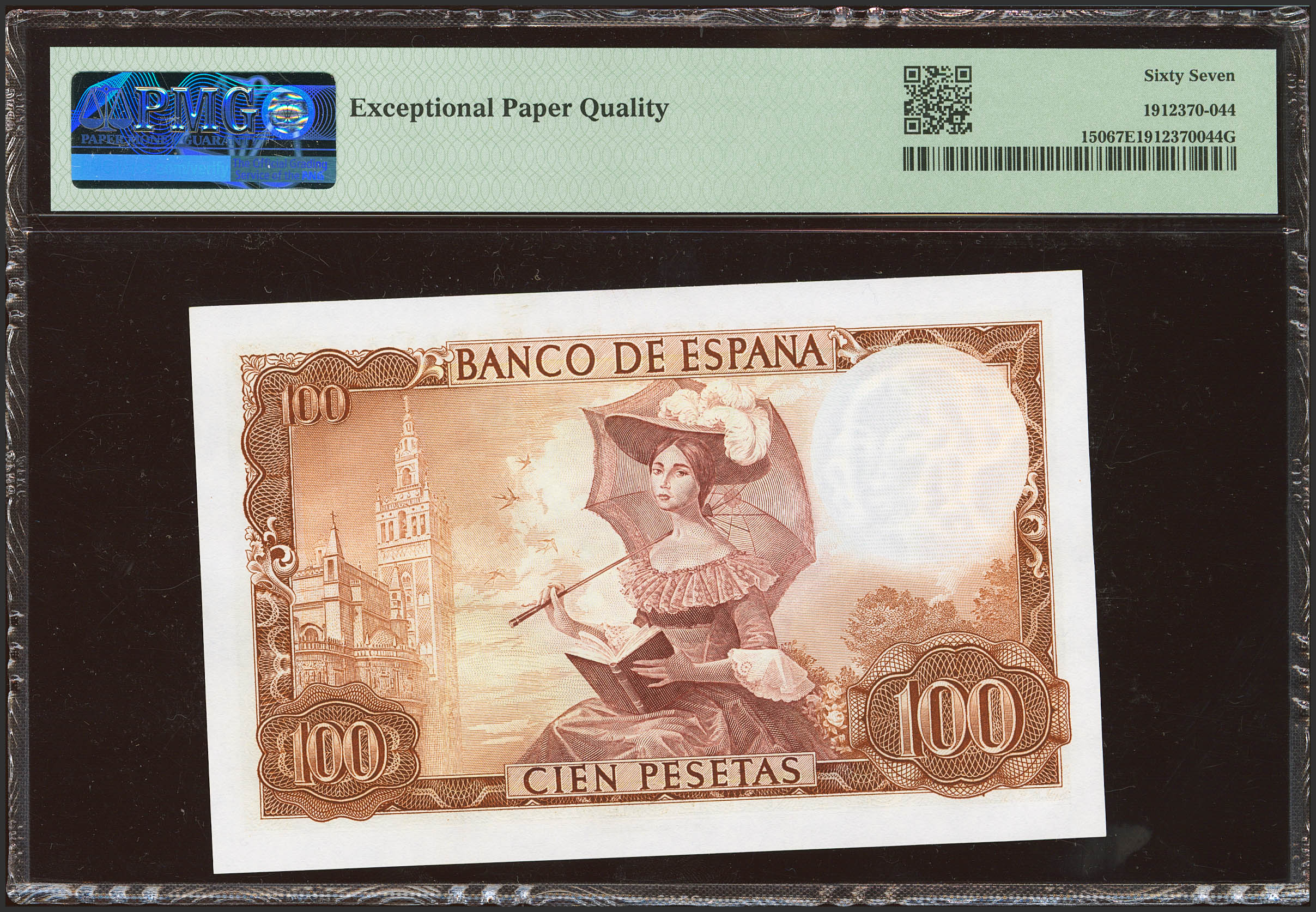 100 Pesetas. 19 de Noviembre de 1965. Serie A. (Edifil 2023: 470a, Pick: 150). Apresto original. Encapsulado PMG67EPQ.