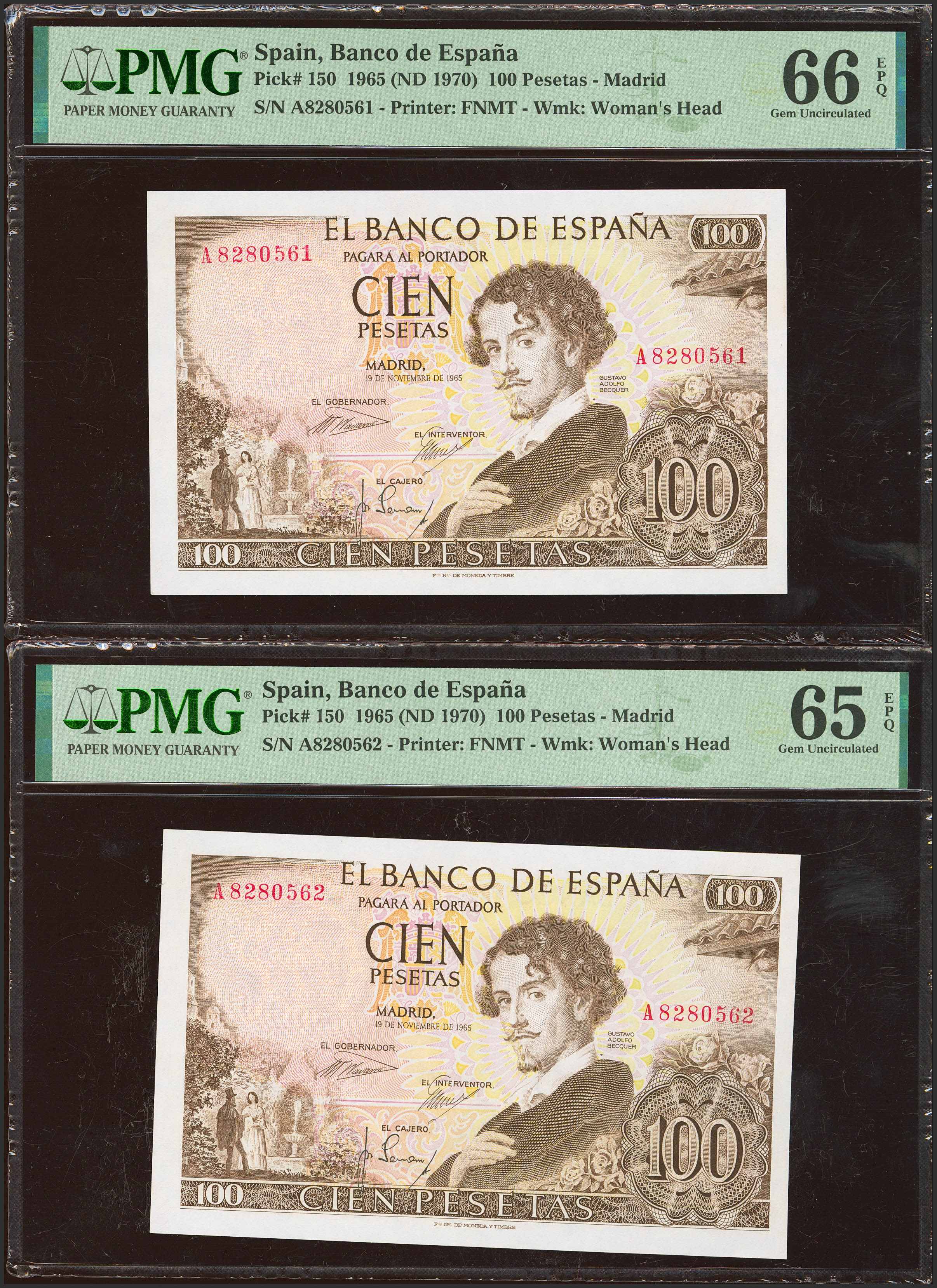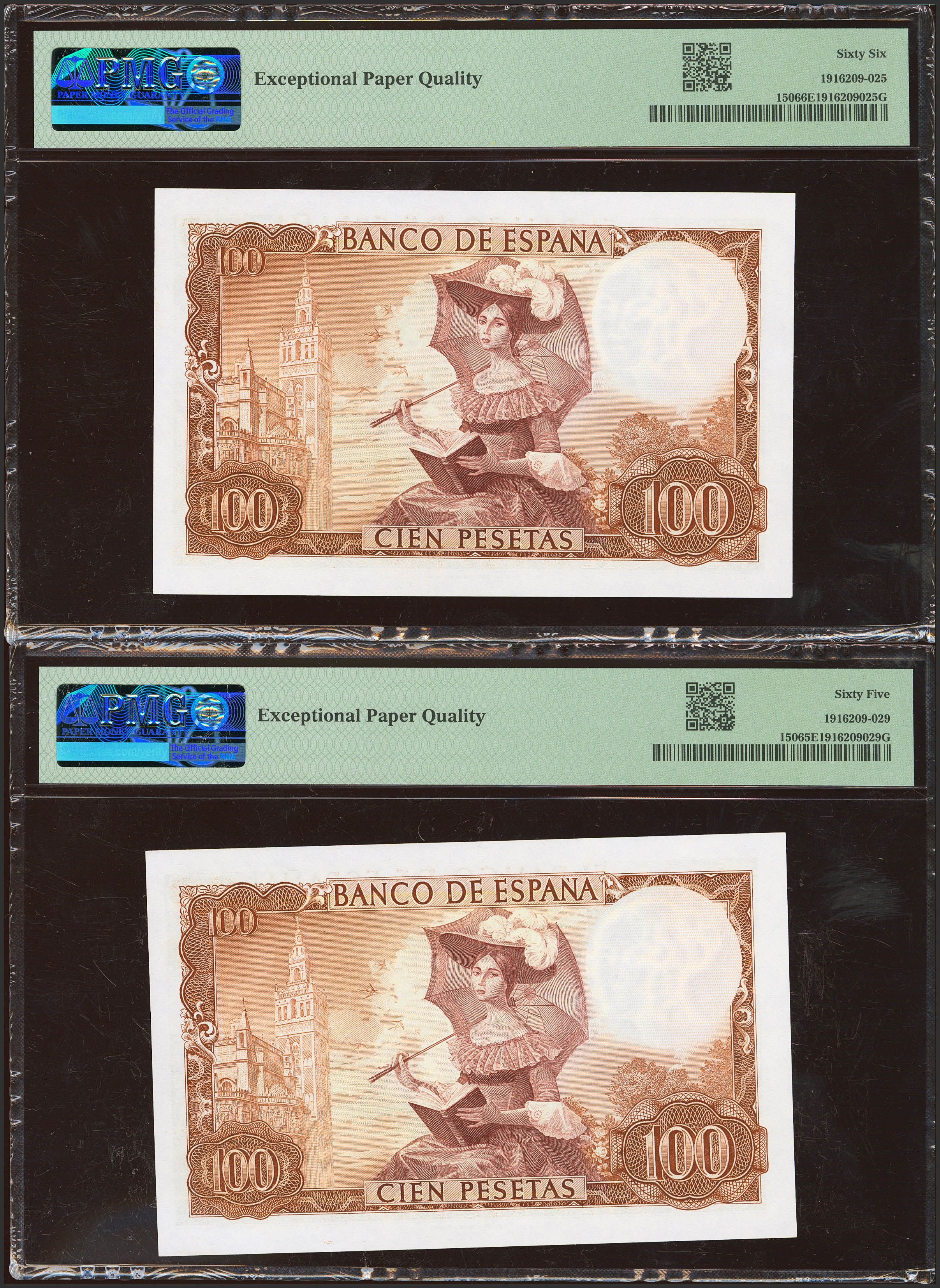 100 Pesetas. 19 de Noviembre de 1965. Pareja correlativa. Serie A. (Edifil 2023: 470a, Pick: 150). Apresto original. Encapsulados PMG65EPQ/66EPQ.