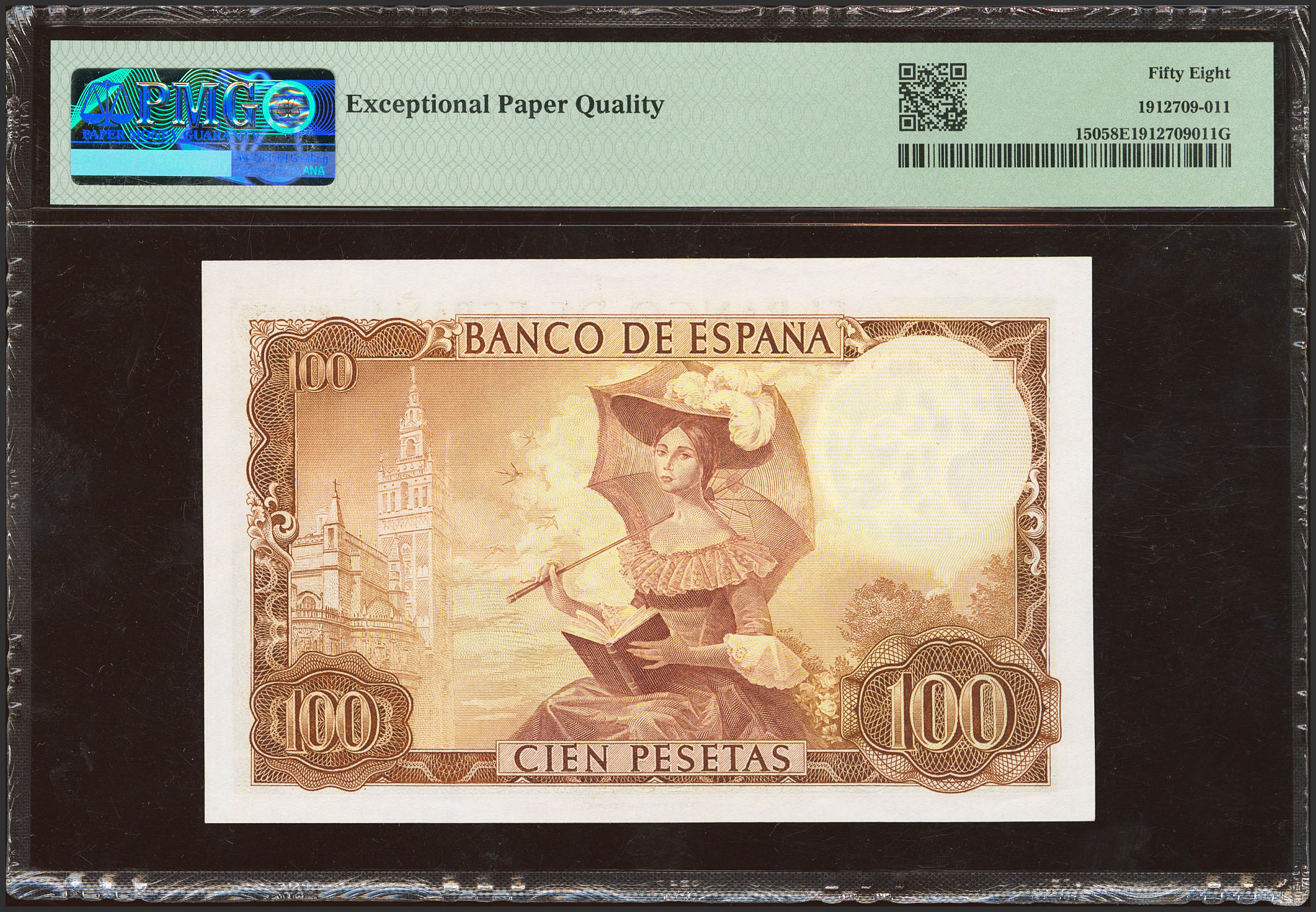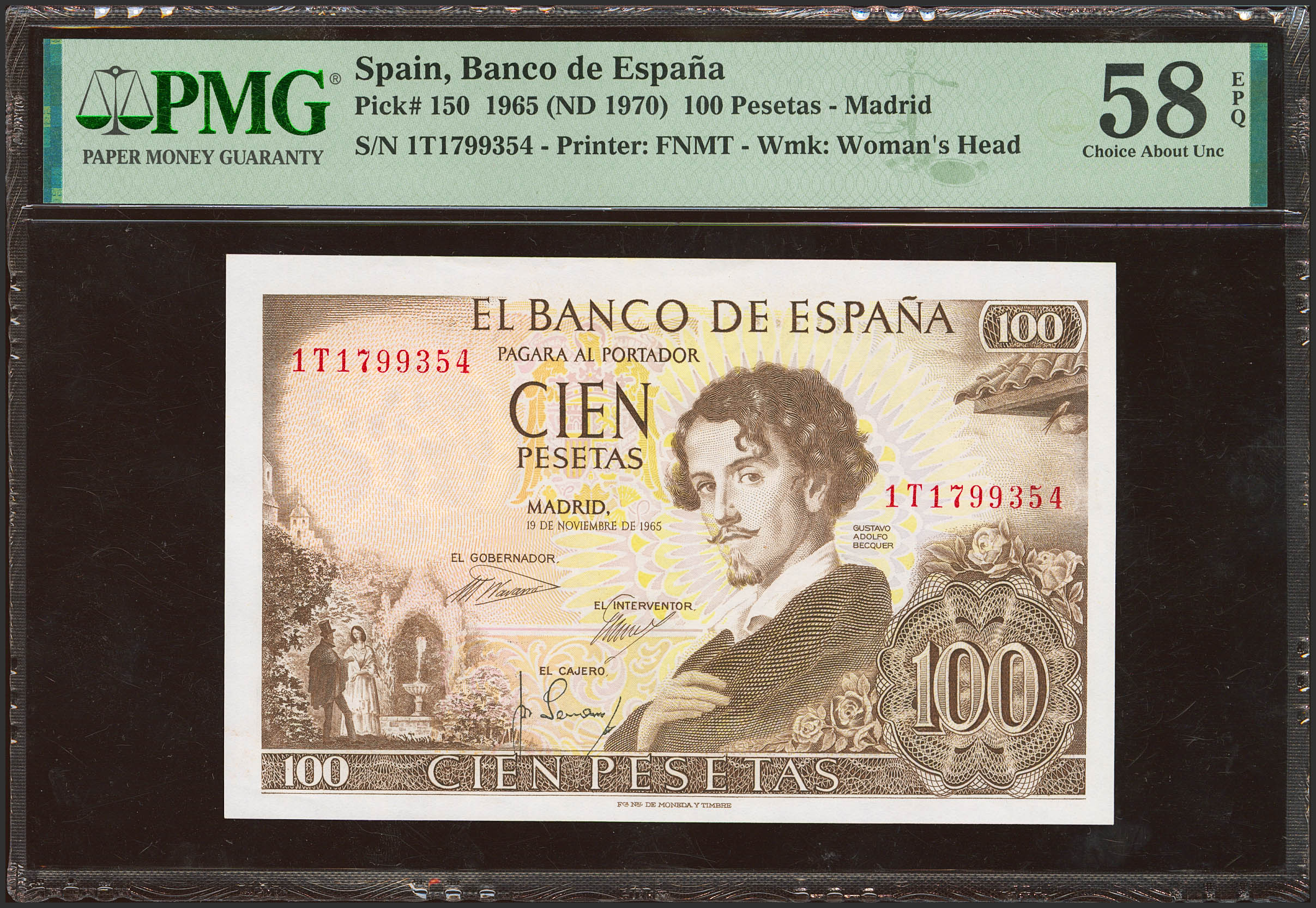 100 Pesetas. 19 de Noviembre de 1965. Serie 1T, última serie emitida. (Edifil 2023: 470b, Pick: 150). Apresto original. EBC+++. Encapsulado PMG58EPQ.