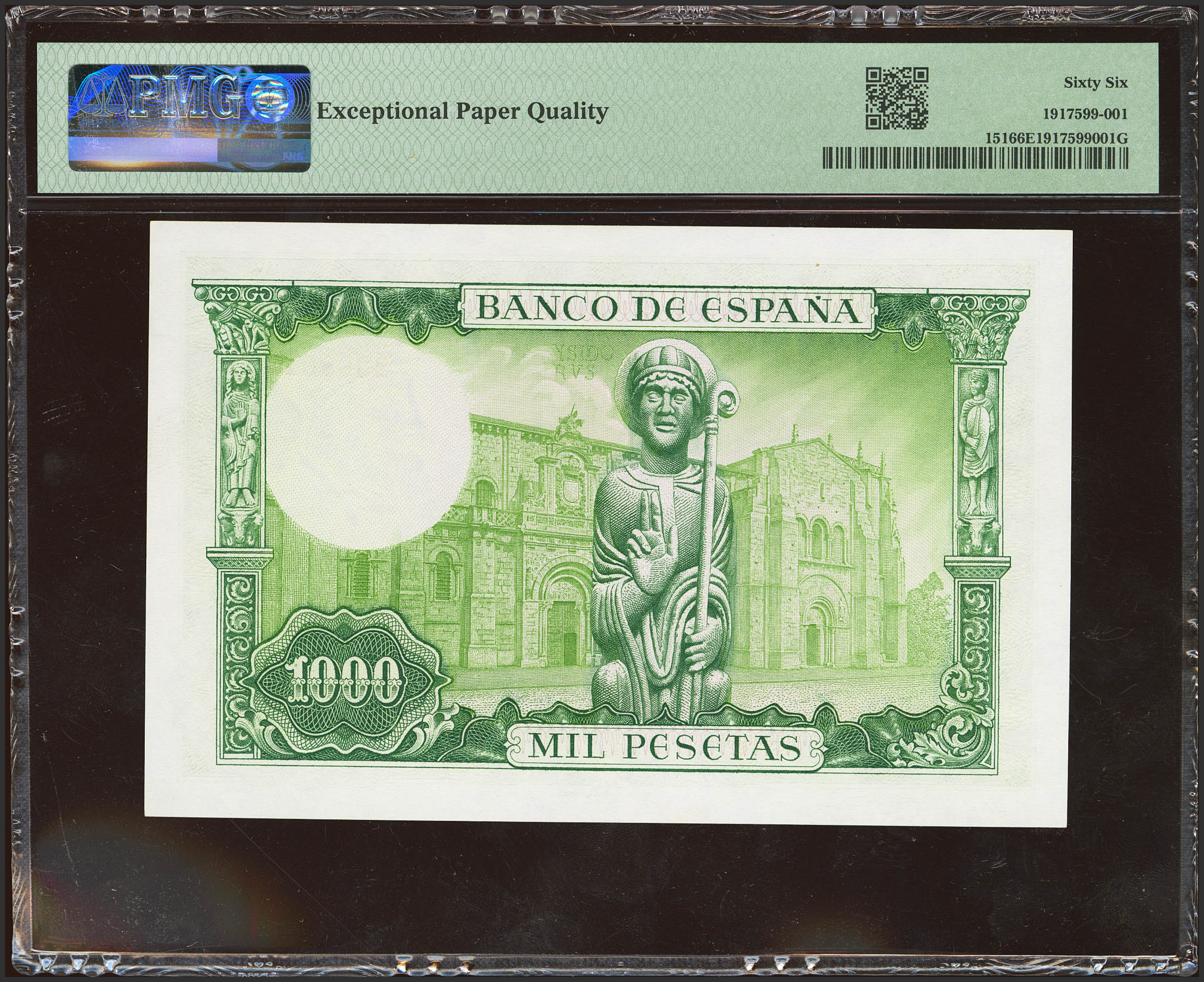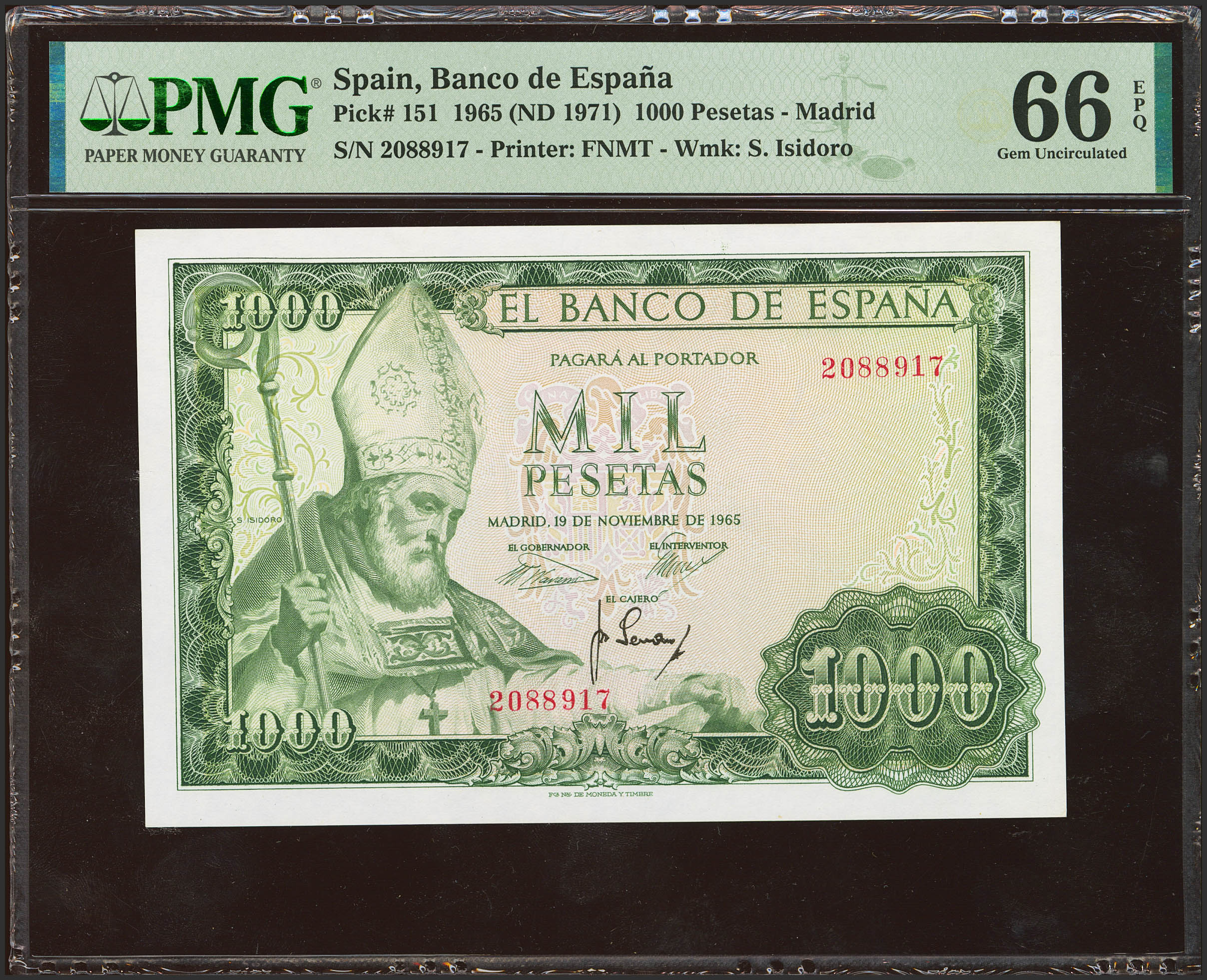 1000 Pesetas. 19 de Noviembre de 1965. Sin serie. (Edifil 2023: 471, Pick: 151). Rarísimo en esta excepcional calidad, apresto original. SC. Encapsulado PMG66EPQ.