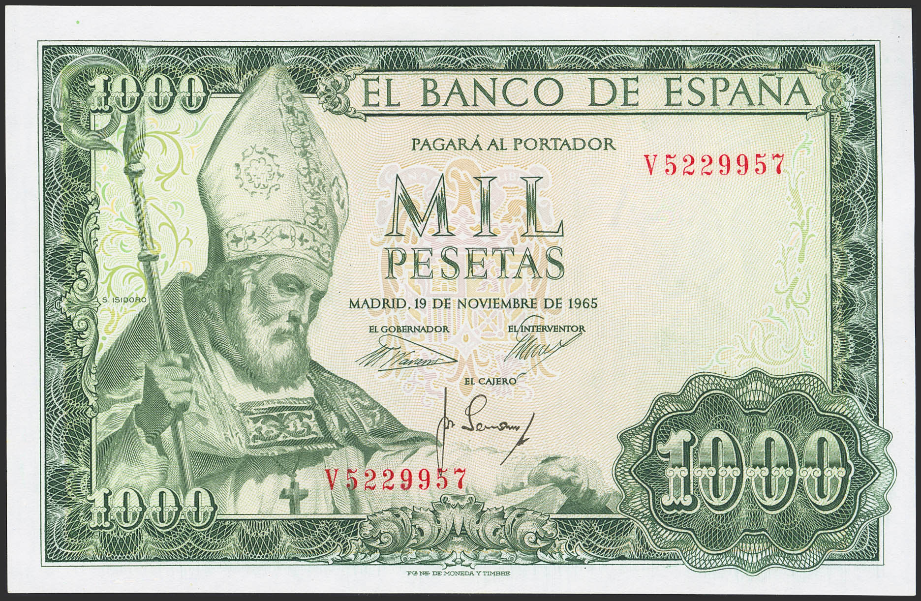 1000 Pesetas. 19 de Noviembre de 1965. Serie V. (Edifil 2023: 471b). Conserva parte de su apresto original. EBC+.
