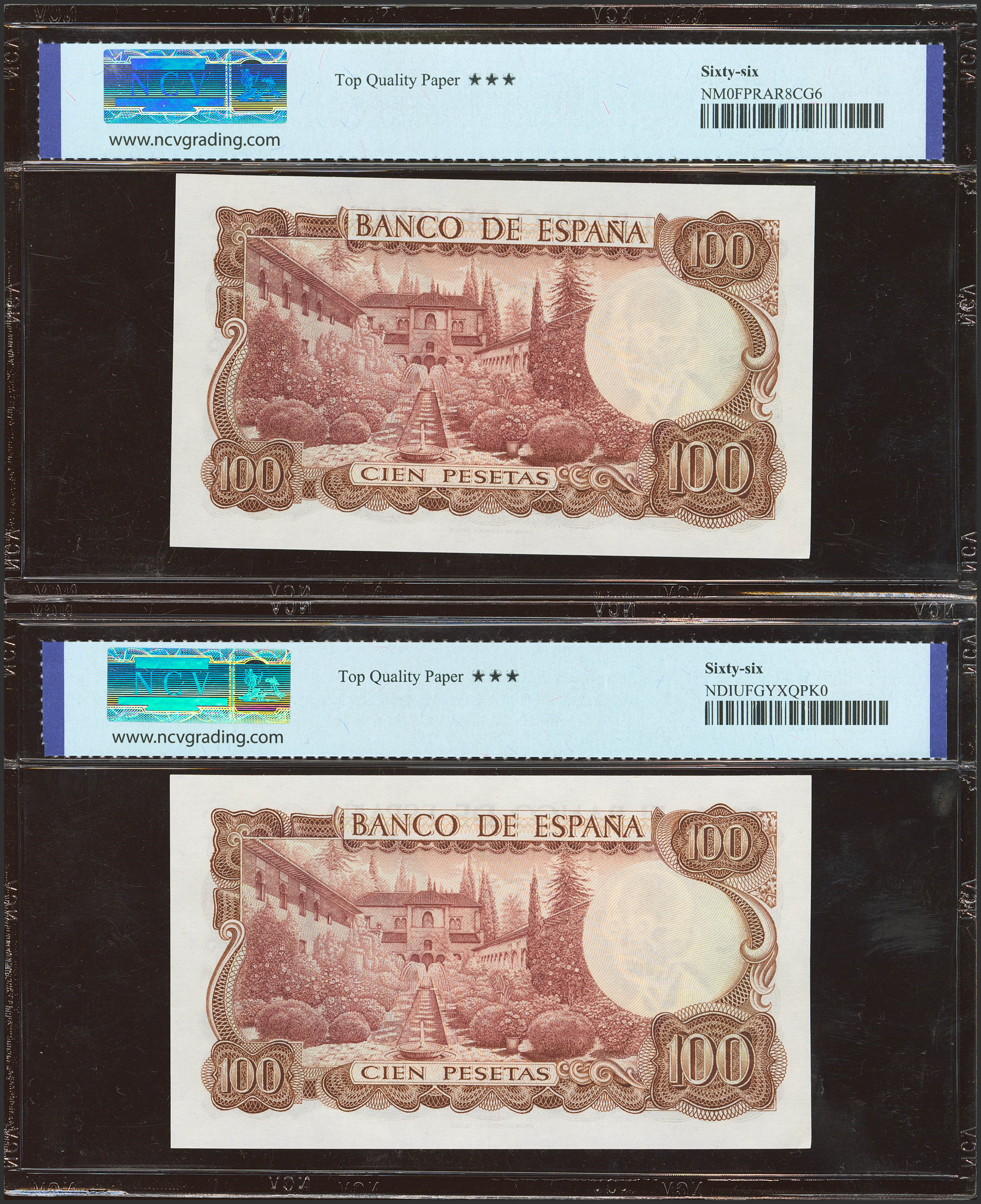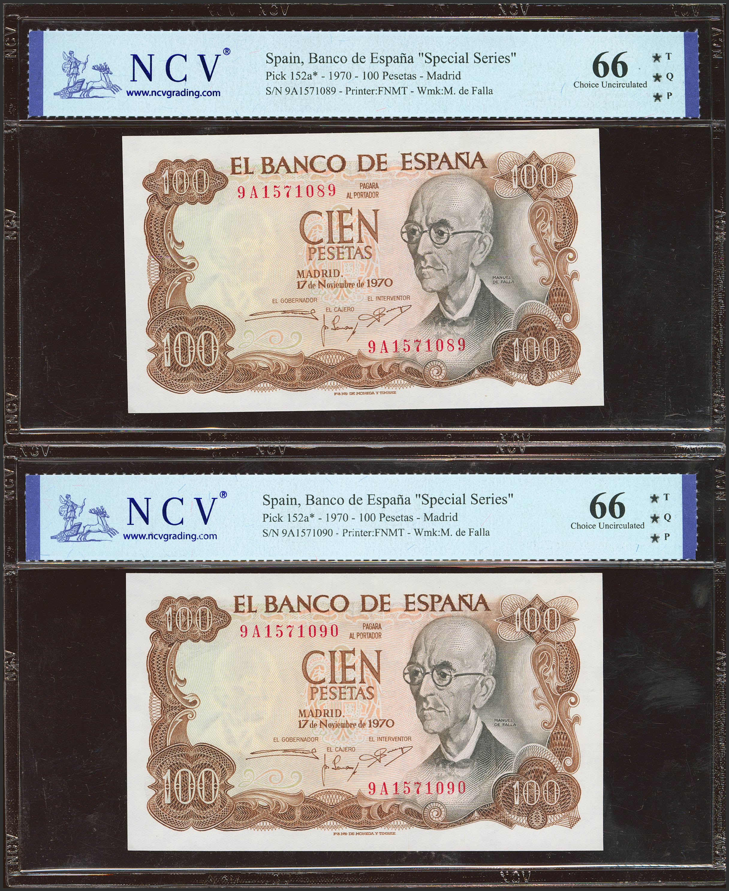 100 Pesetas. 17 de Noviembre de 1970. Pareja correlativa. Serie especial 9A. (Edifil 2023: 472d, Pick: 152a*). Apresto original. SC. Encapsulados NCV66TQP, ambos.