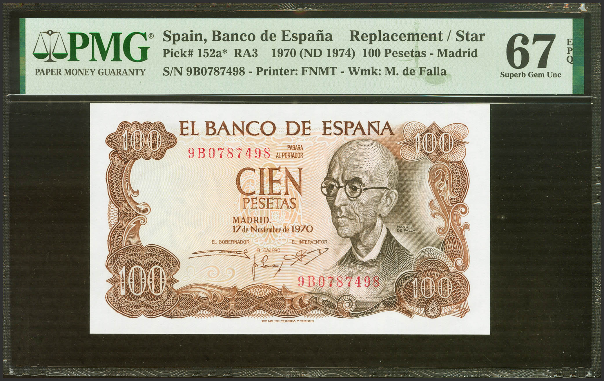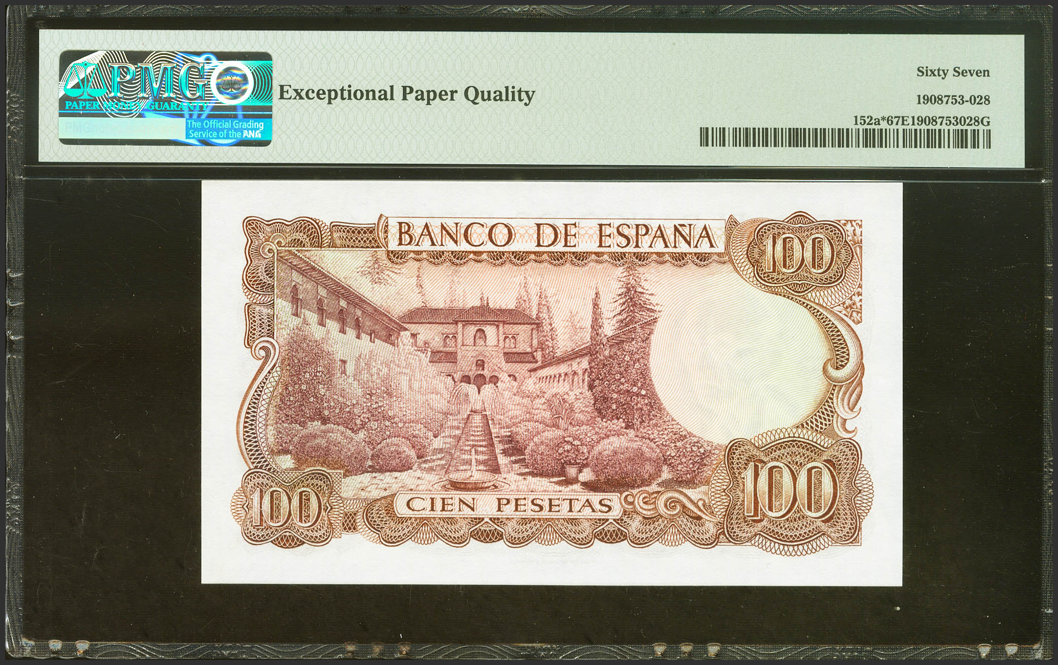 100 Pesetas. 17 de Noviembre de 1970. Serie especial 9B. (Edifil 2021: 472d, Pick: 152a*). Inusual en esta excepcional calidad, apresto original. SC. Encapsulado PMG67EPQ.