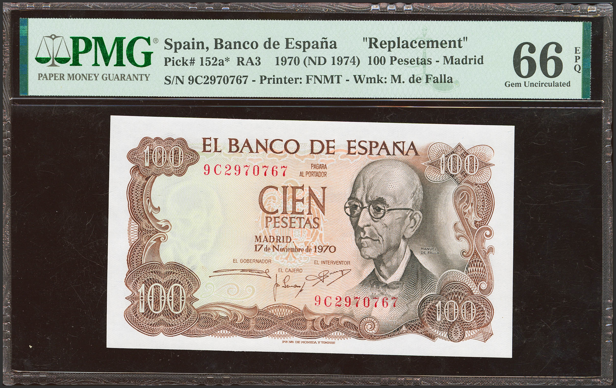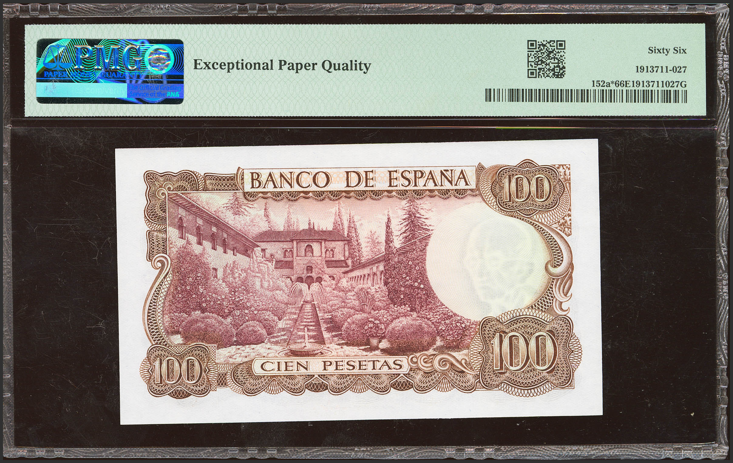 100 Pesetas. 17 de Noviembre de 1970. Serie especial 9C. (Edifil 2023: 472d, Pick: 152a*). Inusual en esta calidad, apresto original. SC. Encapsulado PMG66EPQ.