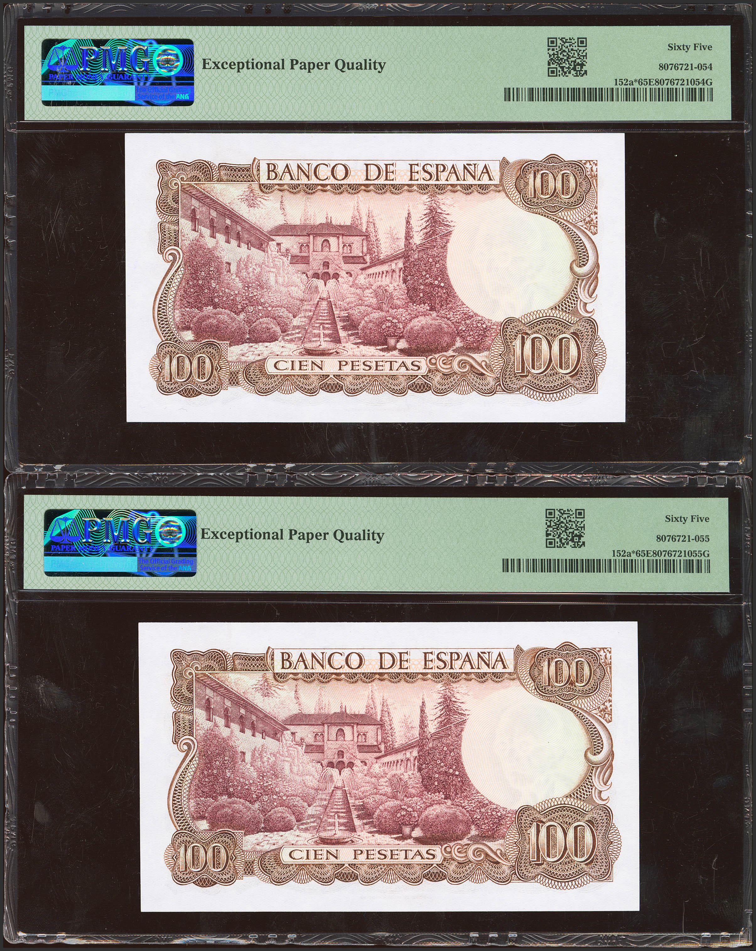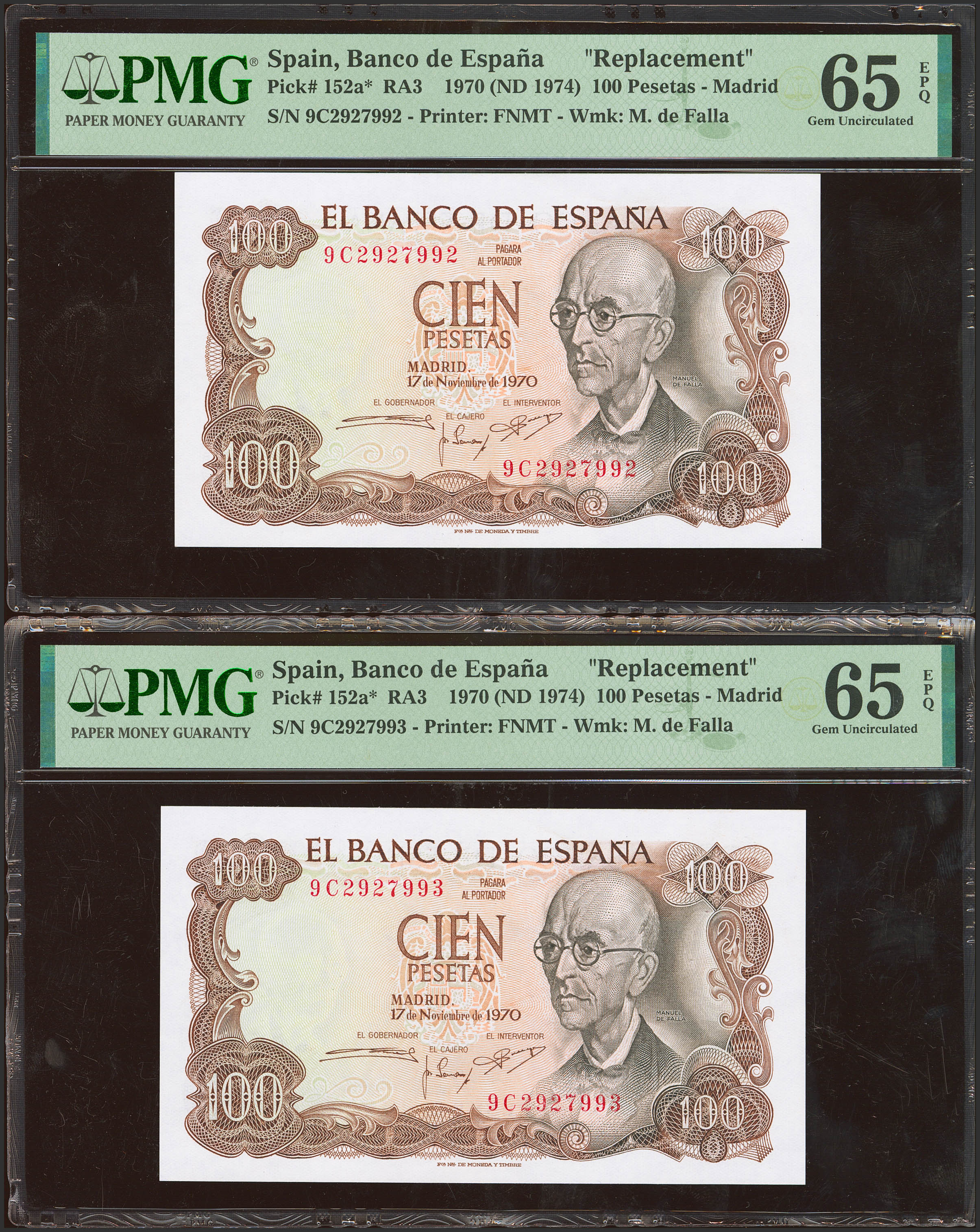 100 Pesetas. 17 de Noviembre de 1970. Pareja correlativa. Serie especial 9C. (Edifil 2023: 472d, Pick: 152a*). Apresto original. SC. Encapsulados PMG65EPQ, ambos.
