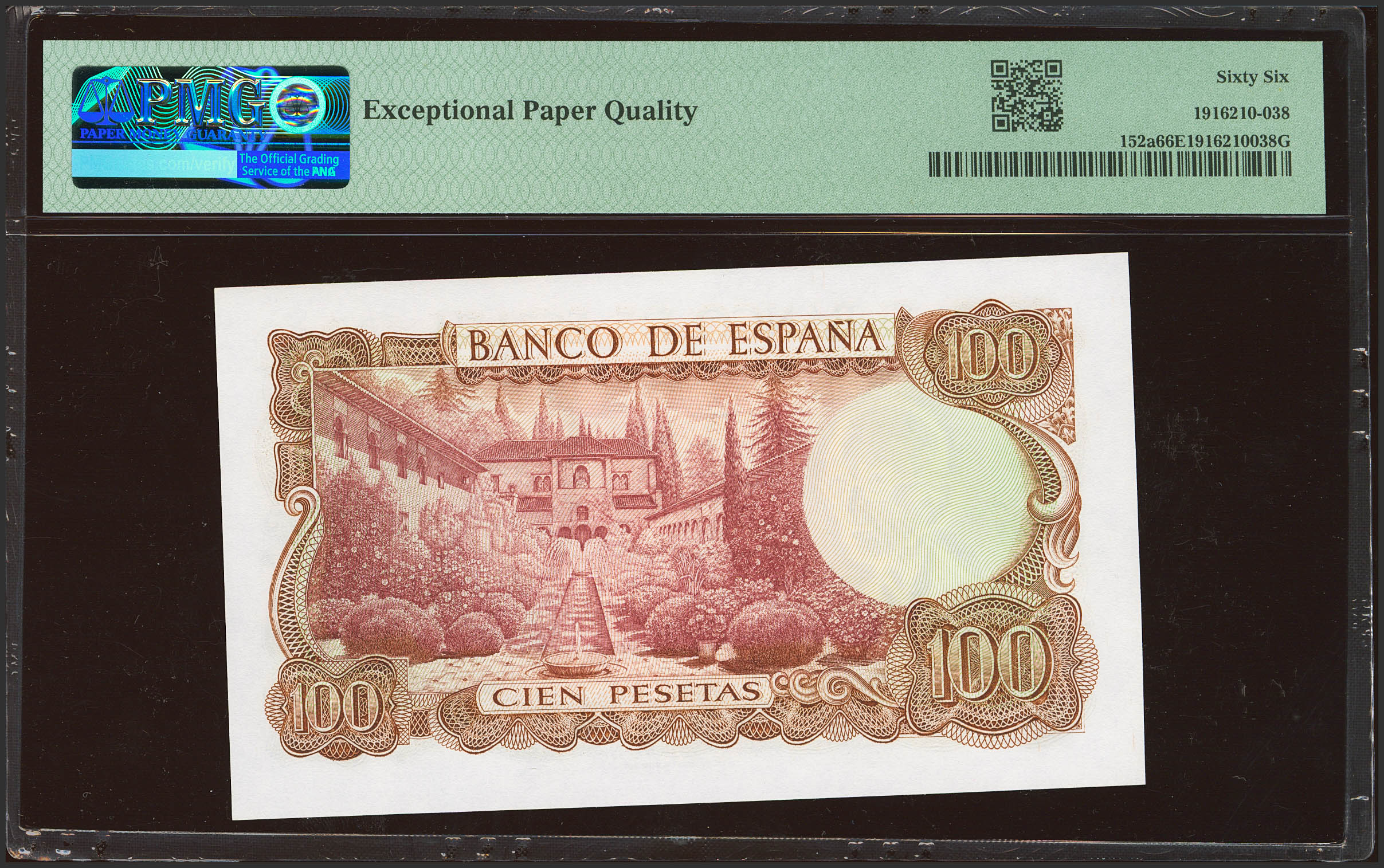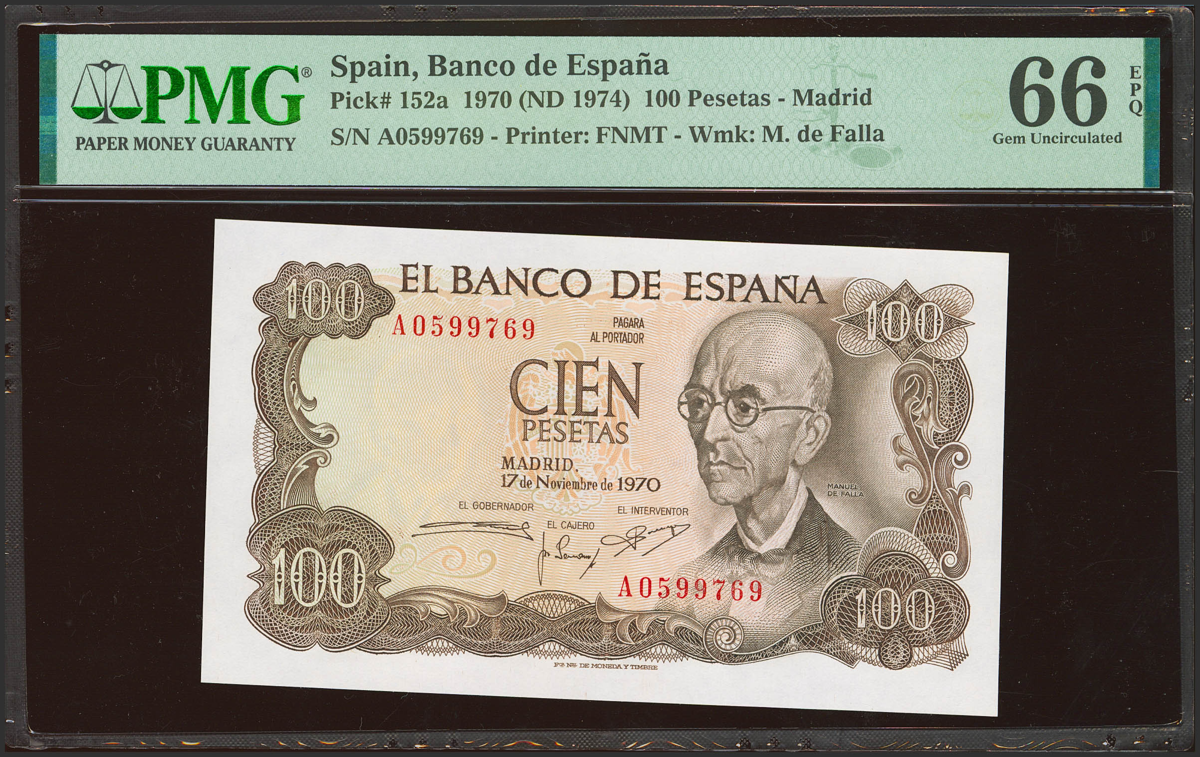 100 Pesetas. 17 de Noviembre de 1970. Serie A. (Edifil 2023: 472a, Pick: 152a). Apresto original. SC. Encapsulado PMG66EPQ.