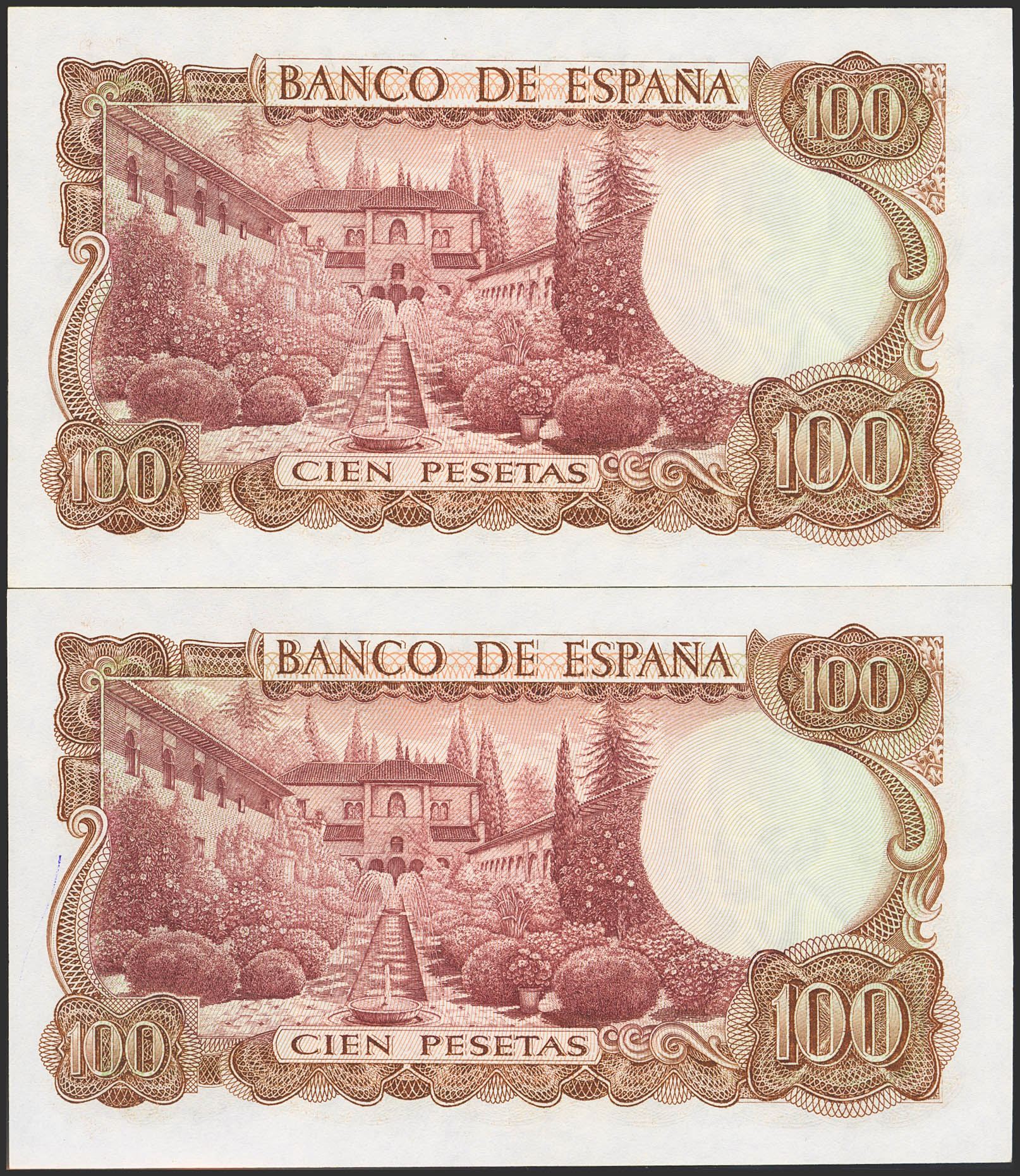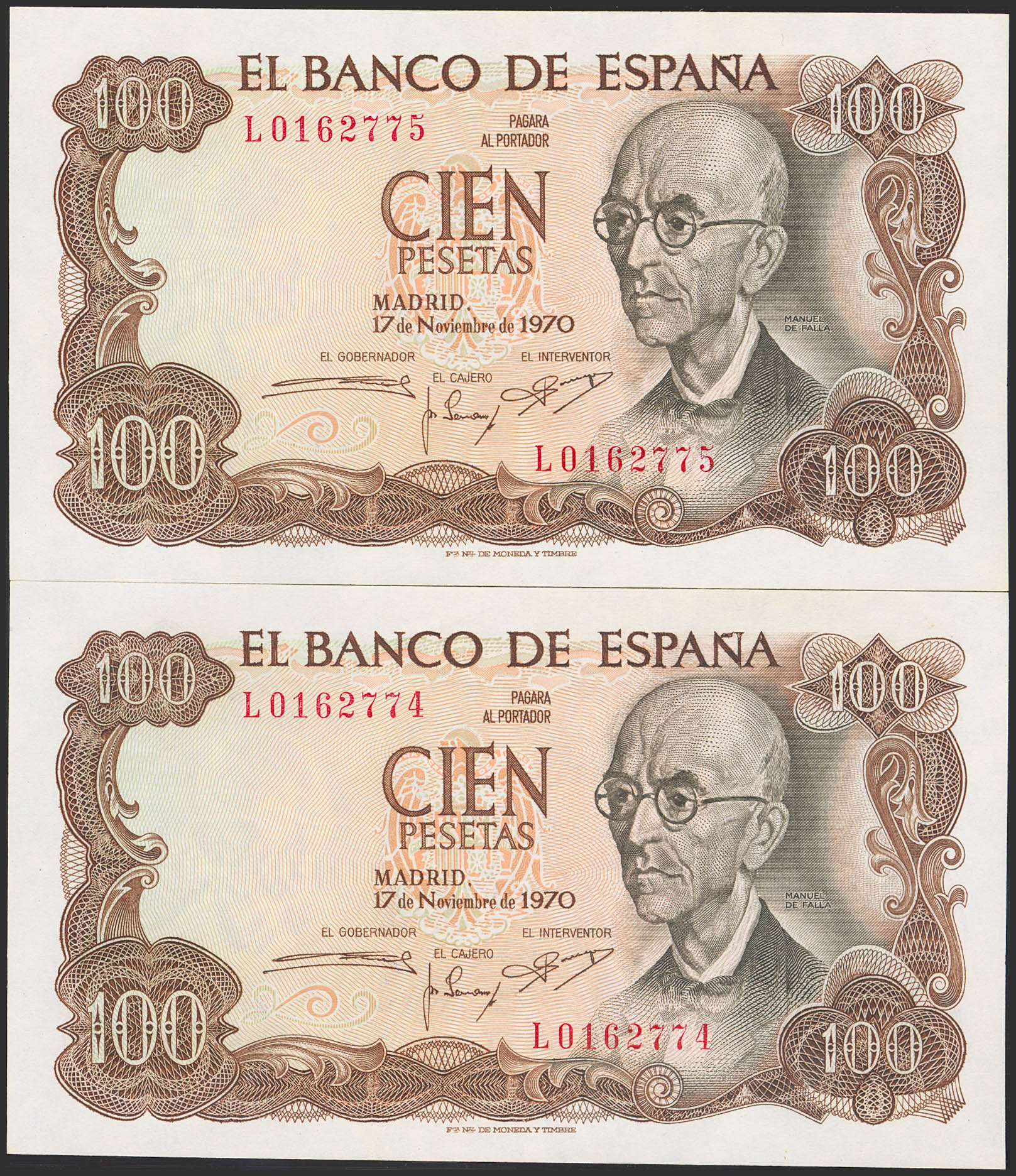 100 Pesetas. 17 de Noviembre de 1970. Pareja correlativa. Serie L. (Edifil 2023: 472b). Apresto original. SC.