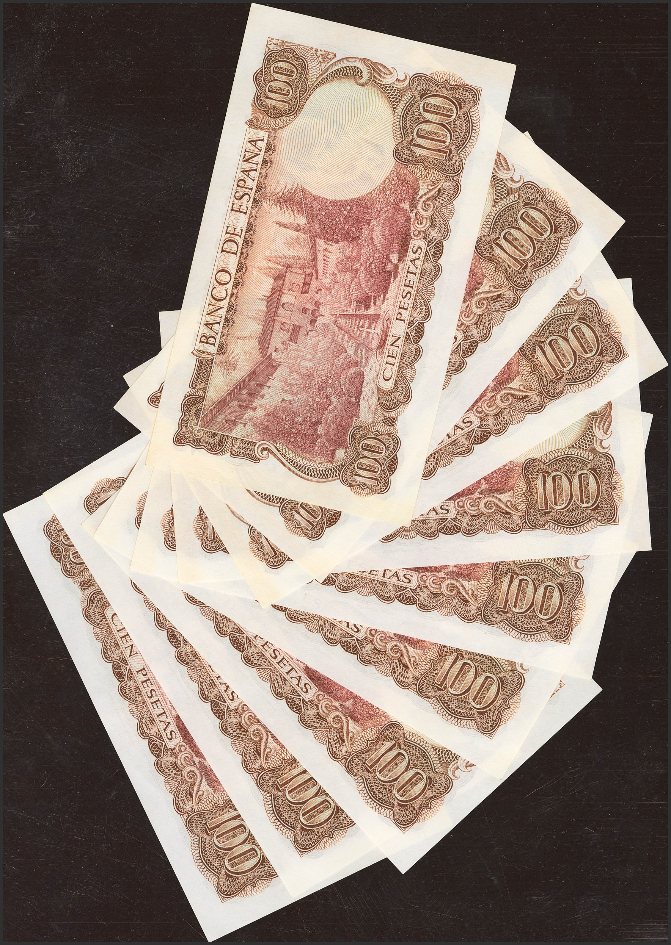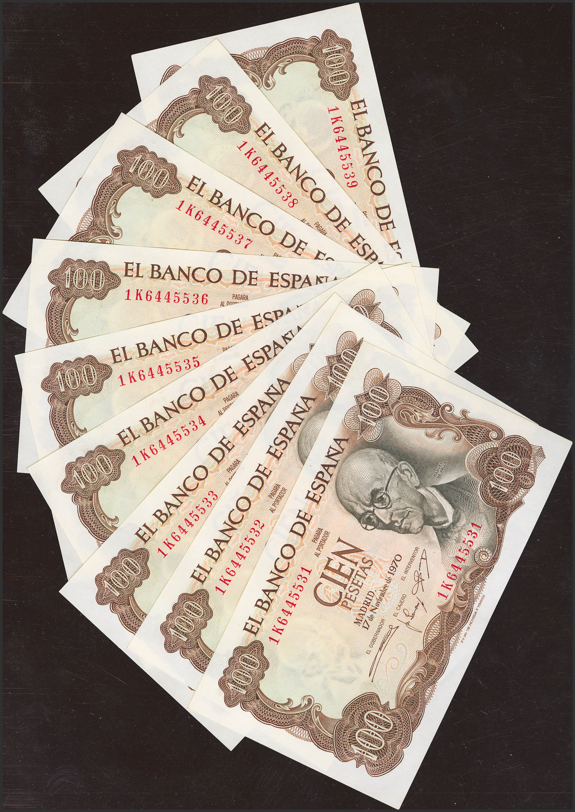 Conjunto de 9 billetes correlativos de 100 Pesetas emitidos el 17 de Noviembre de 1970 y con la serie 1K (Edifil 2023: 472b), conservando su apresto original. SC--.