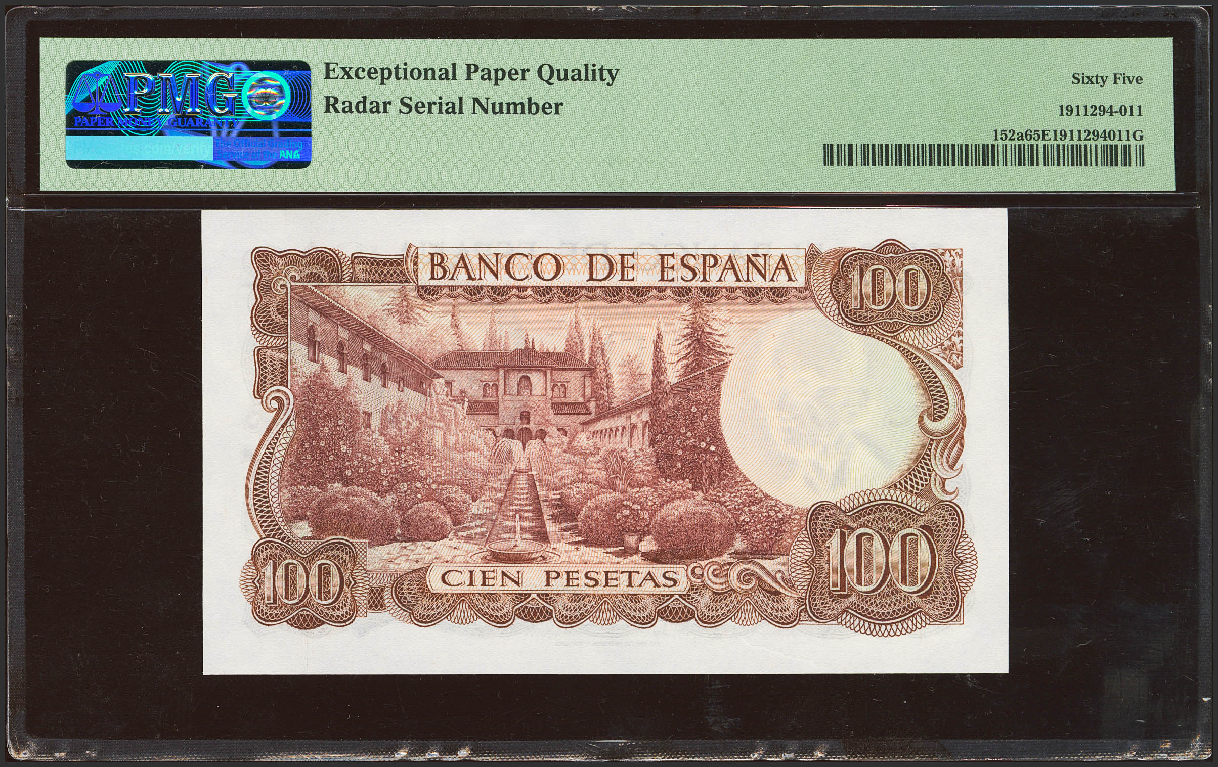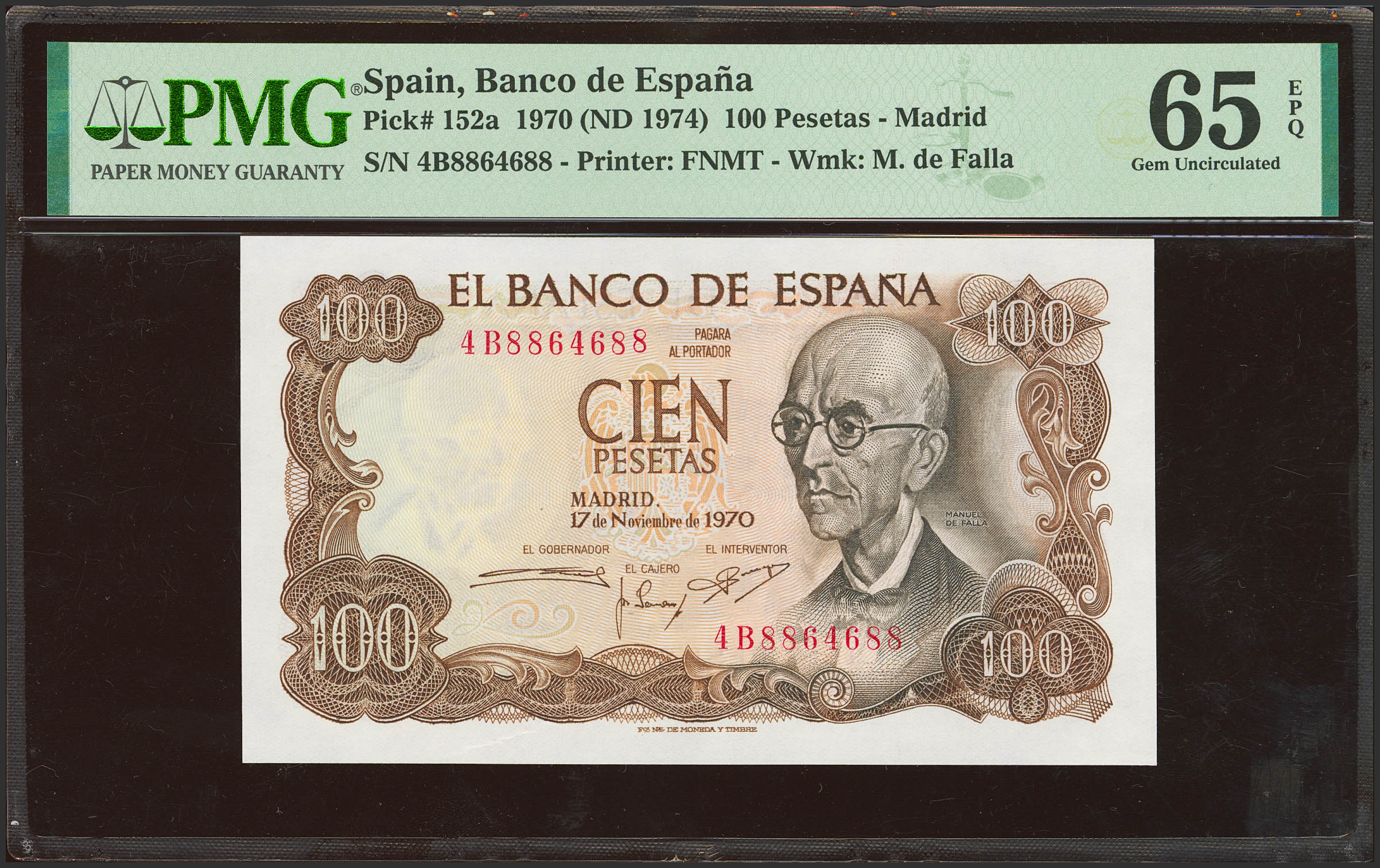 100 Pesetas. 17 de Noviembre de 1970. Serie 4B y numeración capicúa. (Edifil 2023: 472b, Pick: 152a). Inusual, apresto original. SC. Encapsulado PMG65EPQ.