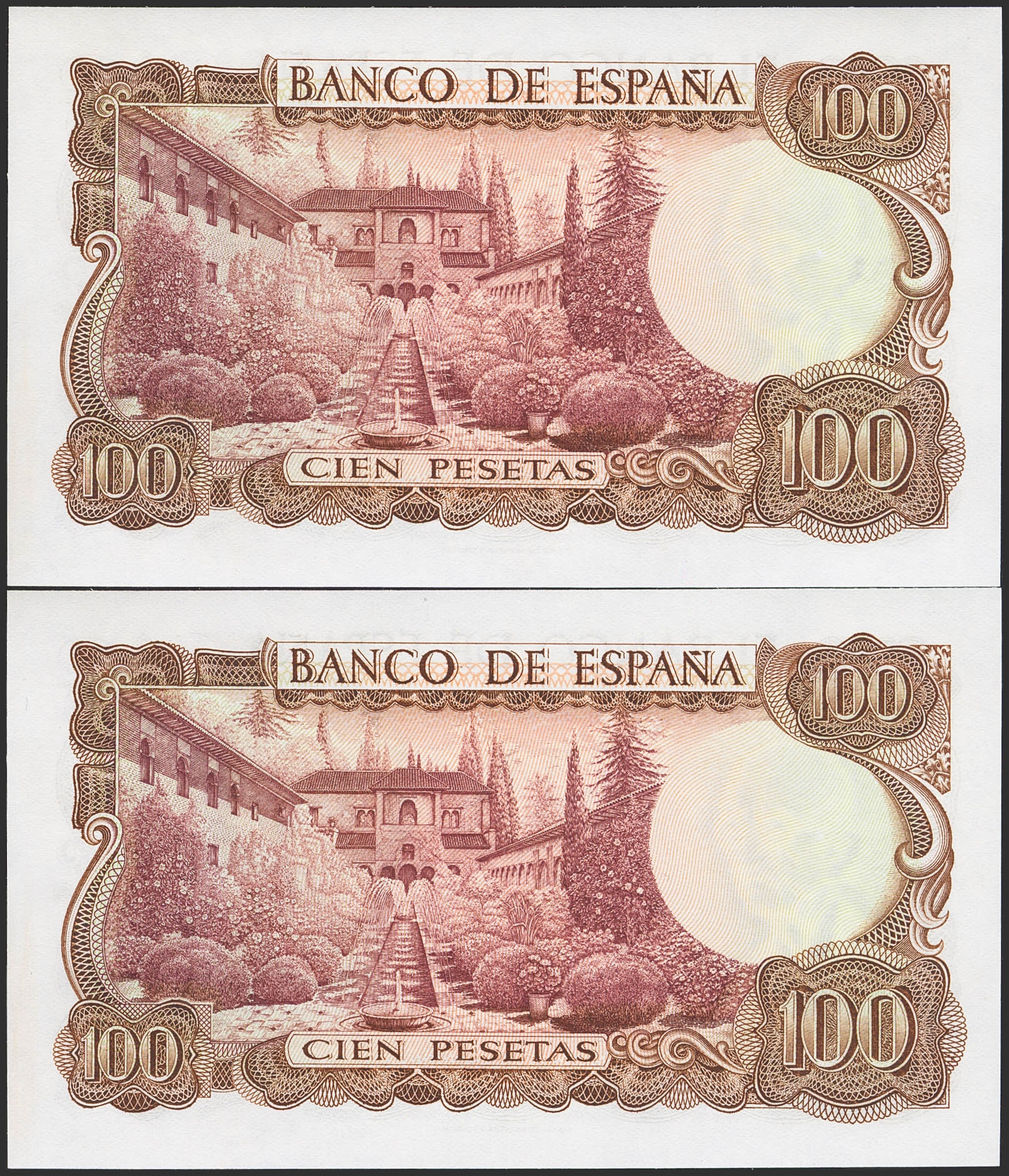100 Pesetas. 17 de Noviembre de 1970. Pareja correlativa. Serie 7W, última serie emitida. (Edifil 2023: 472c). SC.