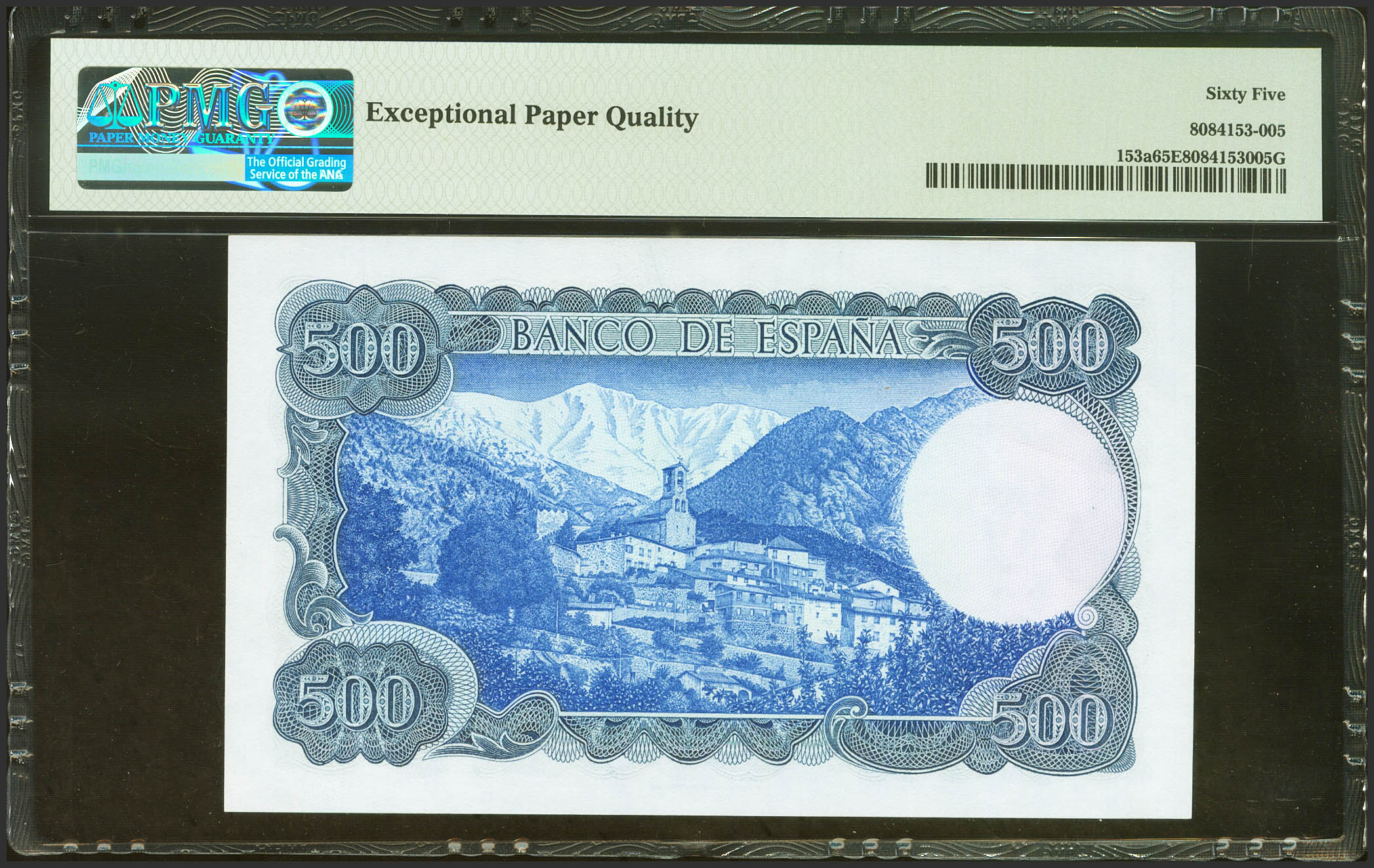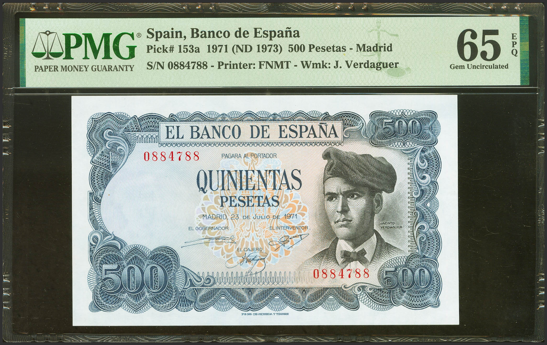 500 Pesetas. 23 de Julio de 1971. Sin serie. (Edifil 2023: 473, Pick: 153a). Inusual en esta excepcional calidad, apresto original. Encapsulado PMG65EPQ.