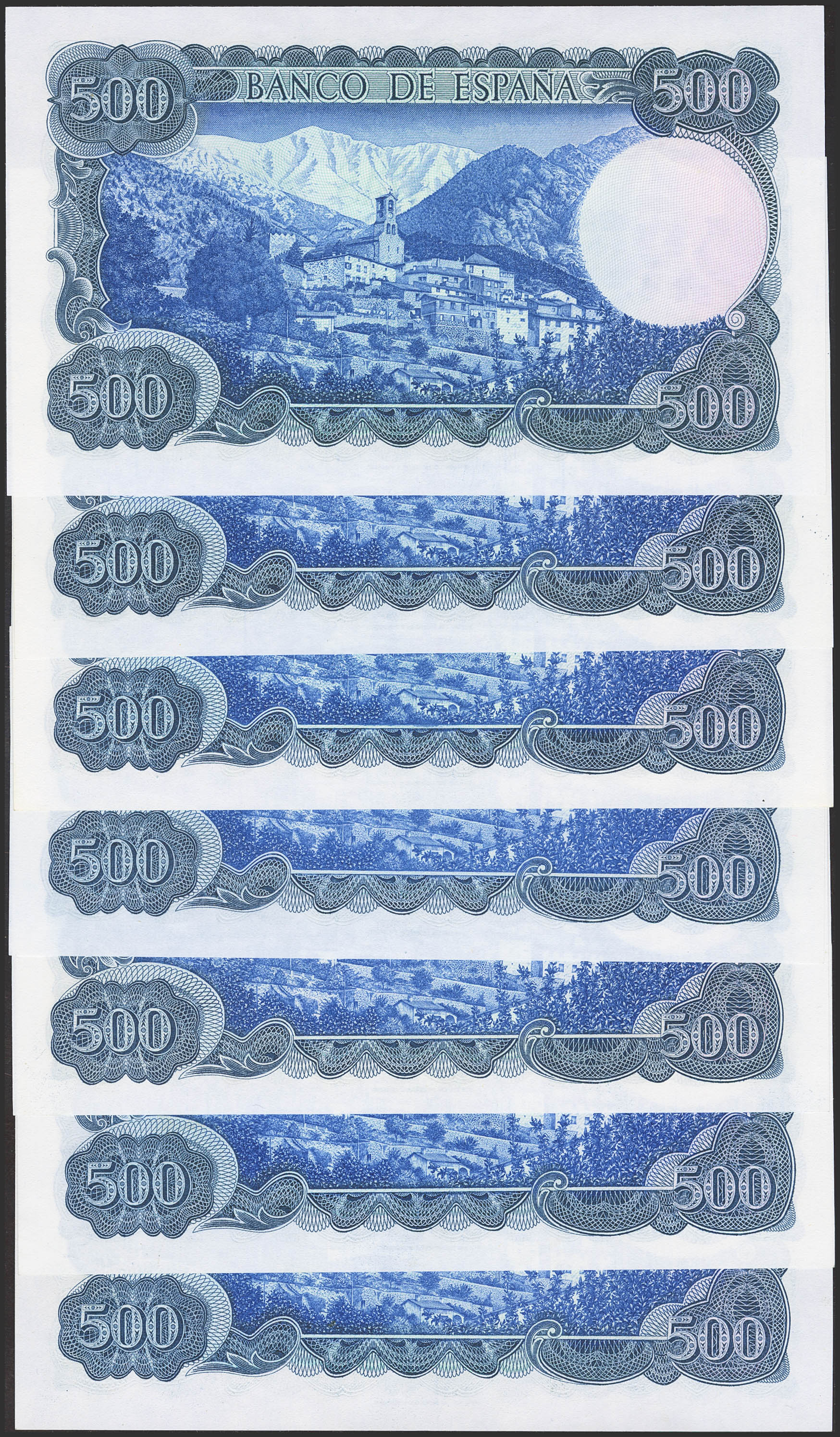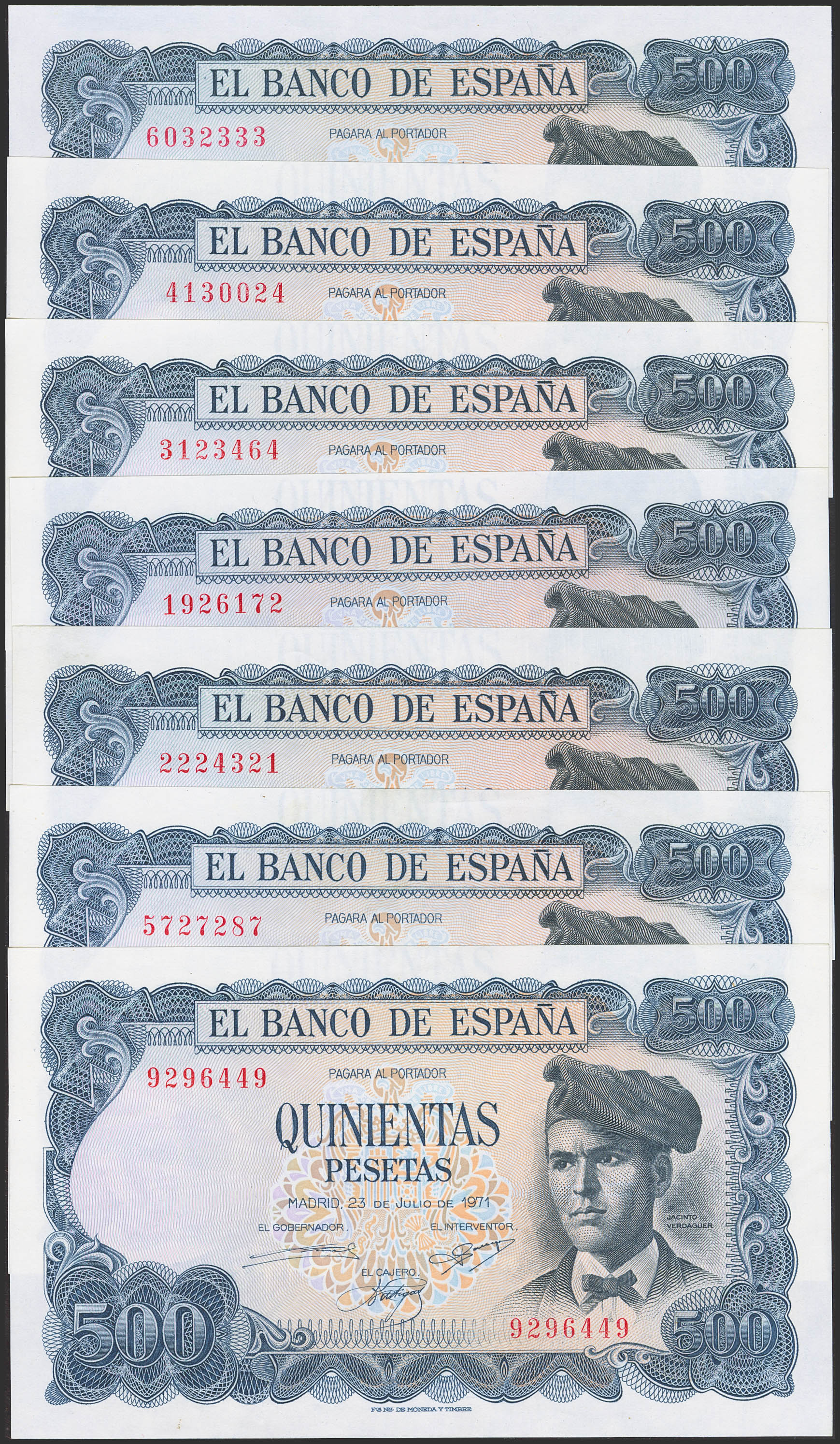 Conjunto de 7 billetes de 500 Pesetas emitidos el 23 de Julio de 1971, todos ellos sin serie (Edifil 2021: 473), conservan su apresto original. SC/SC-.