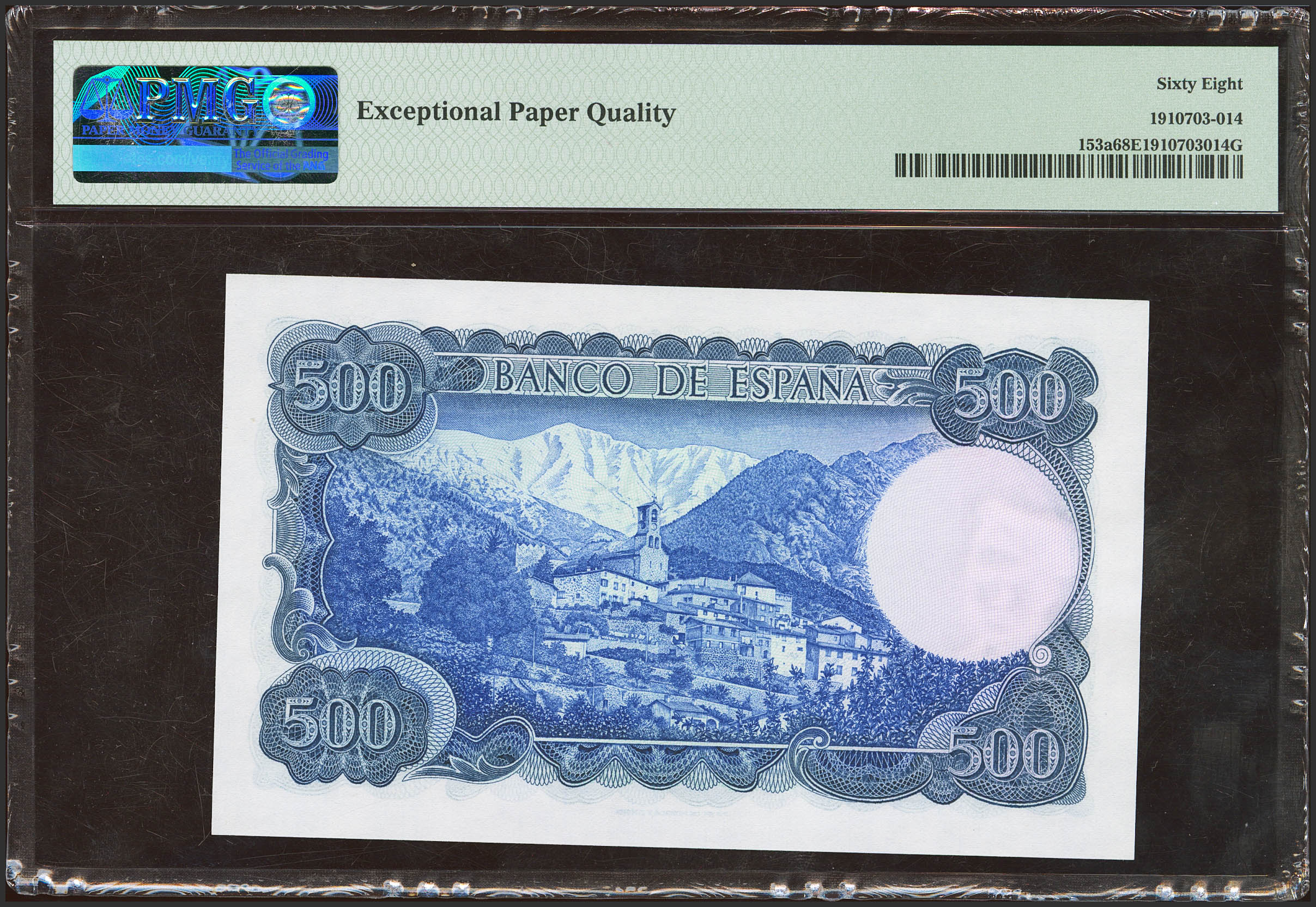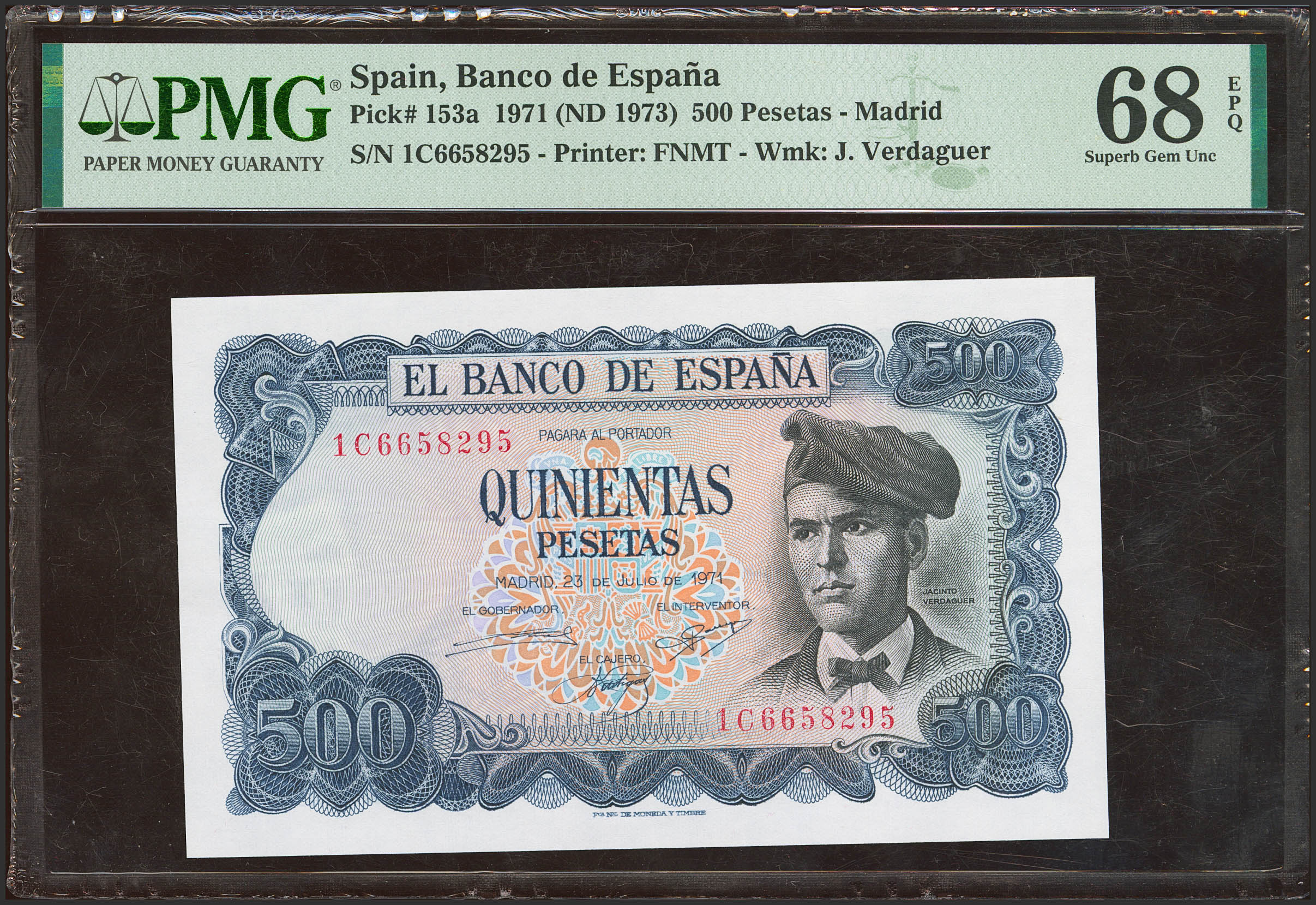 500 Pesetas. 23 de Julio de 1971. Serie 1C. (Edifil 2023: 473a, Pick: 153a). Apresto original. SC. Encapsulado PMG68EPQ.