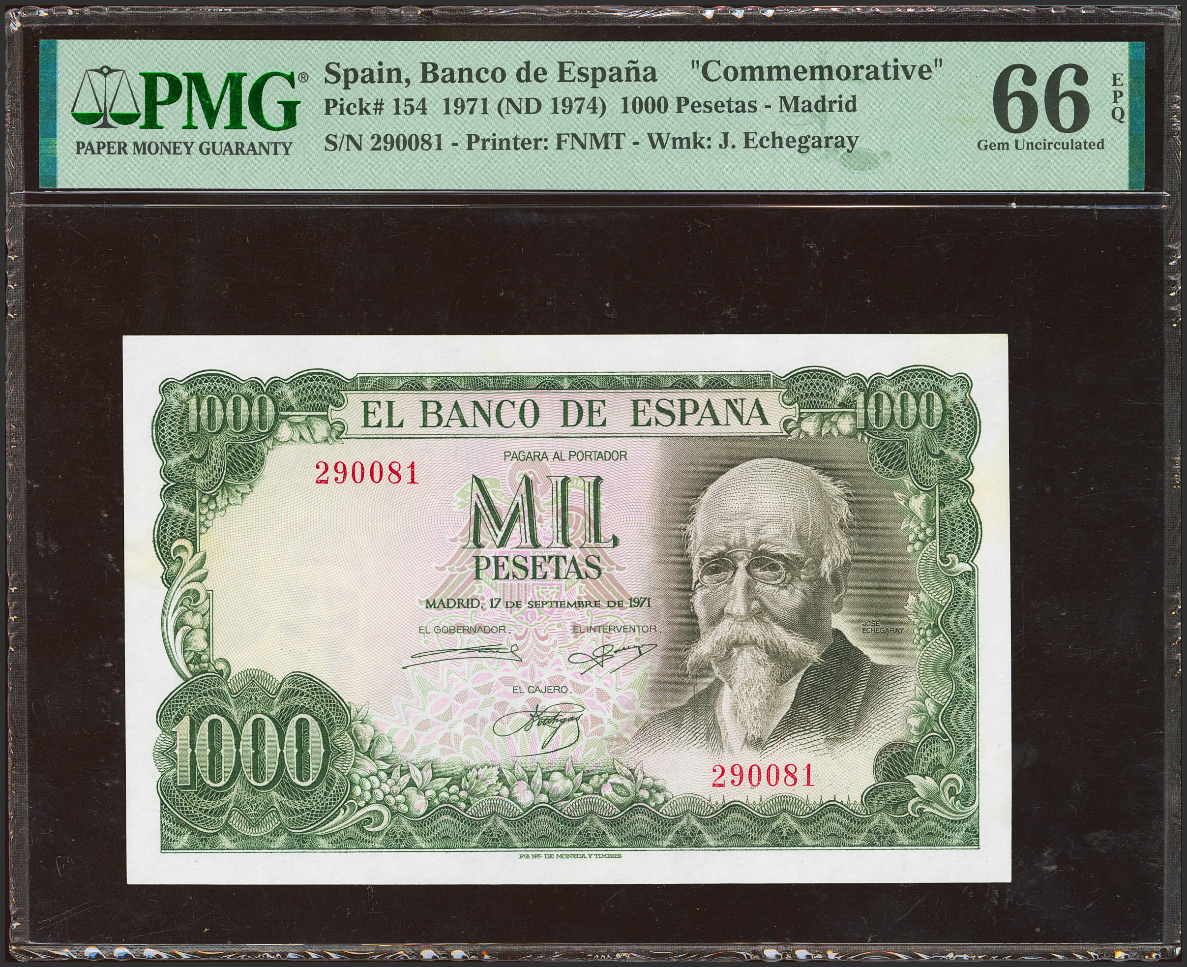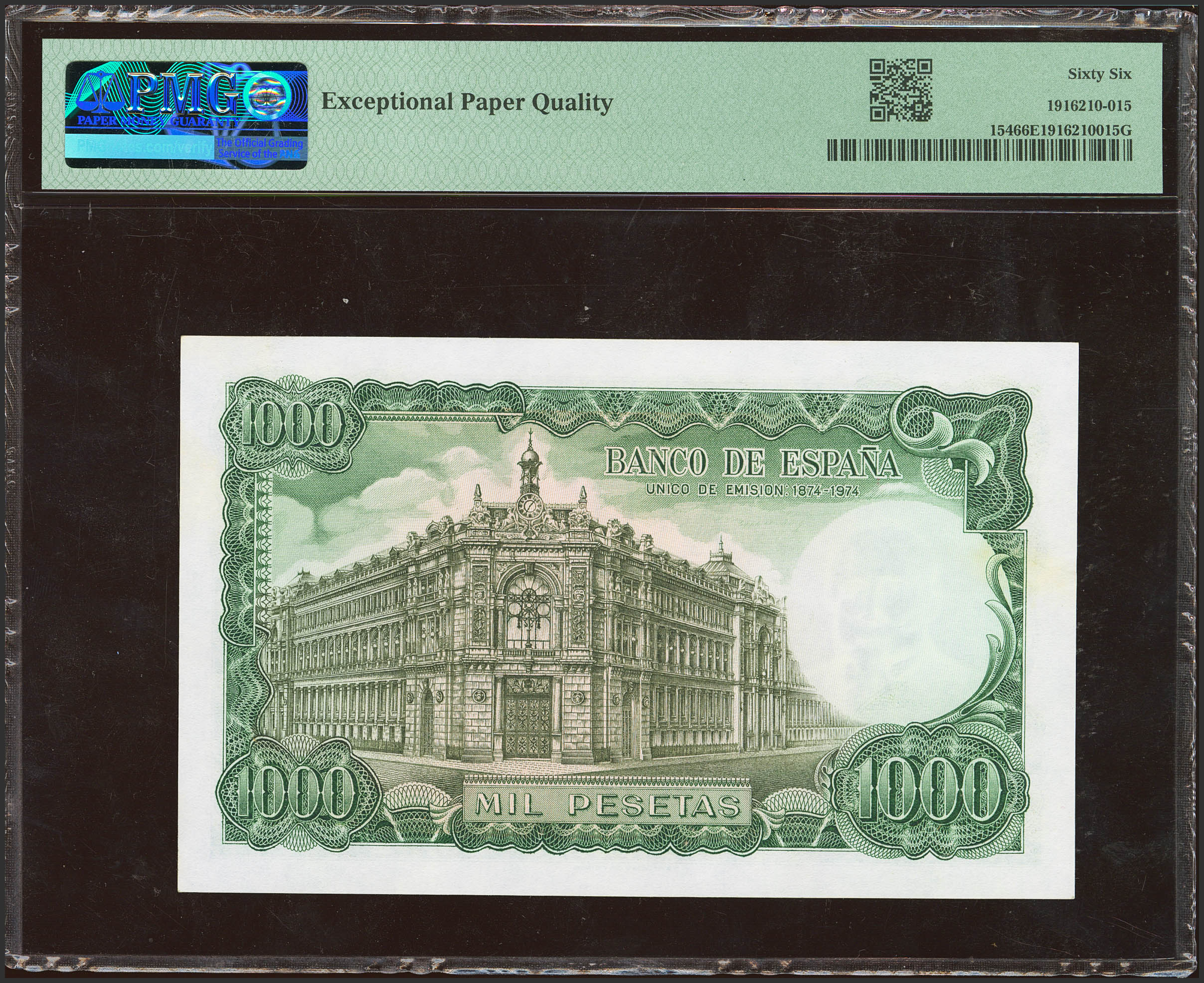 1000 Pesetas. 17 de Septiembre de 1971. Sin serie. (Edifil 2023: 474, Pick: 154). Inusual en esta calidad, apresto original. Encapsulado PMG66EPQ.