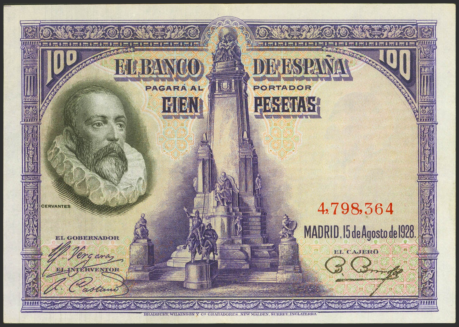 100 Pesetas. 15 de Agosto de 1928. Sin serie. (Edifil 2023: 355). Conserva parte de su apresto original. EBC+.