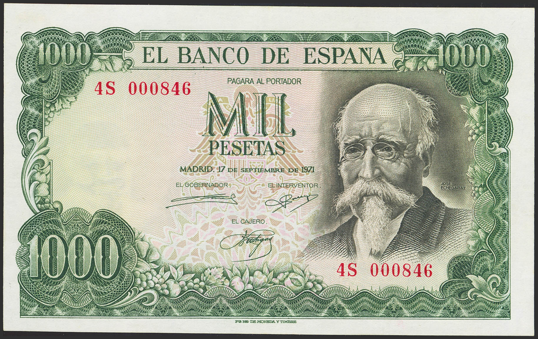 1000 Pesetas. 17 de Septiembre de 1971. Serie 4S y numeración (000846). (Edifil 2023: 474b). Conserva parte del apresto original. EBC.