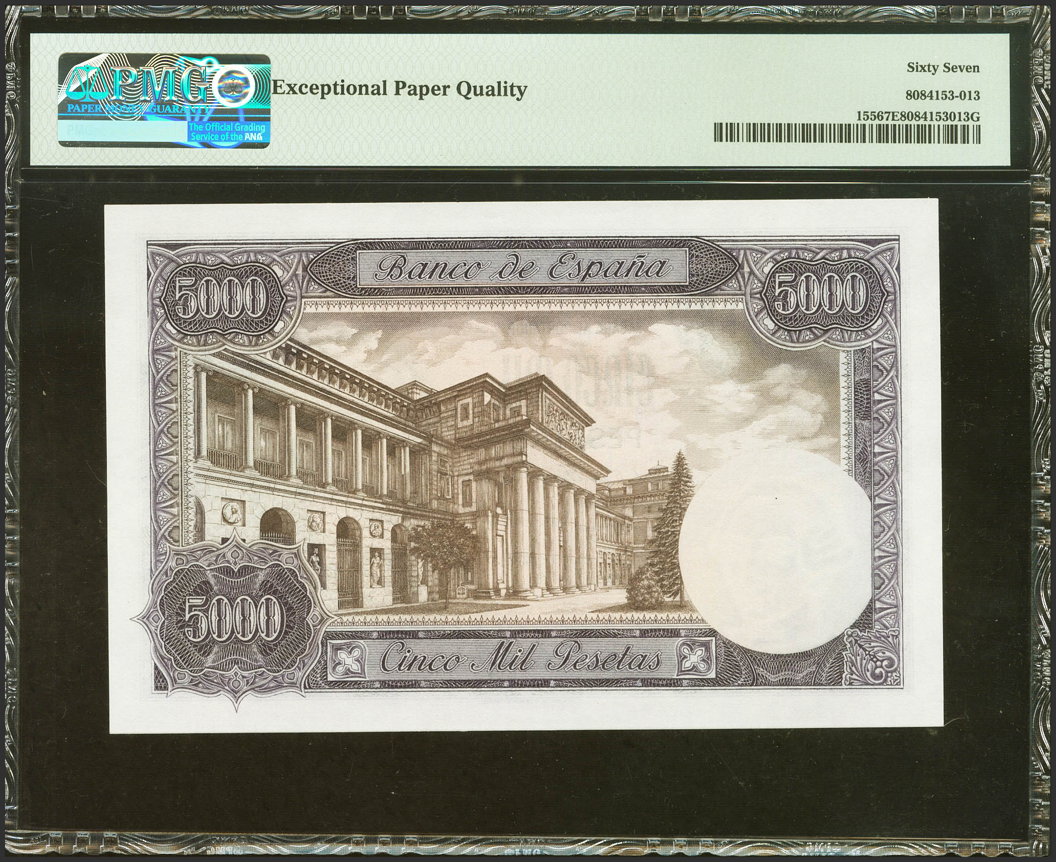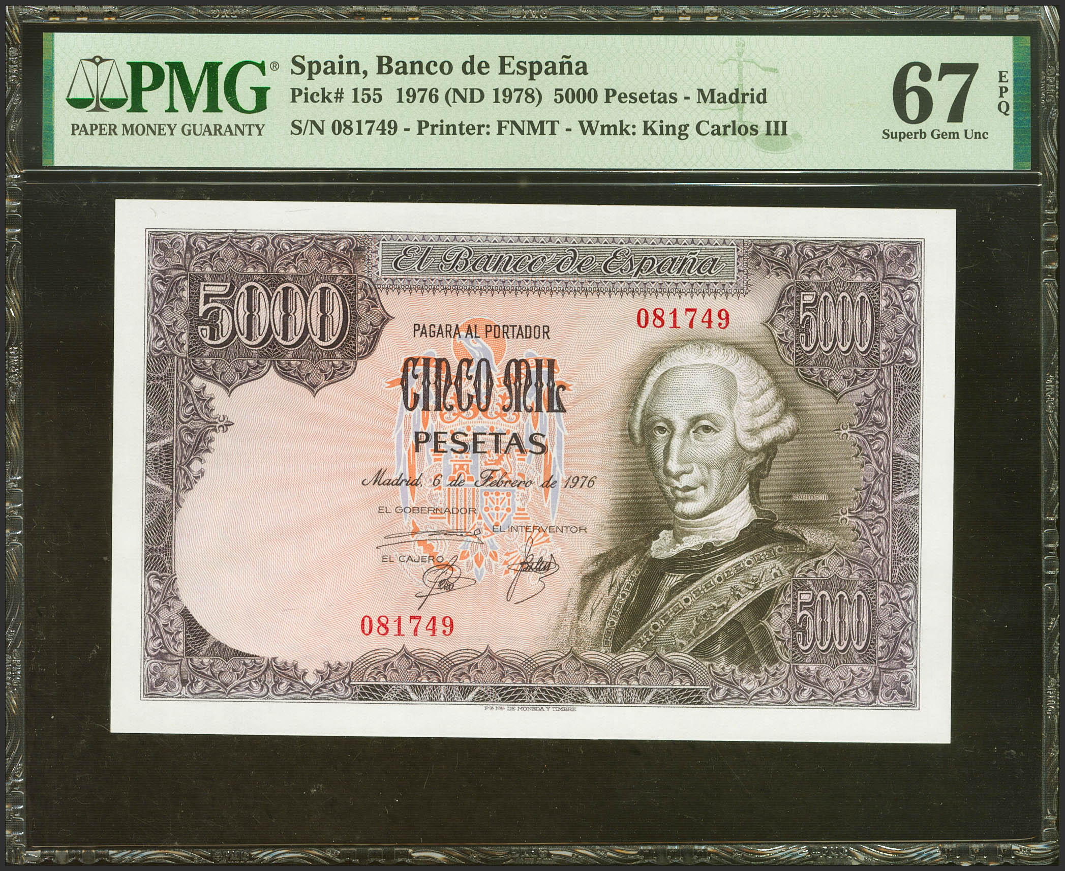5000 Pesetas. 6 de Febrero de 1976. Sin serie. (Edifil 2023: 475, Pick: 155). Inusual en esta excepcional calidad. SC. Encapsulado PMG67EPQ.