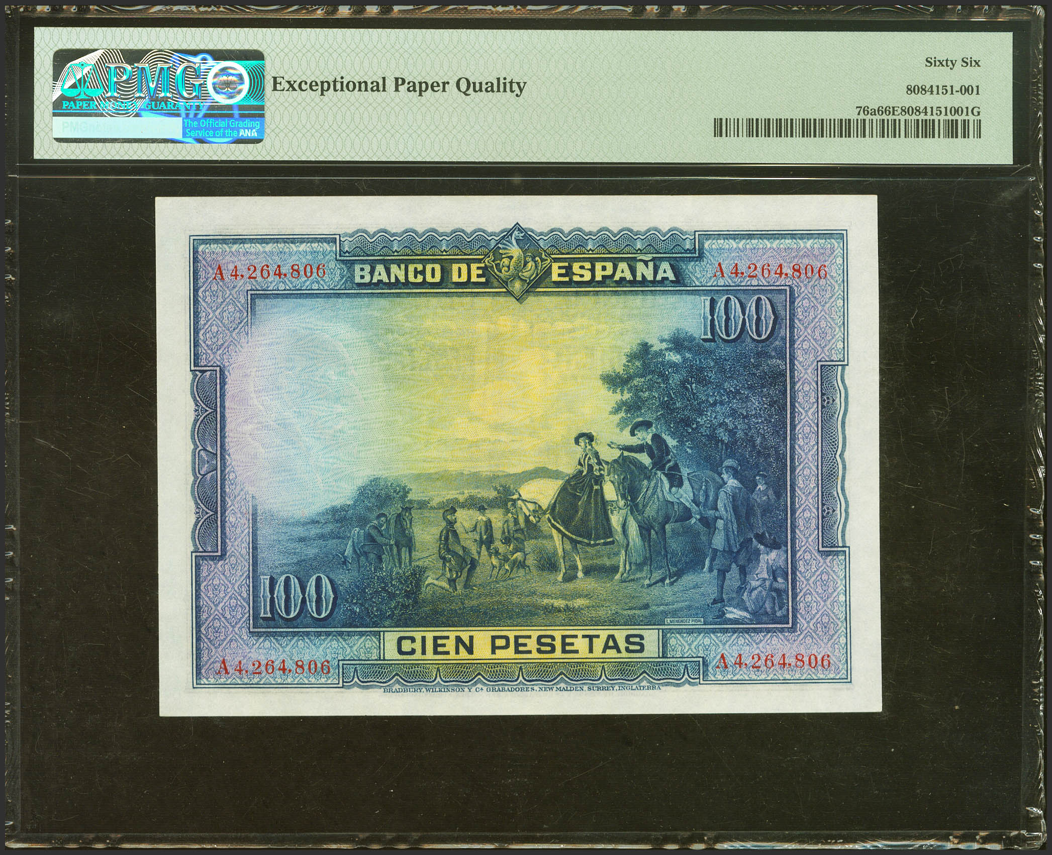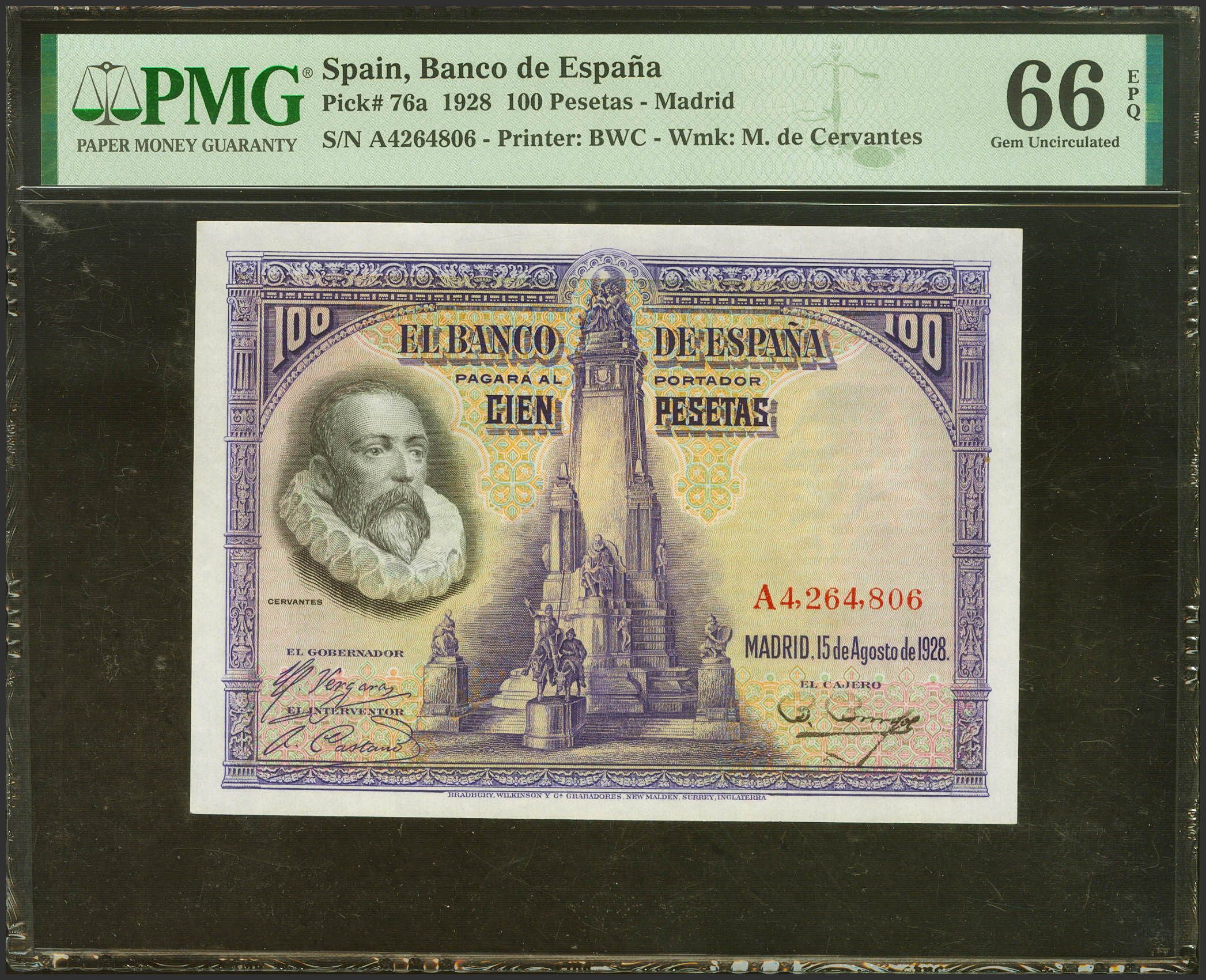 100 Pesetas. 15 de Agosto de 1928. Serie A. (Edifil 2023: 355a, Pick: 76a). Raro en esta excepcional calidad, apresto original. SC. Encapsulado PMG66EPQ.