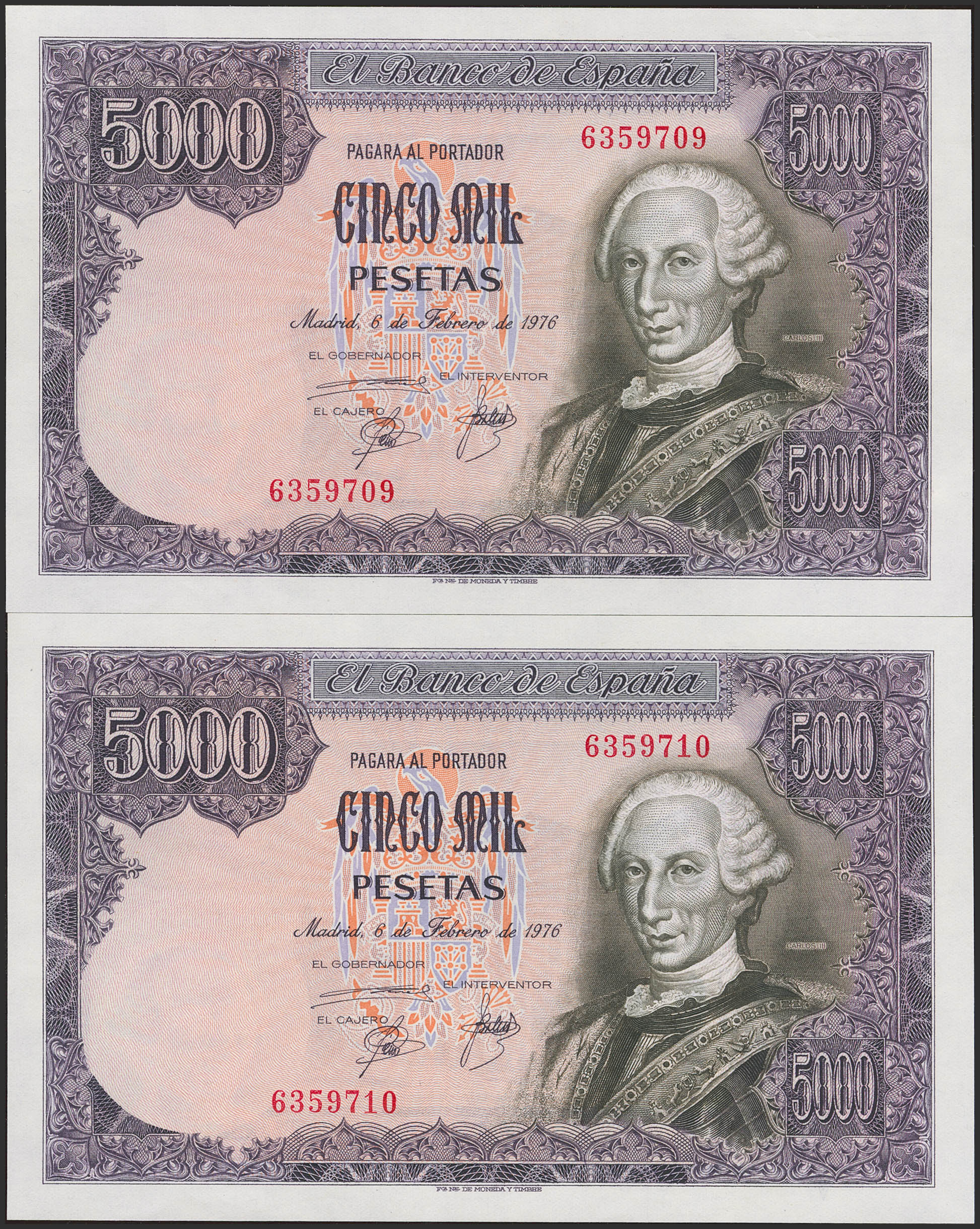 5000 Pesetas. 6 de Febrero de 1976. Pareja correlativa. Sin serie. (Edifil 2023: 475). SC.