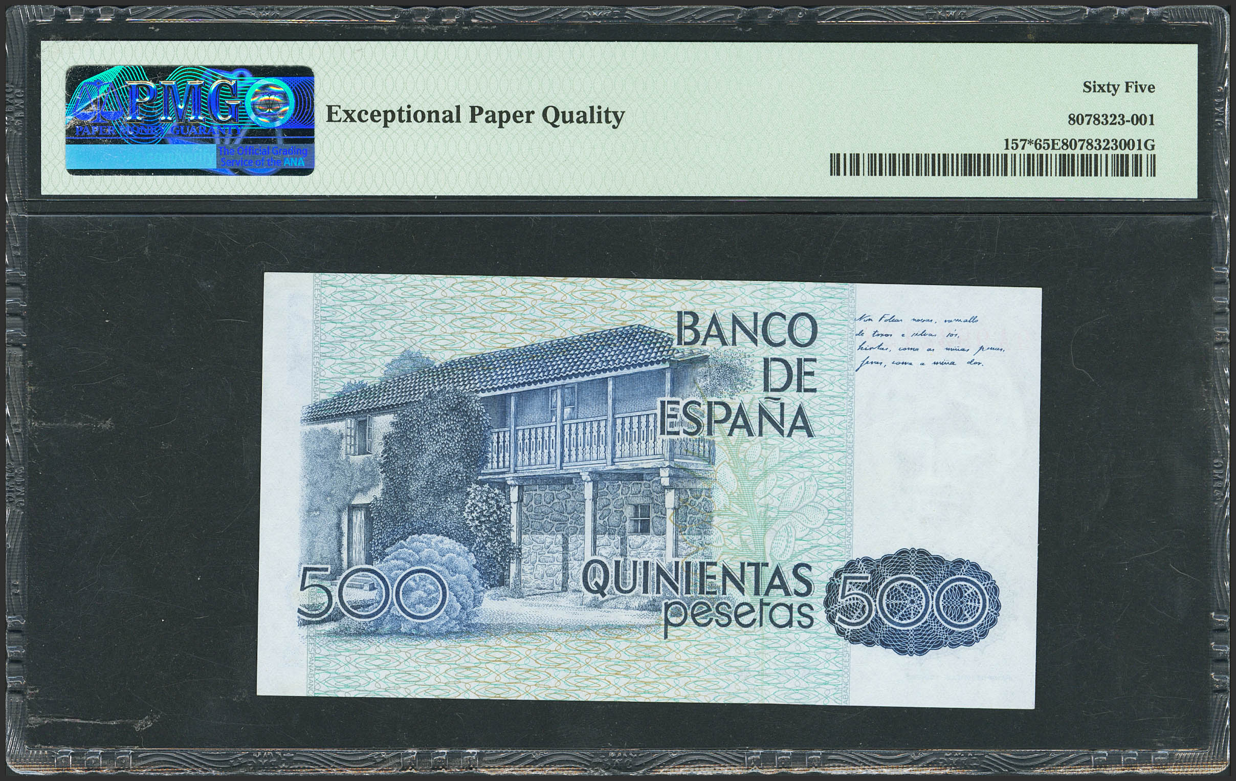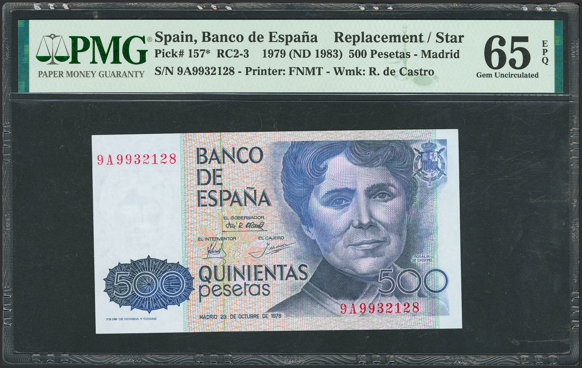 500 Pesetas. 23 de Octubre de 1979. Serie especial 9A. (Edifil 2021: 476b, Pick: 157*). Inusual en esta excepcional calidad y apresto original. SC. Encapsulado PMG65EPQ.