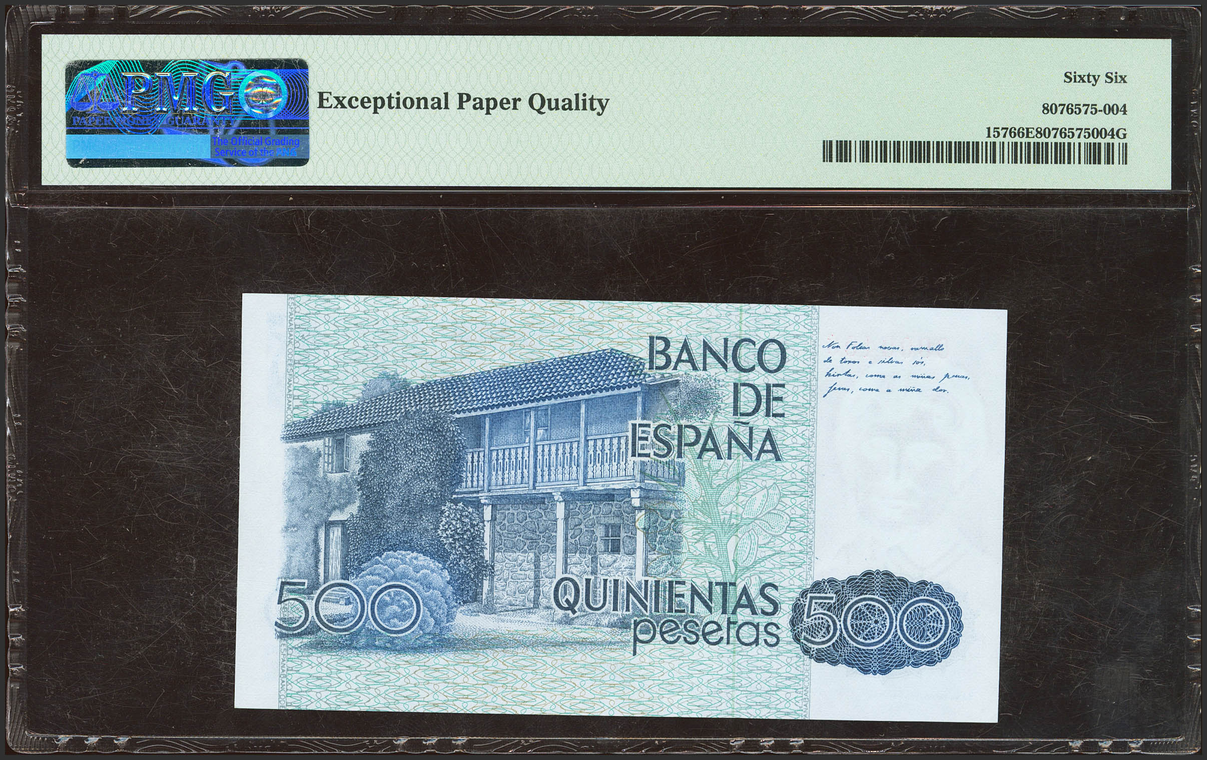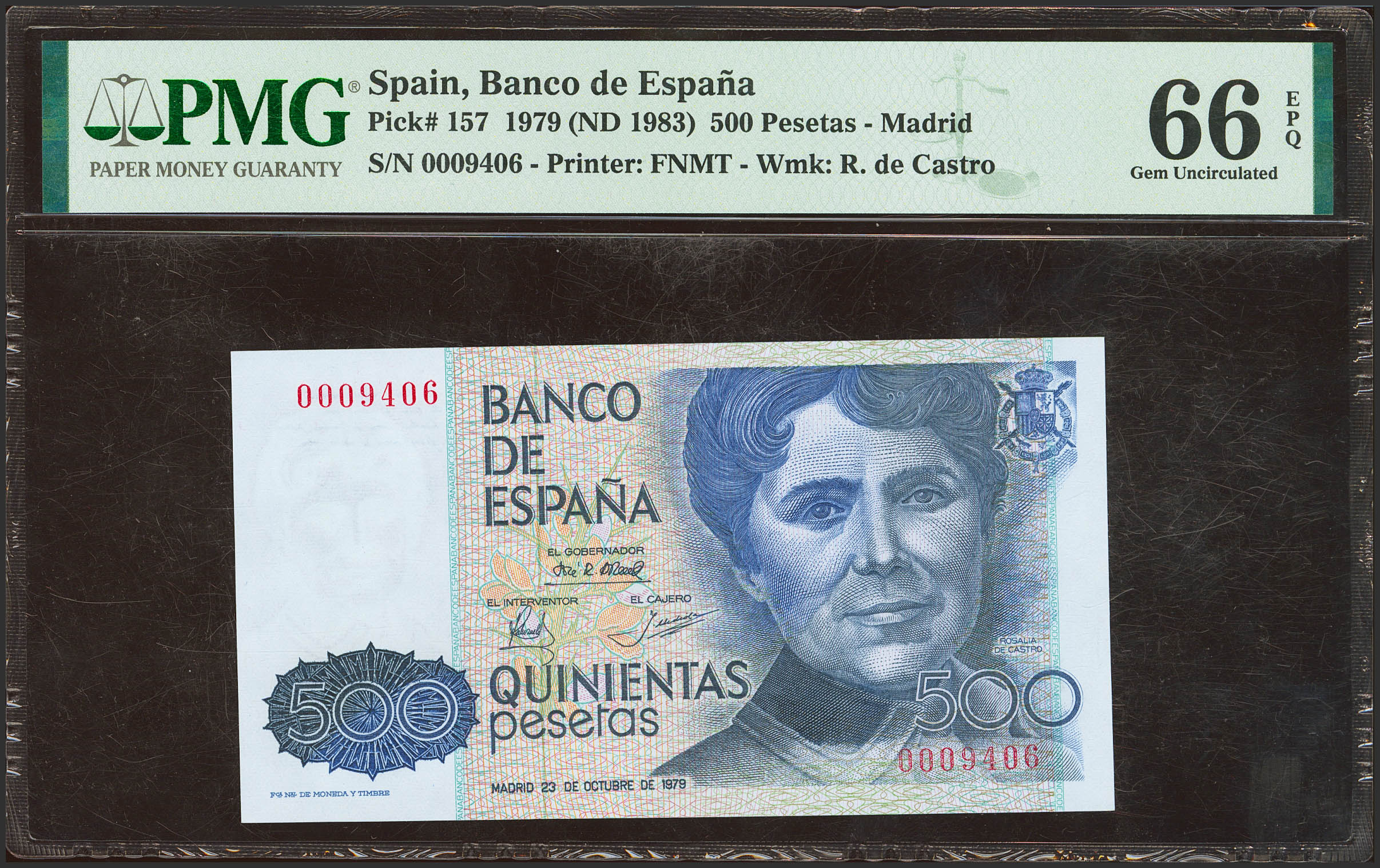 500 Pesetas. 23 de Octubre de 1979. Sin serie y numeración bajísima. (Edifil 2023: 476, Pick: 157). Inusual en esta calidad. SC. Encapsulado PMG66EPQ.