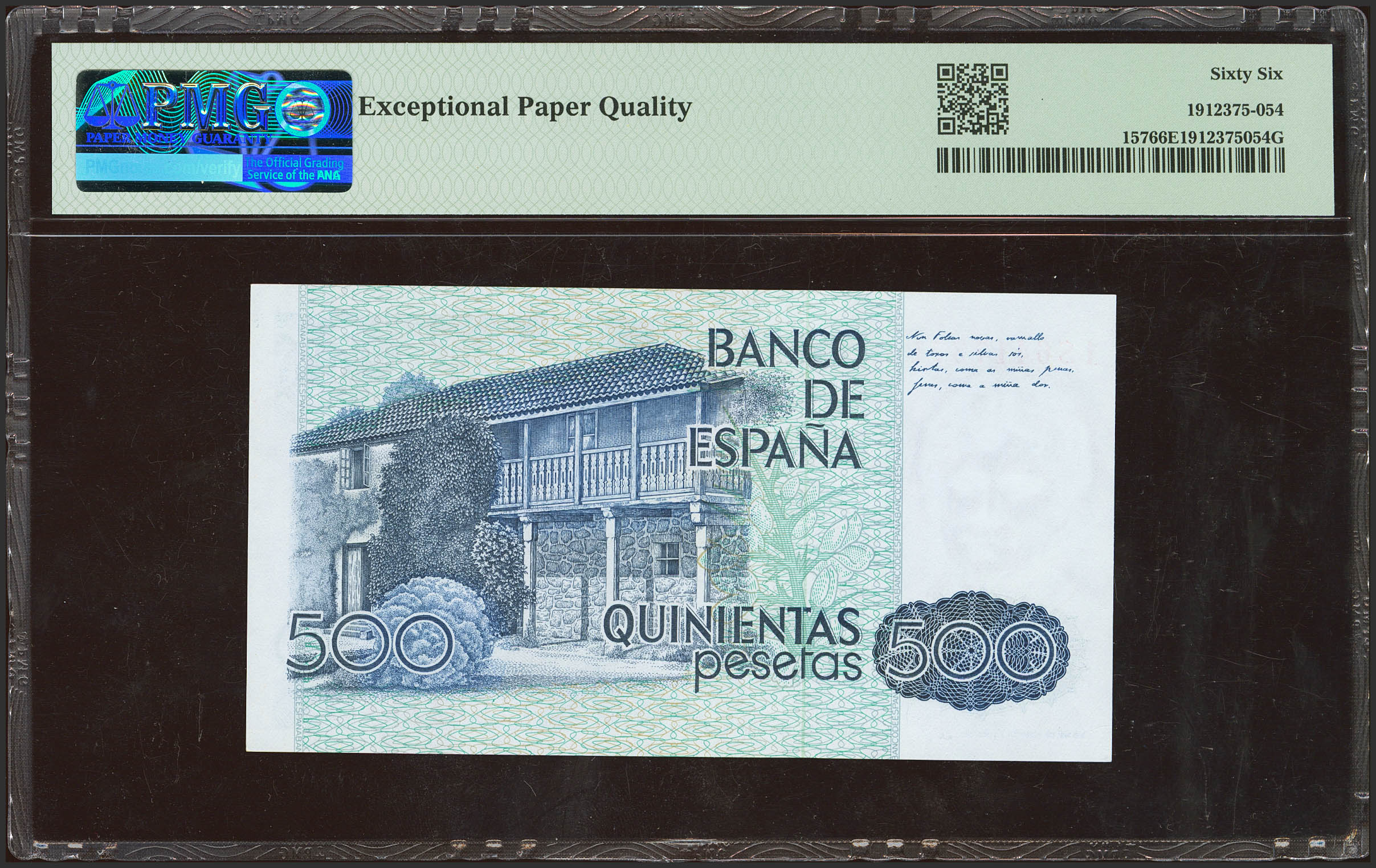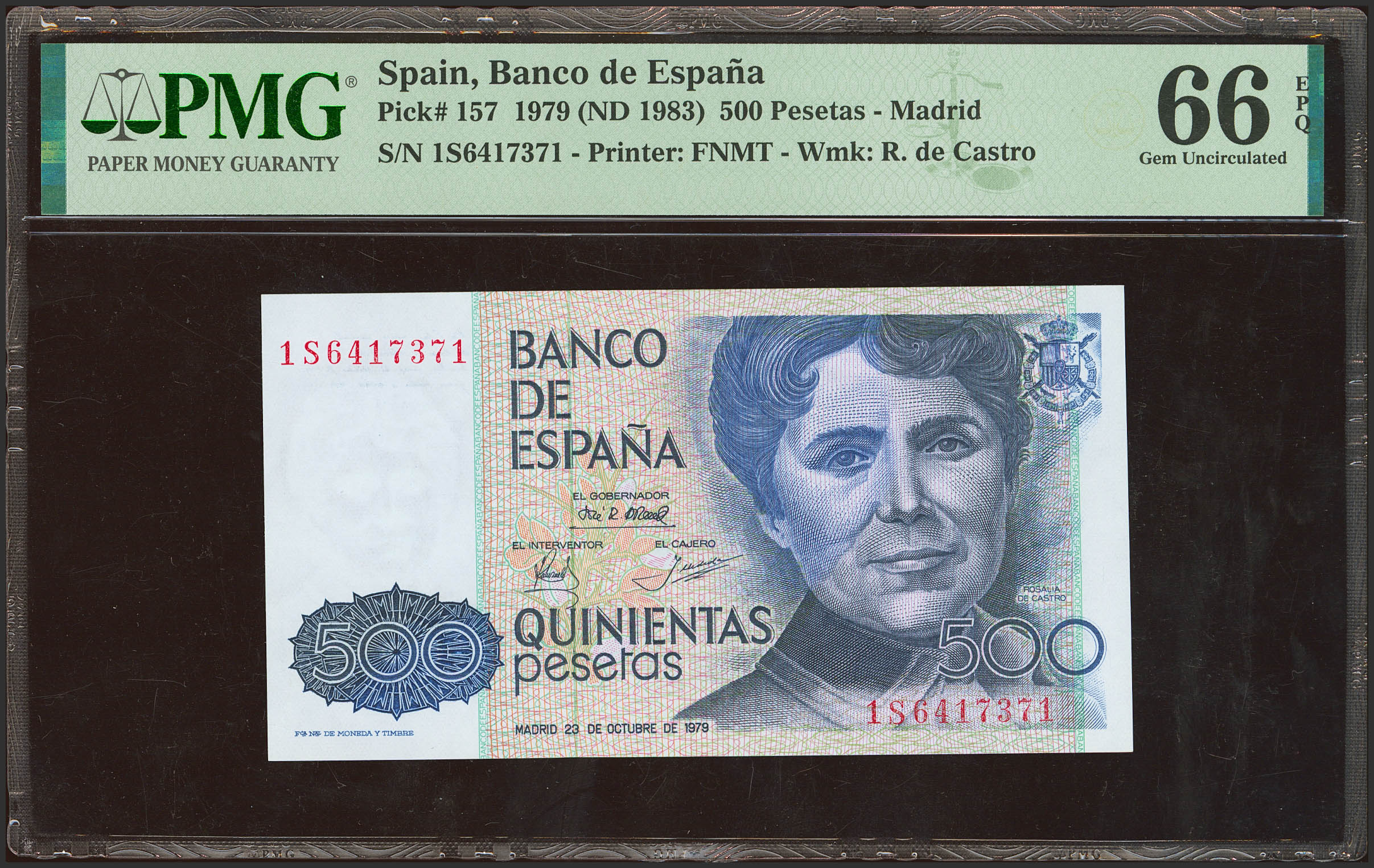 500 Pesetas. 23 de Octubre de 1979. Serie 1S, última serie emitida. (Edifil 2023: 476aa, Pick: 157). Raro en esta excepcional calidad. SC. Encapsulado PMG66EPQ.