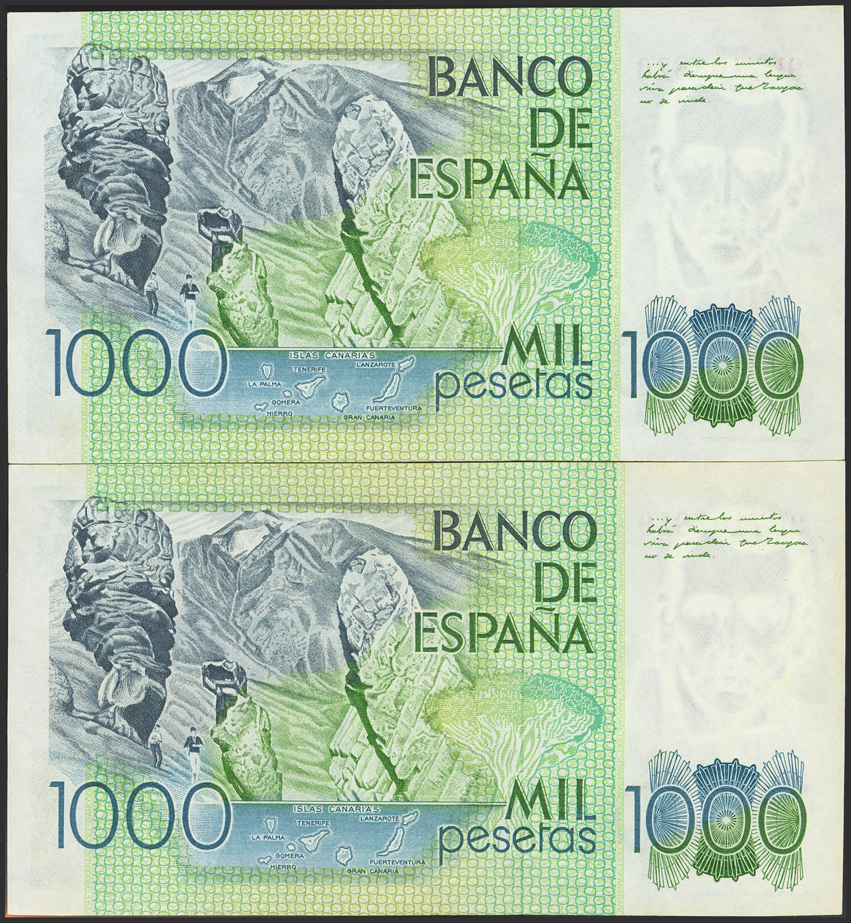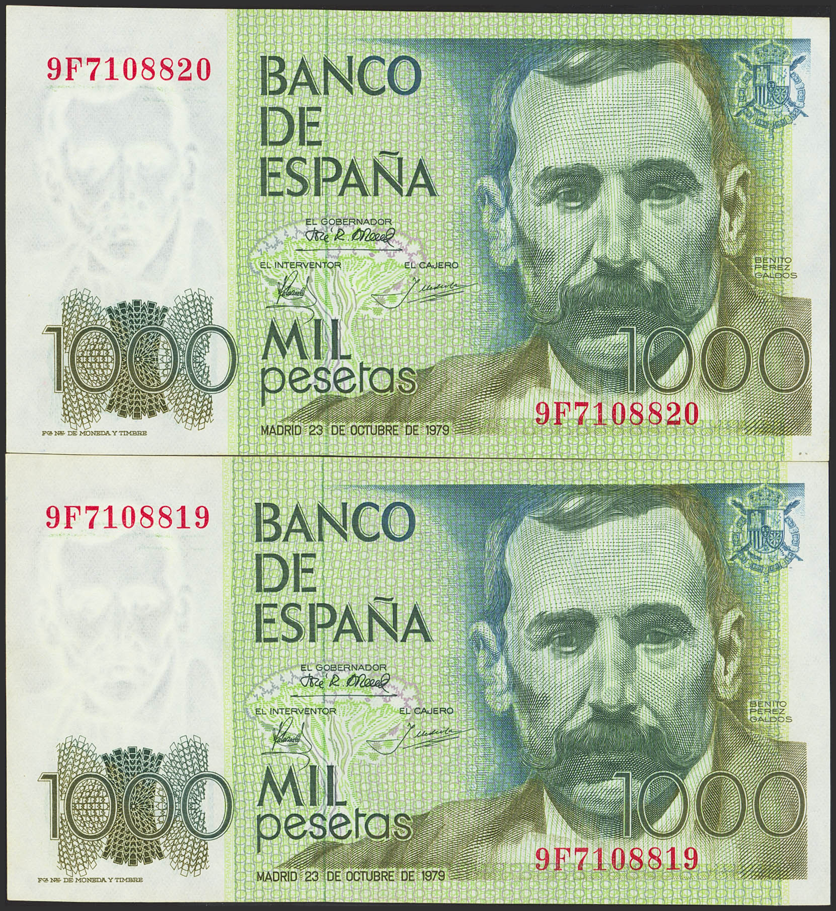 1000 Pesetas. 23 de Octubre de 1979. Pareja correlativa. Serie especial 9F. (Edifil 2023: 477b). Rarísima pareja. EBC+++.