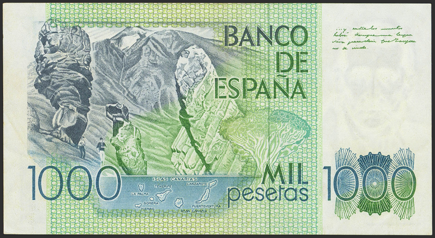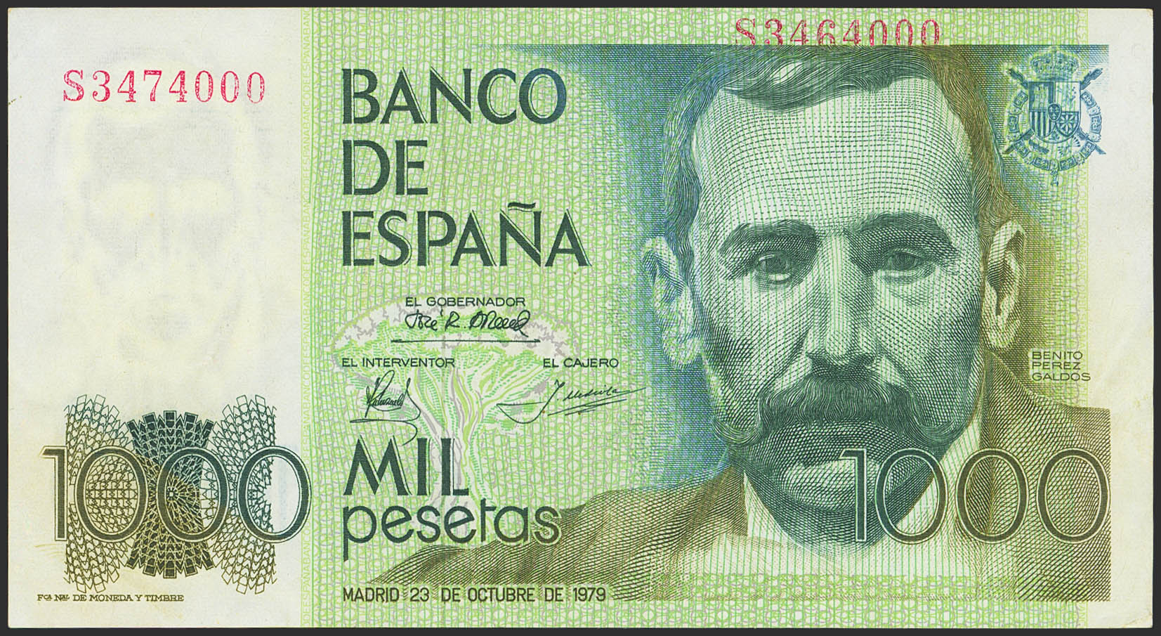 1000 Pesetas. 23 de Octubre de 1979. Serie S, numeración inferior desplazada y no coinciden las dos numeraciones. (Edifil 2023: 477a). Muy raro, para entender mejor la contextualización de este billete recomendamos la obra "Enciclopedia de la Notafilia y Escripofilia Española", de Don José Antonio Castellanos. EBC-.
