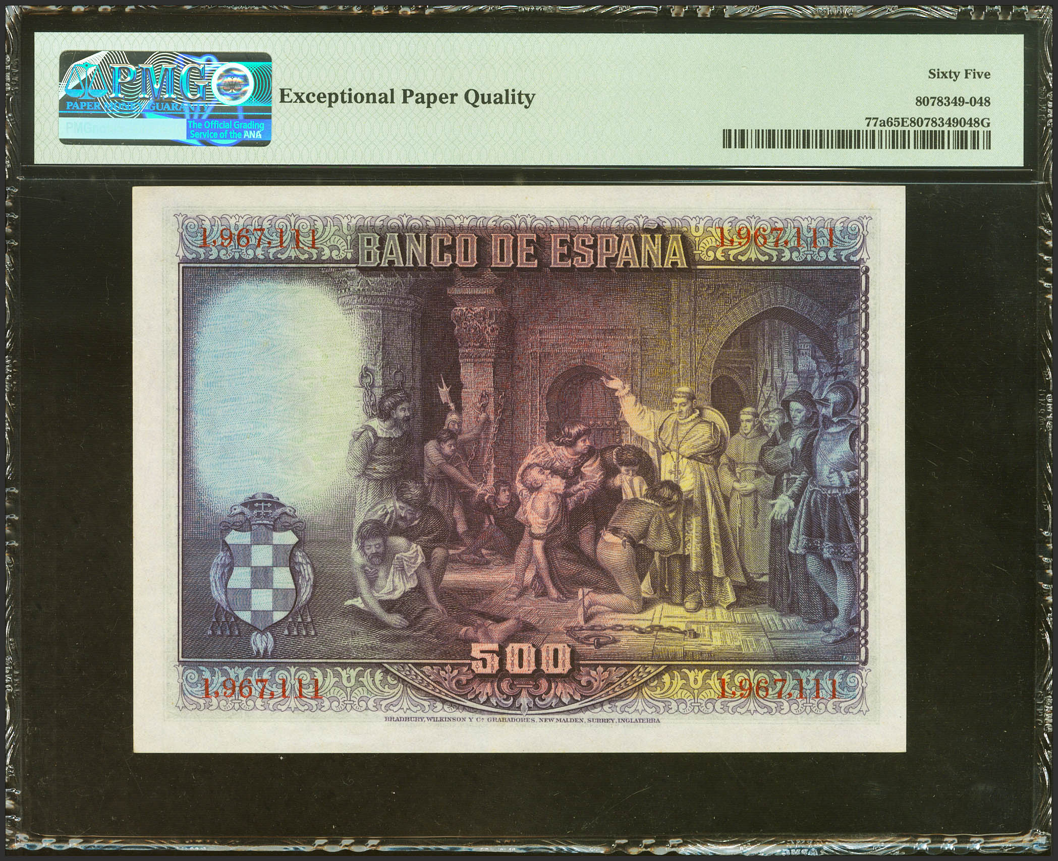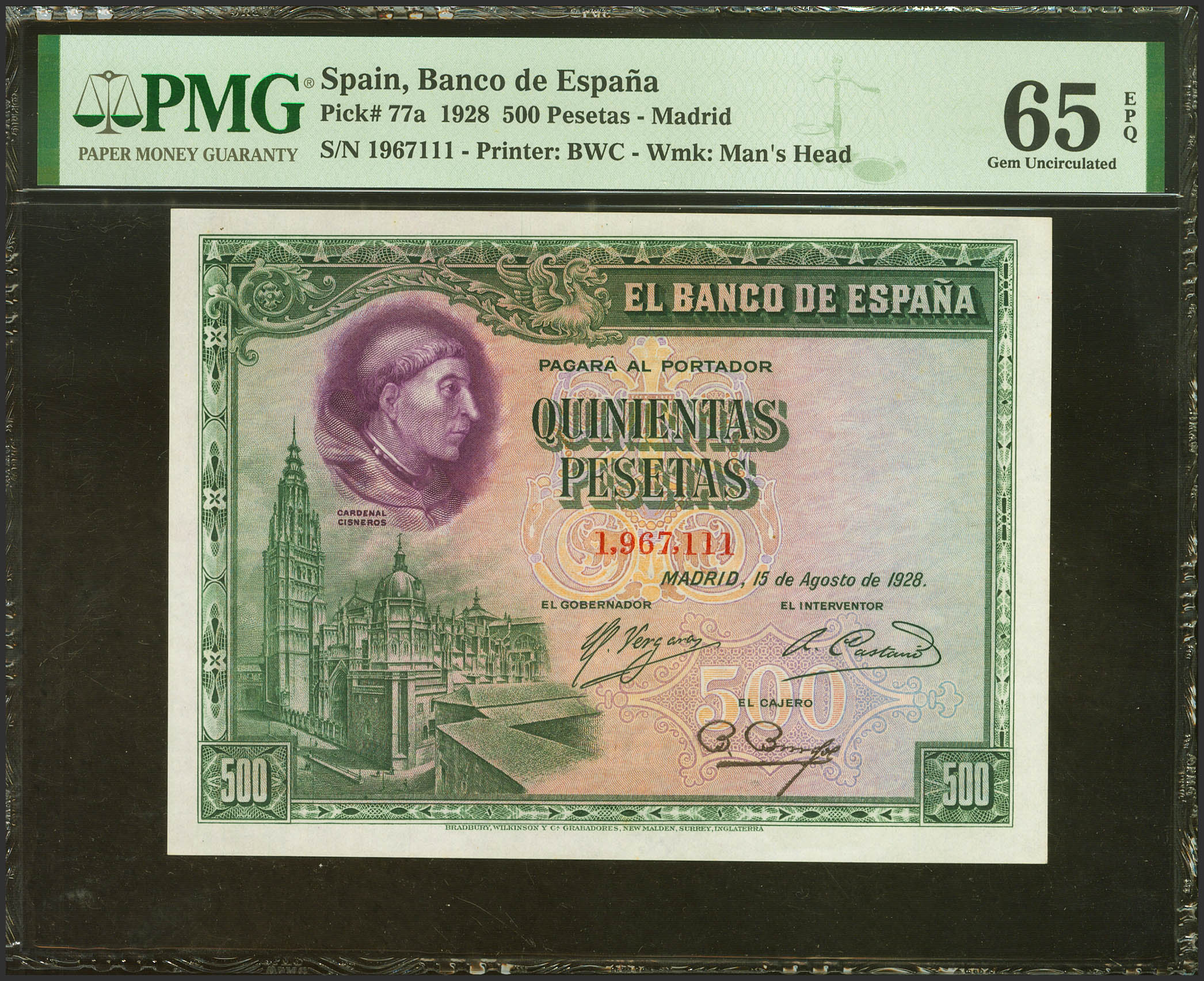 500 Pesetas. 15 de Agosto de 1928. Sin serie. (Edifil 2023: 356, Pick: 77a). Apresto original. SC. Encapsulado PMG65EPQ.