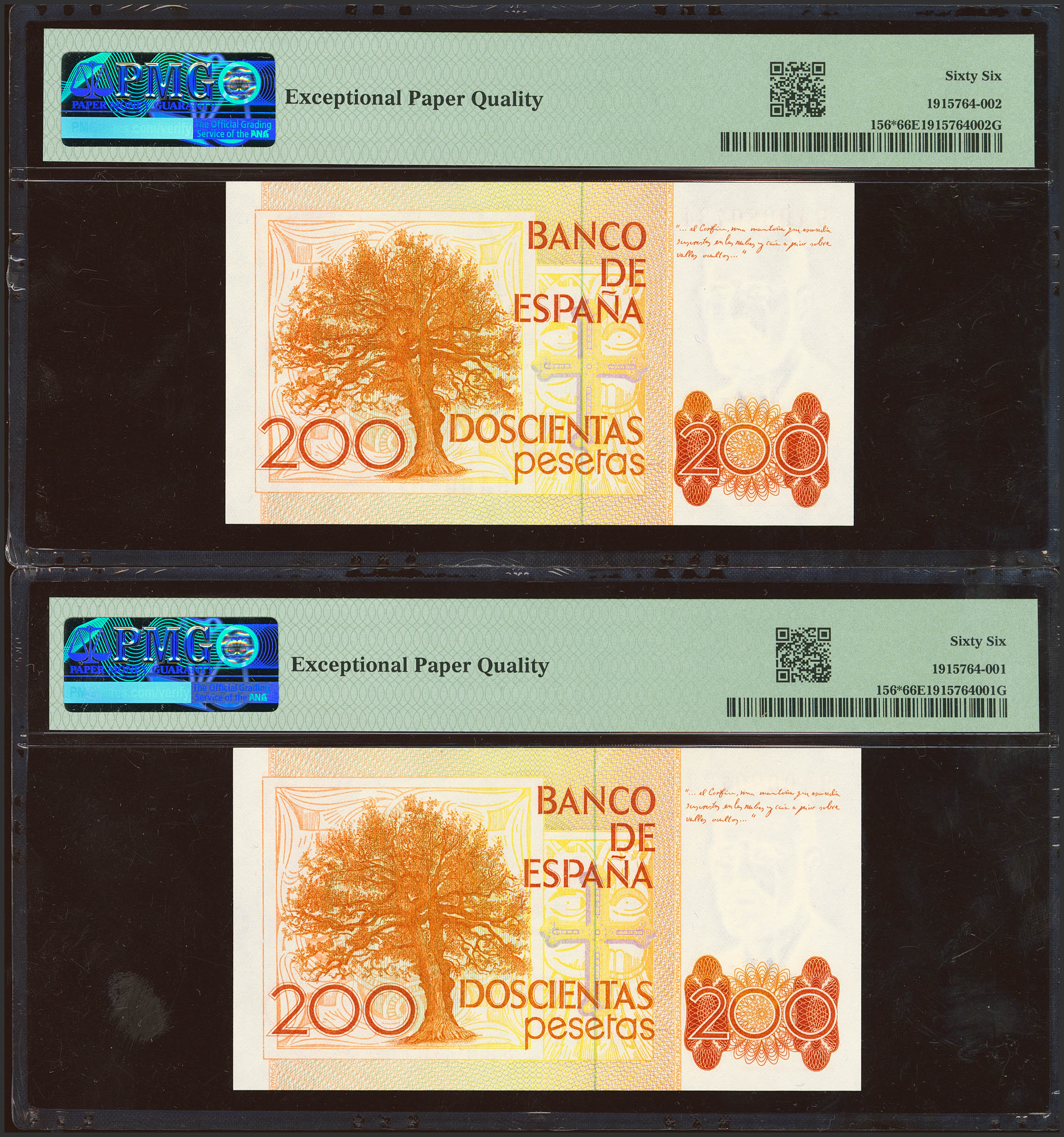 200 Pesetas. 16 de Septiembre de 1980. Pareja correlativa. Serie especial 9A. (Edifil 2021: 480b, Pick: 156*). SC. Encapsulados PMG66EPQ, ambos.